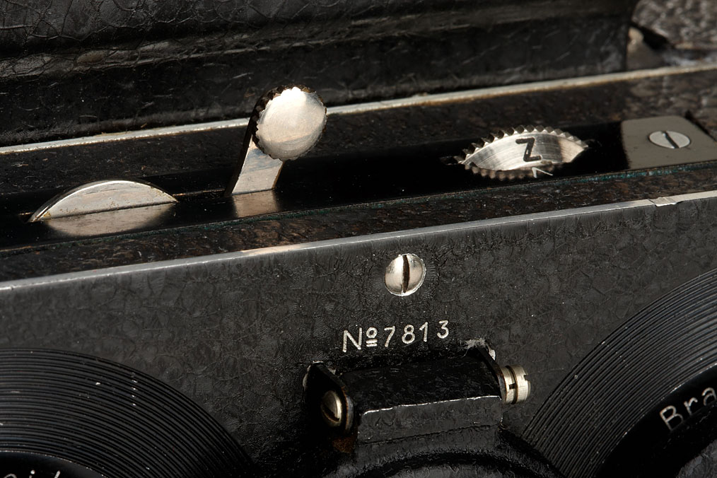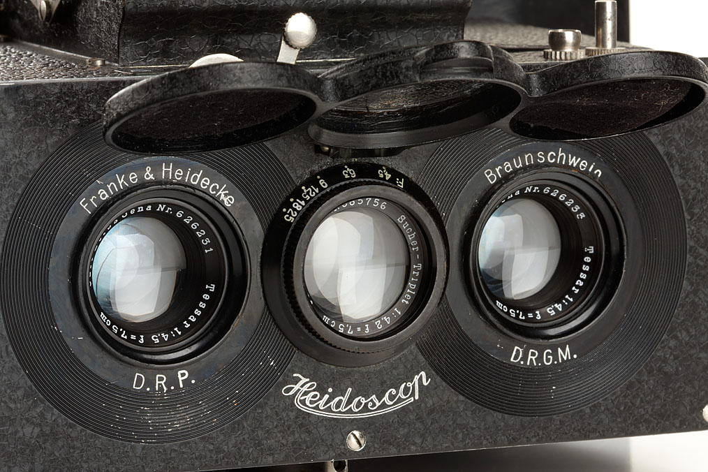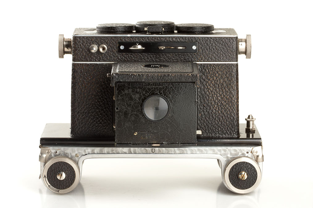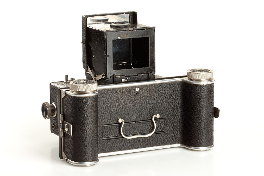 6x13cm stereo camera, second model with a pair of Tessar 4.5/7.5cm nos.626231/33 taking lenses, attached lens cap, 120 roll film back