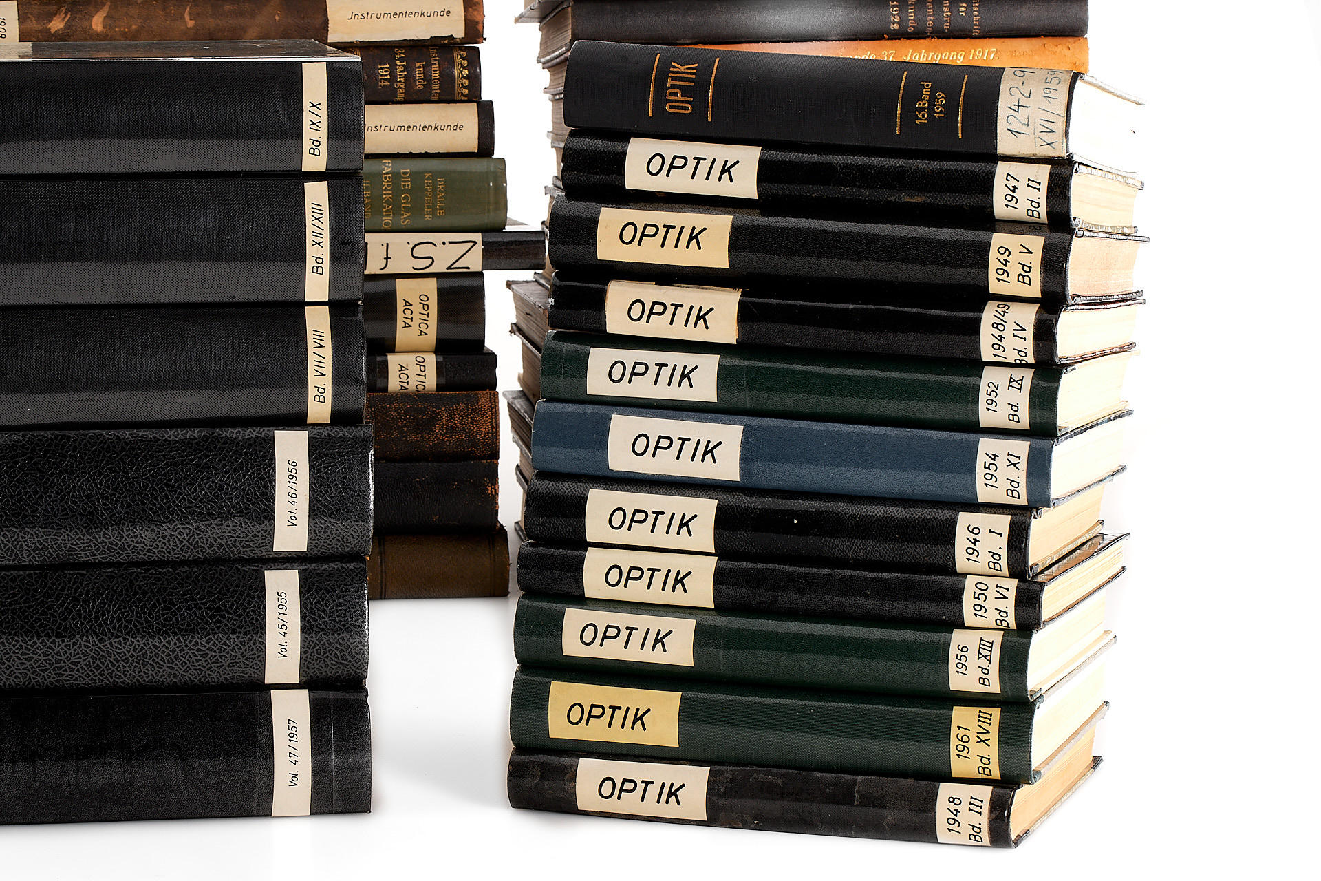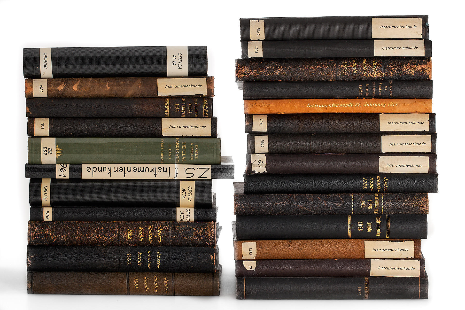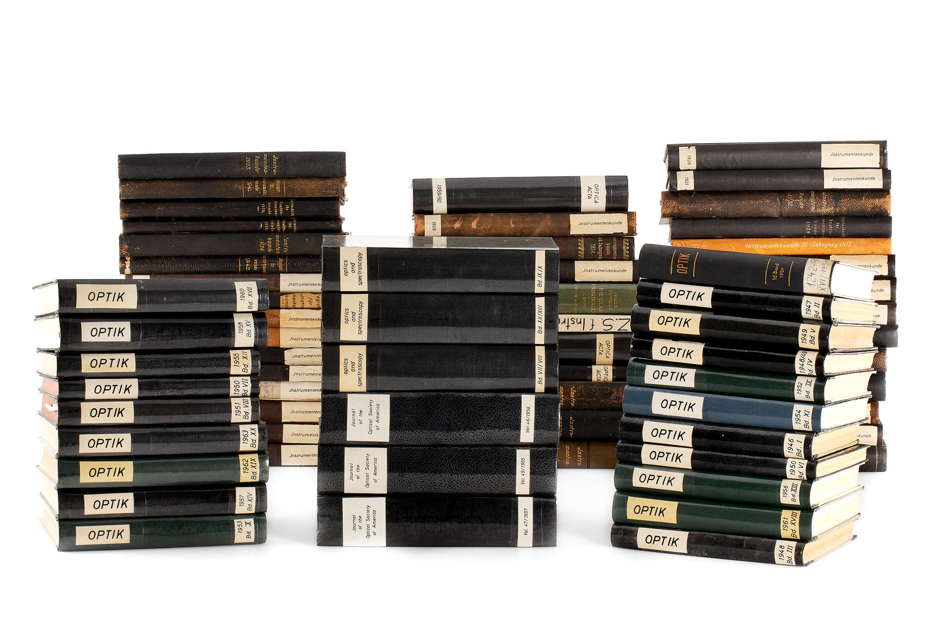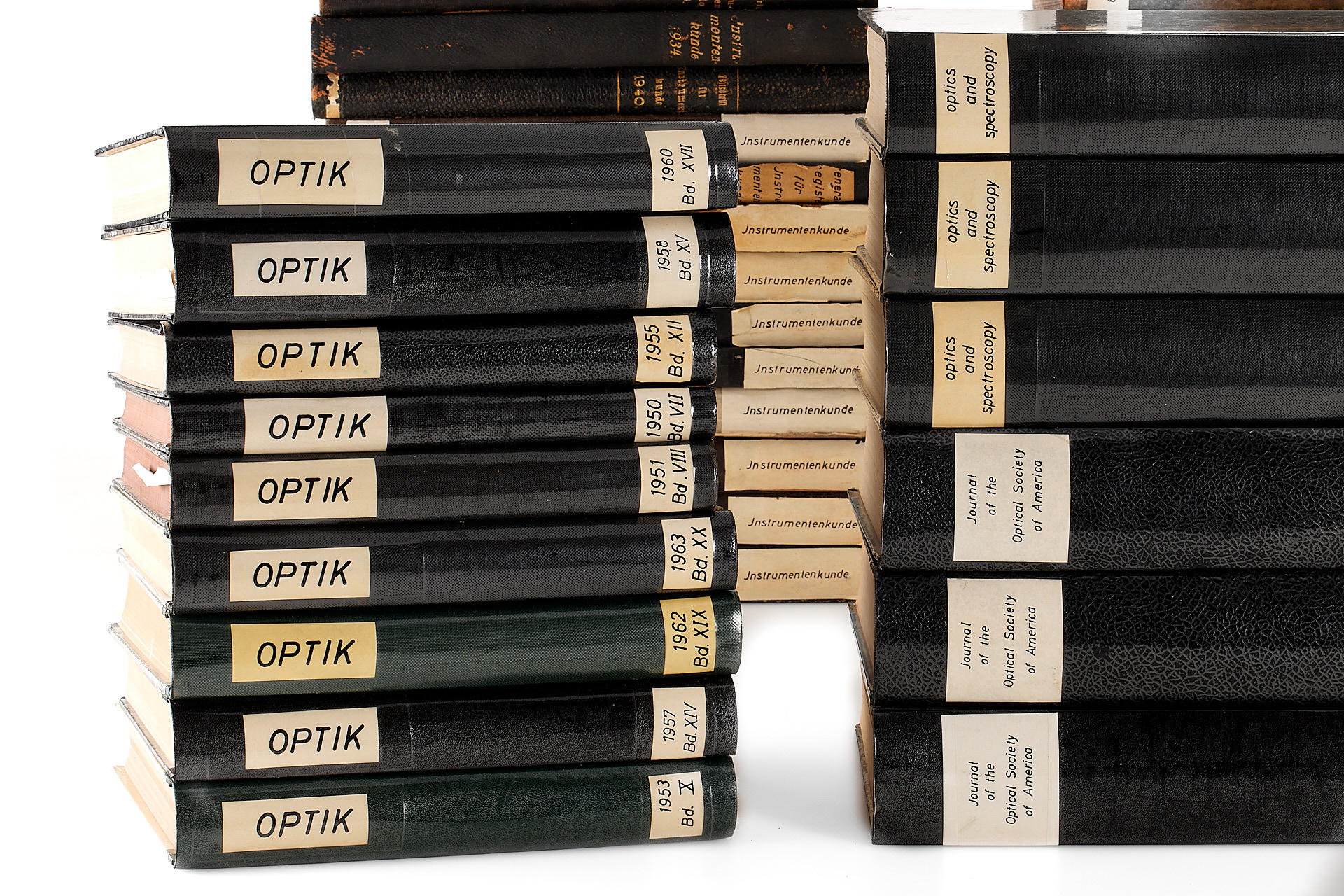 Impressive collection of 67 scientific books from 1901 to 1963 about optic, scientific instruments and glass manufacturing, most in German, some in English, ex-Rollei and Voigtländer collection with respective stamps and inventory number, all in very good condition, hardcover from ca. 23 x 17.5cm to 27 x 21cm