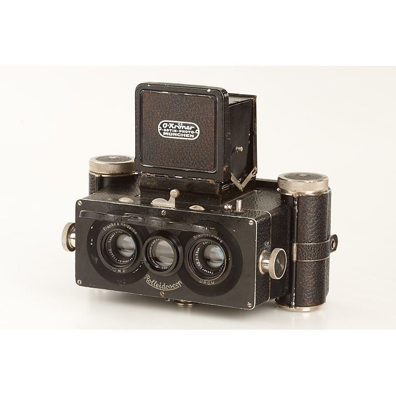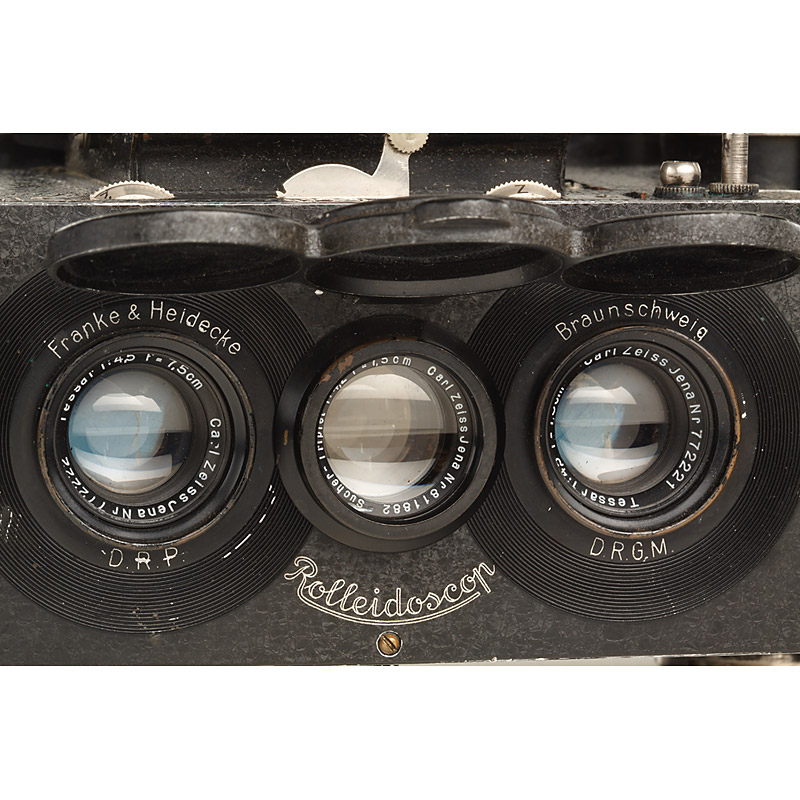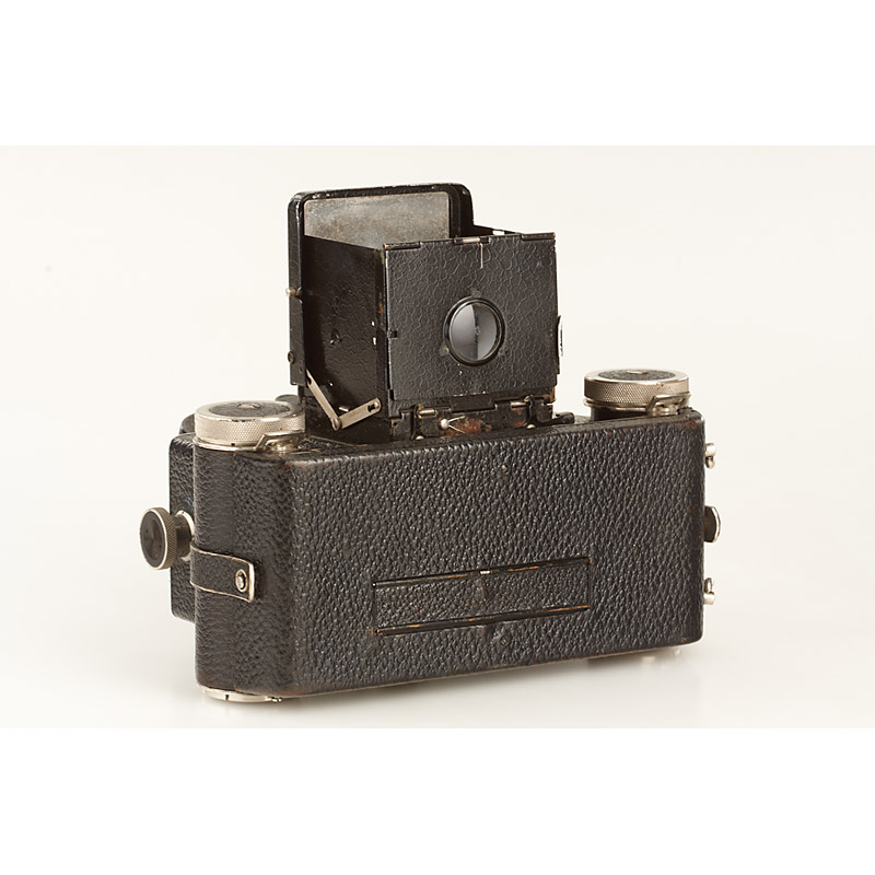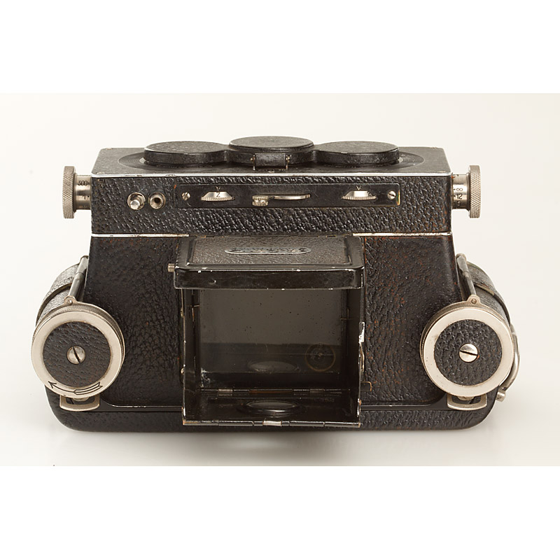 6x13cm, stereo camera for roll film 120, third model (production approx. 400 cameras) in good original condition, Tessar 4.5/7.5cm lenses nos.772221/2, hinged cap, original case