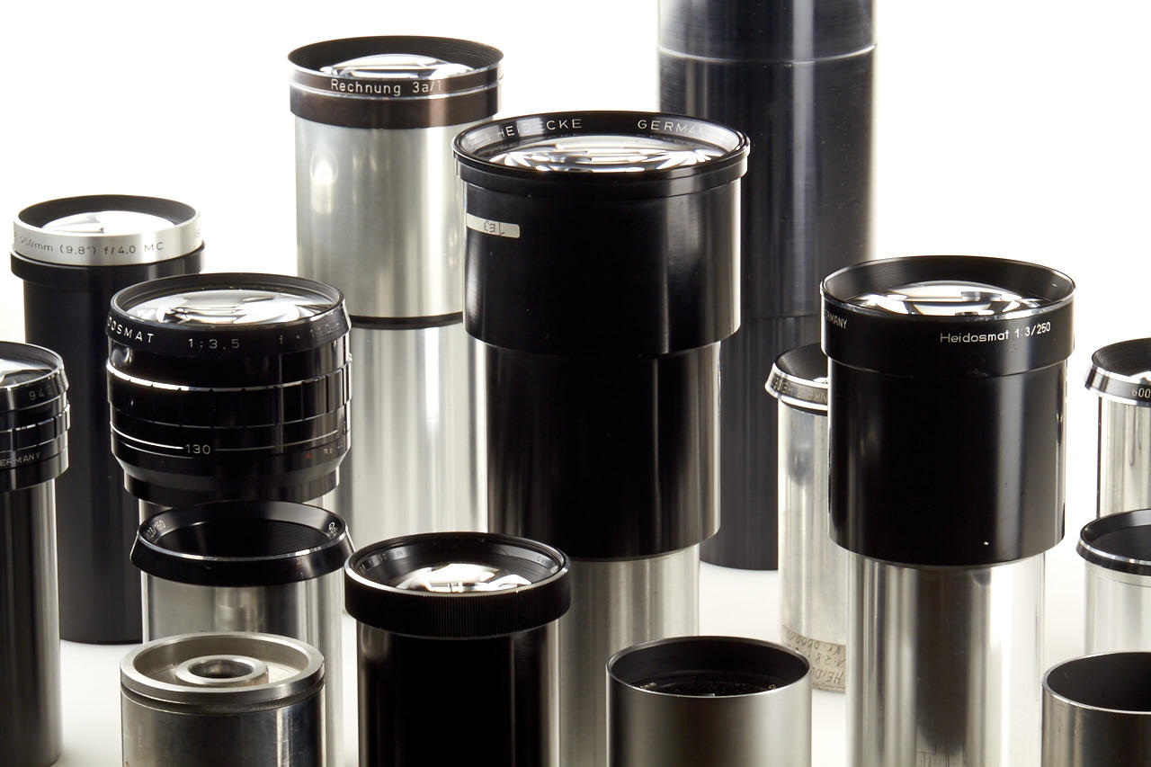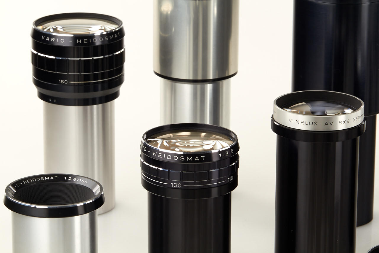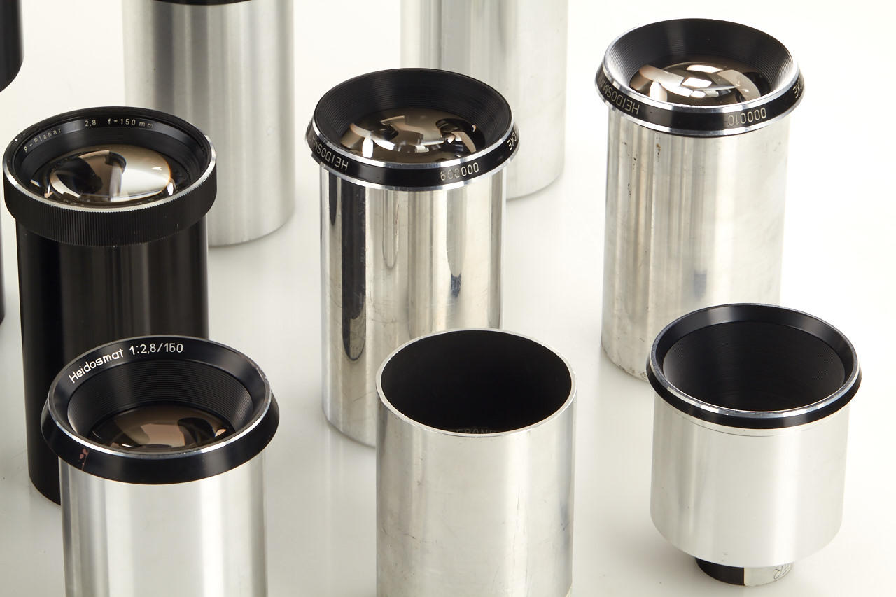 lot of 17 prototype and test projection lenses, all from the Rollei company inventory, all in the same 74mm mount: (1-2) two Heidosmat 2.8/160mm lenses no.000009 and 000010, (3) Heidosmat 2.8/150mm, (4) Heidosmat 2.8/110mm no.70010, (5) Heidosmat 4/400mm no.378023, (6) Heidosmat 3/250mm no.90006, (7) Vario-Heidosmat 3.5/110-160mm no.9421882, (8) Vario-Heidosmat 3.5/110-160mm no.377690, (9) S-Heidosmat made by Isco 2.8/150mm, (10) Isco Cinelux-AV 6x6 4/250mm, (11) Isco Projar 4/400mm Rb 380 Nr.2, (12) Carl Zeiss Distagon 4/50mm no.4687856, (13) Carl Zeiss P-Planar 2.8/150mm no.108399V5/1, (14) Schneider Proclar 2.8/45mm no.7844839, (15-17) two unmarked lenses and one engraved 'Rechnung 3a/1', all in good to near mint condition, interesting collection of Rollei history