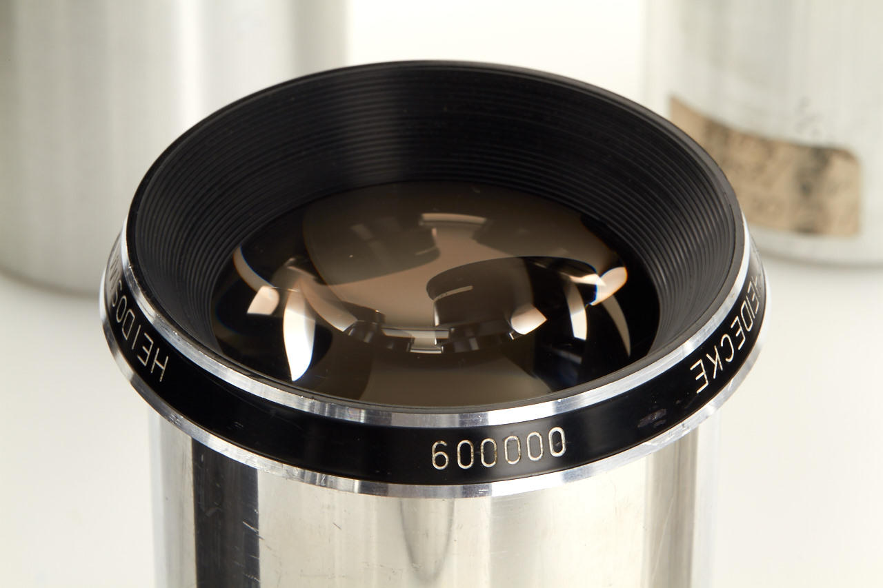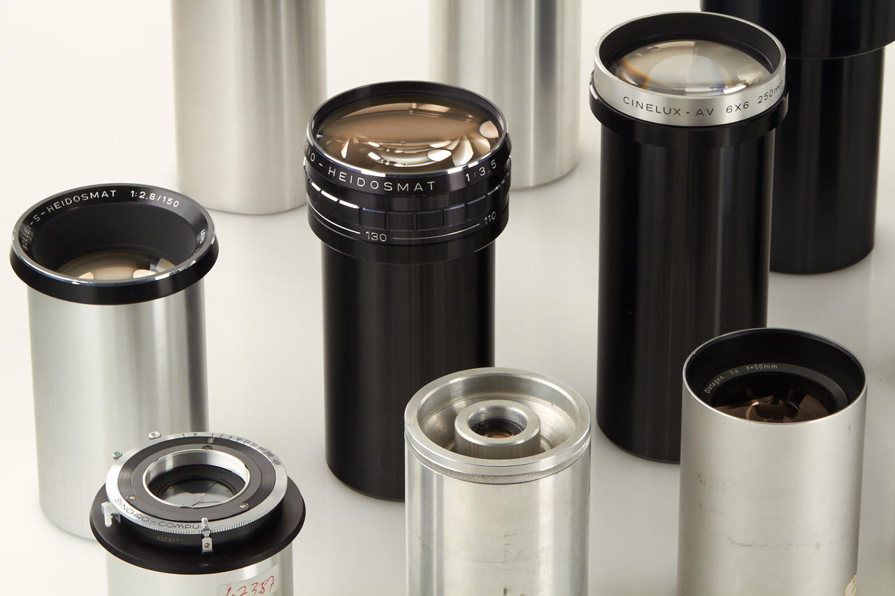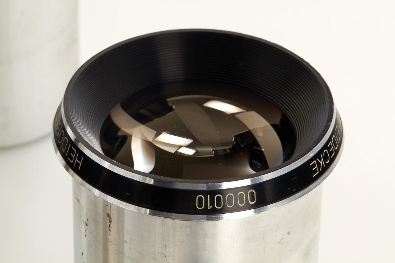lot of 17 prototype and test projection lenses, all from the Rollei company inventory, all in the same 74mm mount: (1-2) two Heidosmat 2.8/160mm lenses no.000009 and 000010, (3) Heidosmat 2.8/150mm, (4) Heidosmat 2.8/110mm no.70010, (5) Heidosmat 4/400mm no.378023, (6) Heidosmat 3/250mm no.90006, (7) Vario-Heidosmat 3.5/110-160mm no.9421882, (8) Vario-Heidosmat 3.5/110-160mm no.377690, (9) S-Heidosmat made by Isco 2.8/150mm, (10) Isco Cinelux-AV 6x6 4/250mm, (11) Isco Projar 4/400mm Rb 380 Nr.2, (12) Carl Zeiss Distagon 4/50mm no.4687856, (13) Carl Zeiss P-Planar 2.8/150mm no.108399V5/1, (14) Schneider Proclar 2.8/45mm no.7844839, (15-17) two unmarked lenses and one engraved 'Rechnung 3a/1', all in good to near mint condition, interesting collection of Rollei history