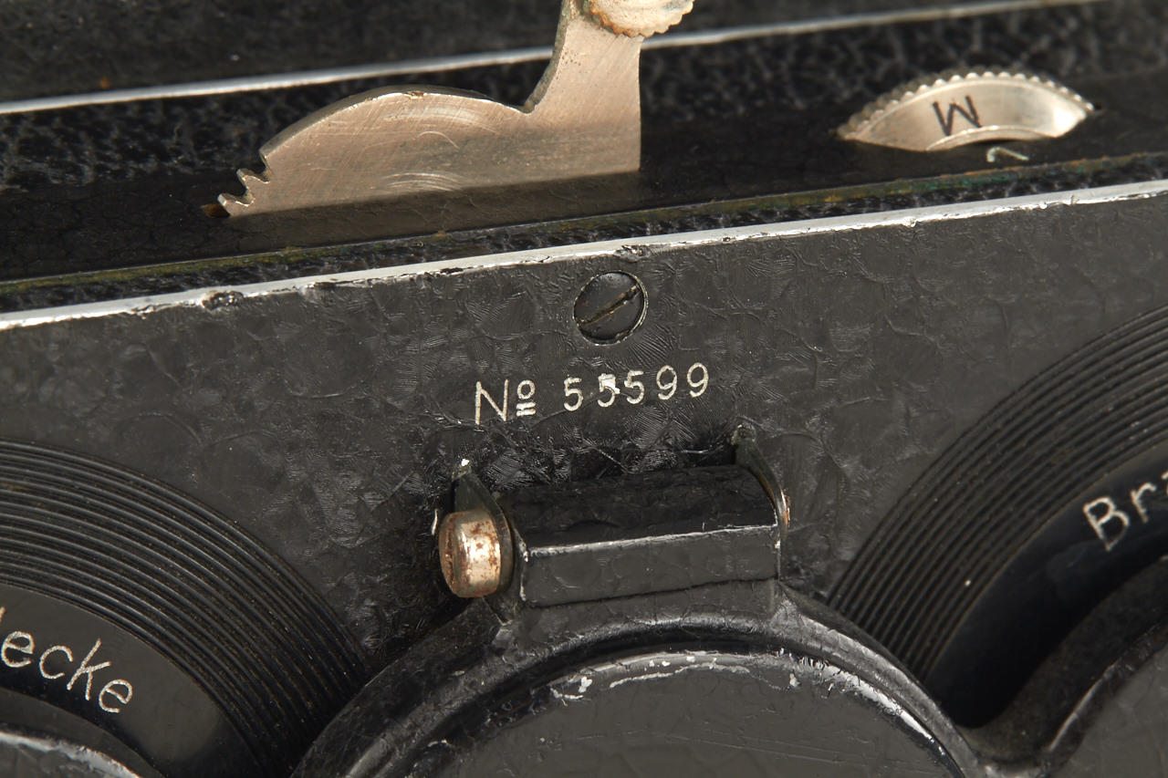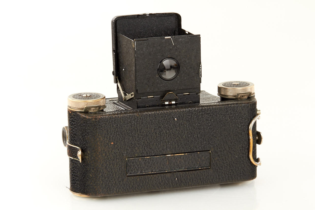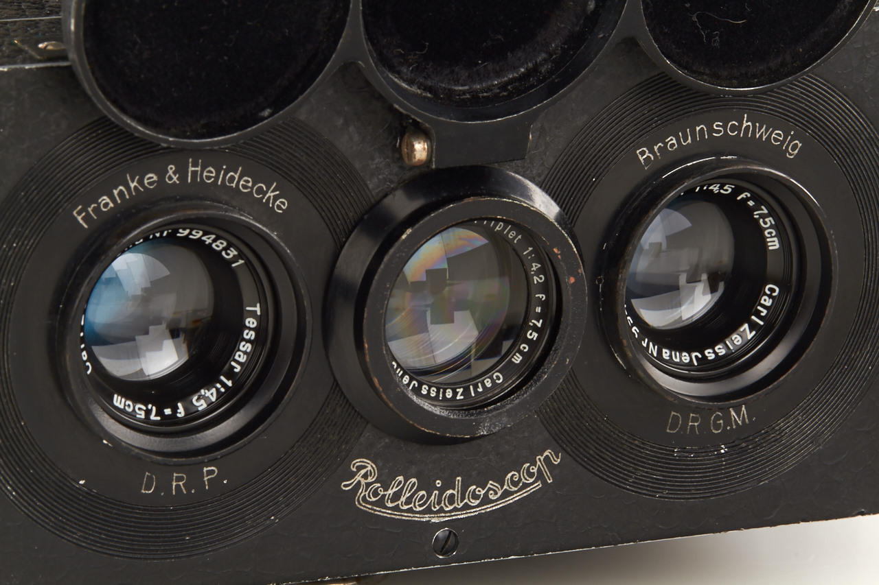 rare last version Rolleidoscop 6x13cm for roll film 120 in very fine condition, Tessar 4.5/7.5cm lenses nos. 994831/2, hinged cap, in very good and working condition (synchronised)