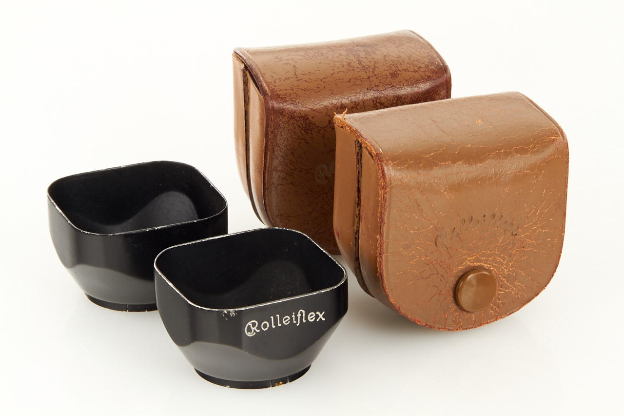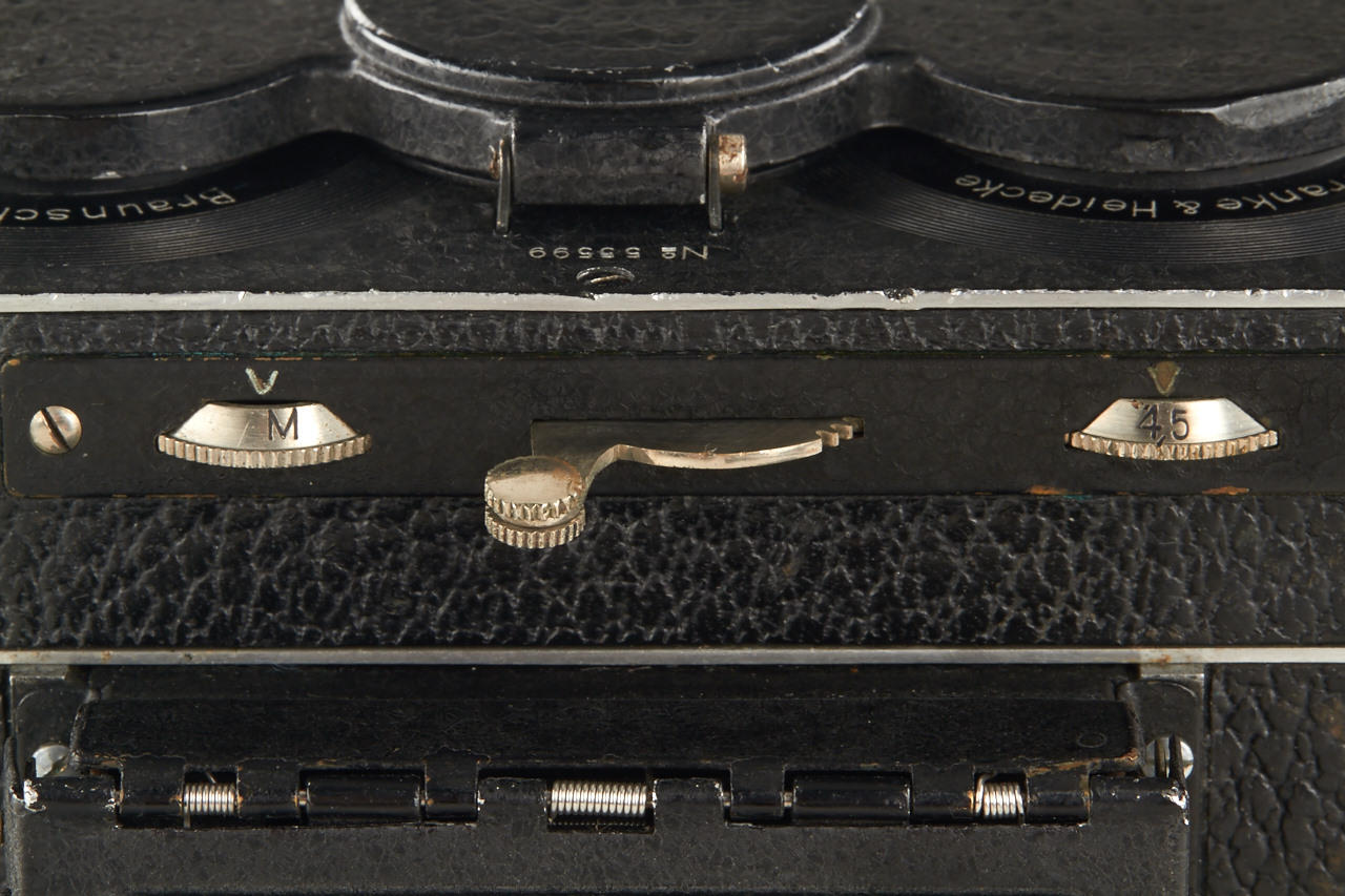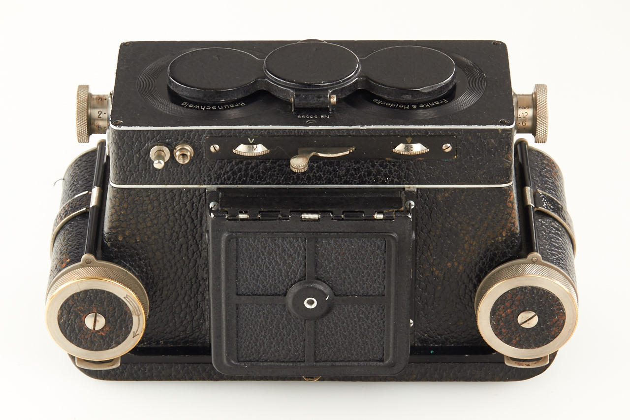rare last version Rolleidoscop 6x13cm for roll film 120 in very fine condition, Tessar 4.5/7.5cm lenses nos. 994831/2, hinged cap, in very good and working condition (synchronised)