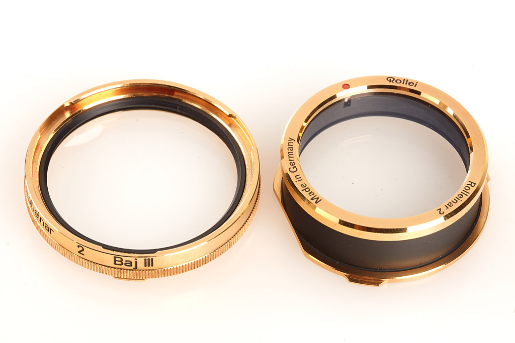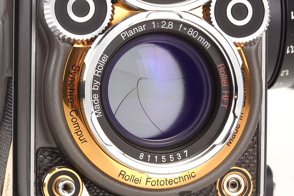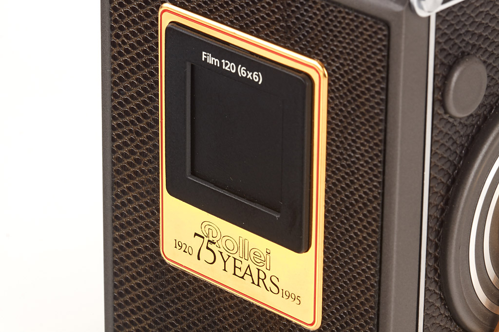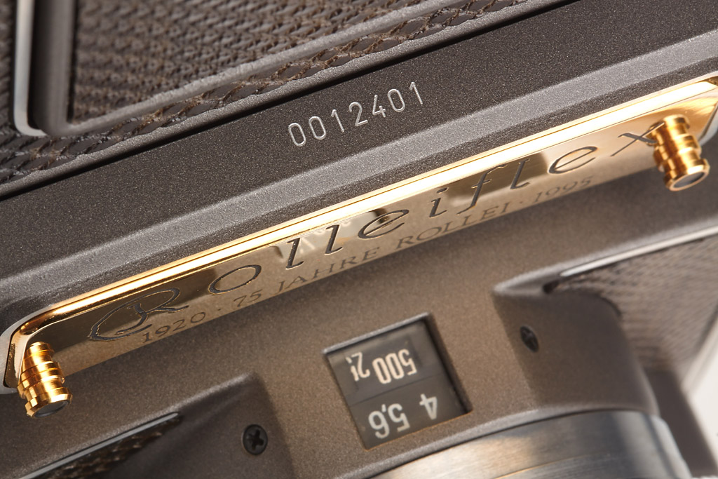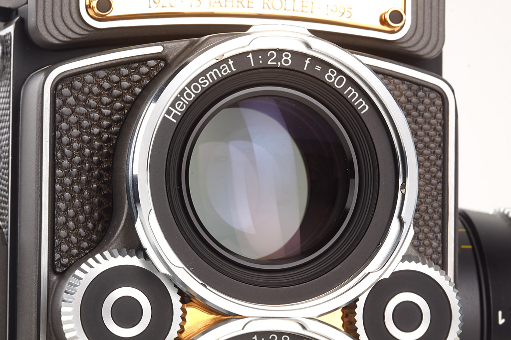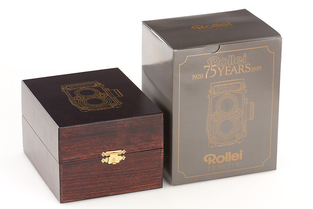 new edition for the 75th anniversary, gold plated metal parts, reptile-look leather, Planar 2.8/80mm no.8115537, cap, strap, gold plated Rolleinar set, certificate, instructions, wooden presentations box, maker's box