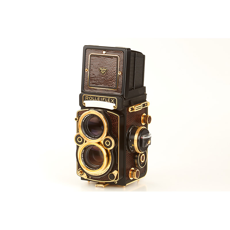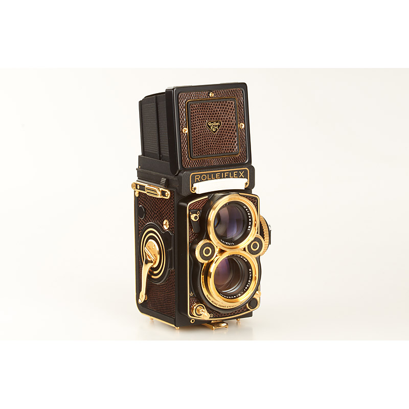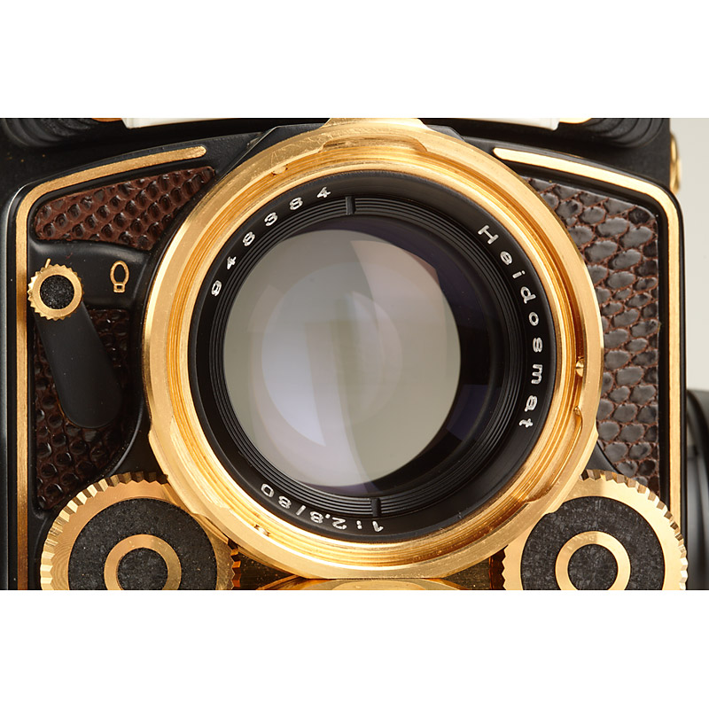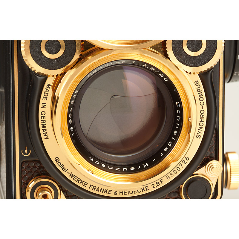 gold plated edition in new condition with Xenotar 2.8/80mm no.13964338, wooden box, strap, cap, instructions, maker's box and outer cardboard box
