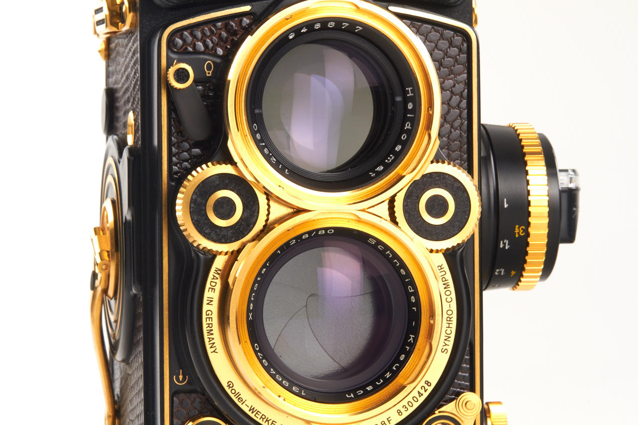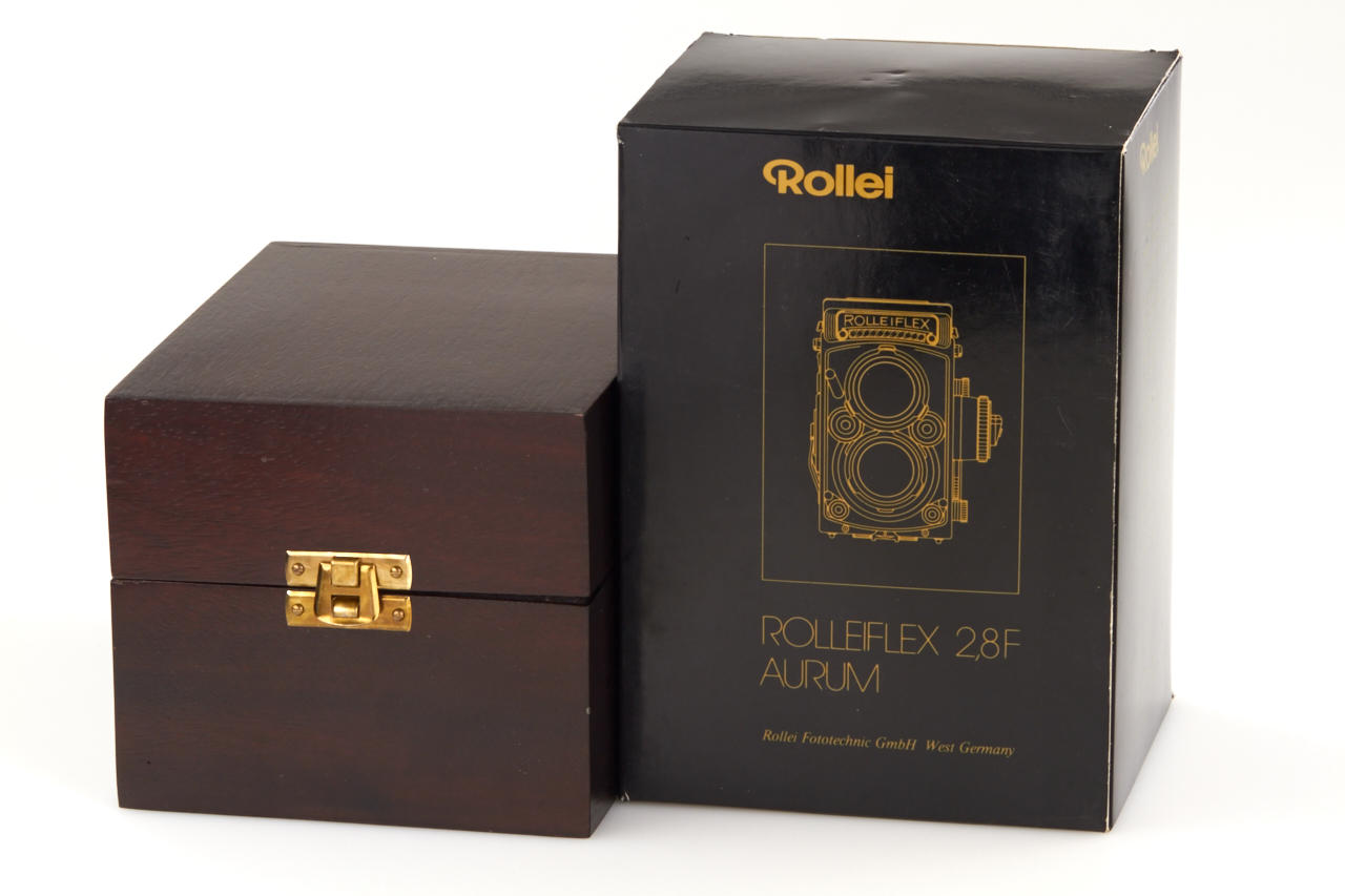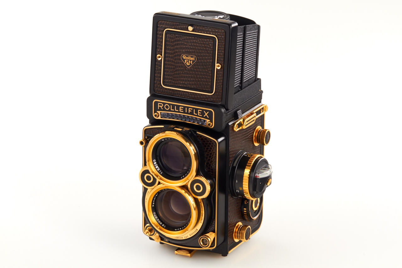 gold-plated edition in mint condition, with Xenotar 2.8/80mm no.13964970, wooden presentation box, cap, strap, maker's box
