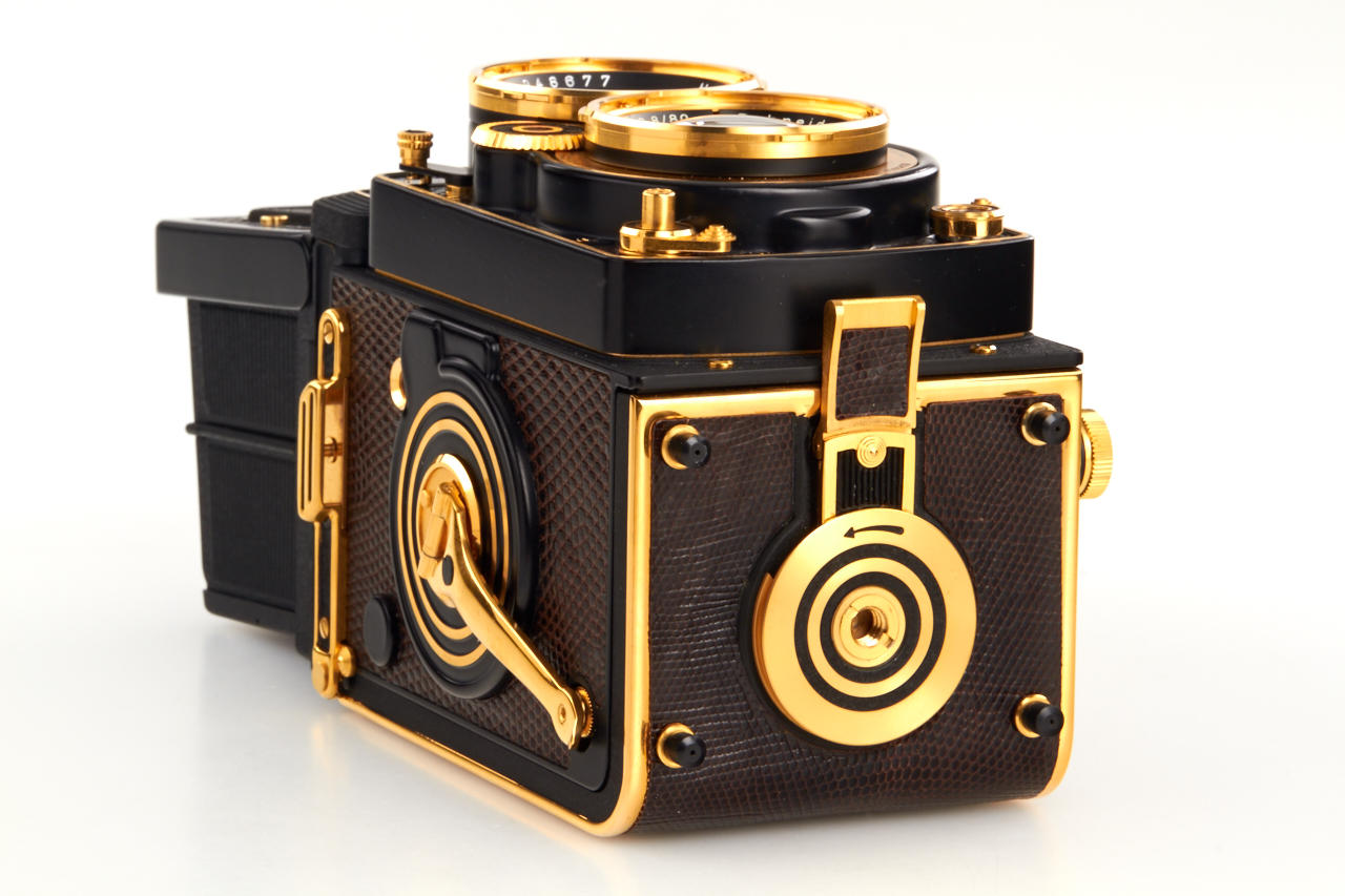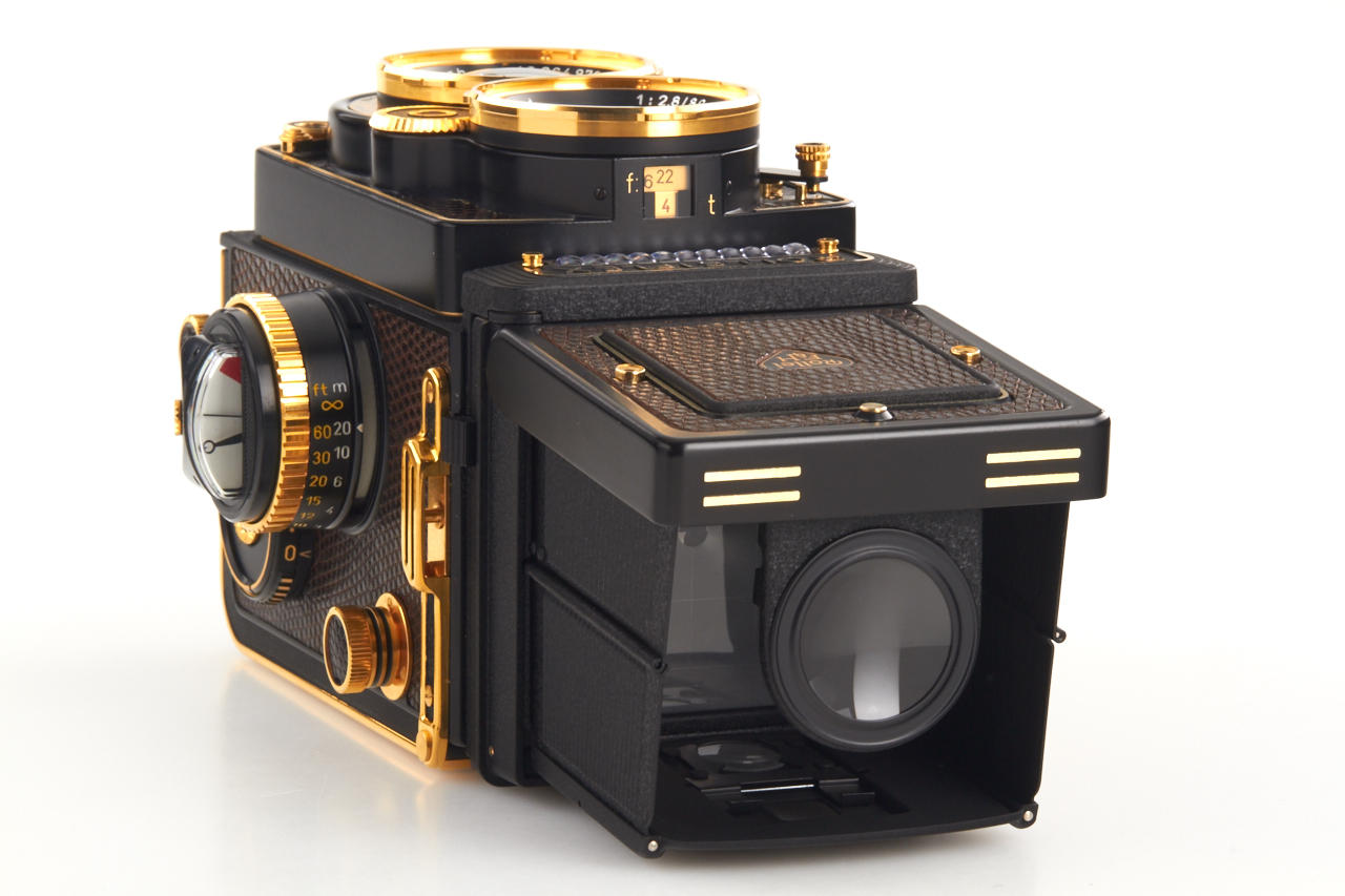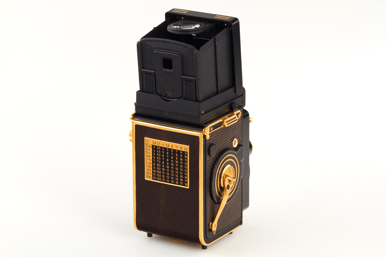 gold-plated edition in mint condition, with Xenotar 2.8/80mm no.13964970, wooden presentation box, cap, strap, maker's box