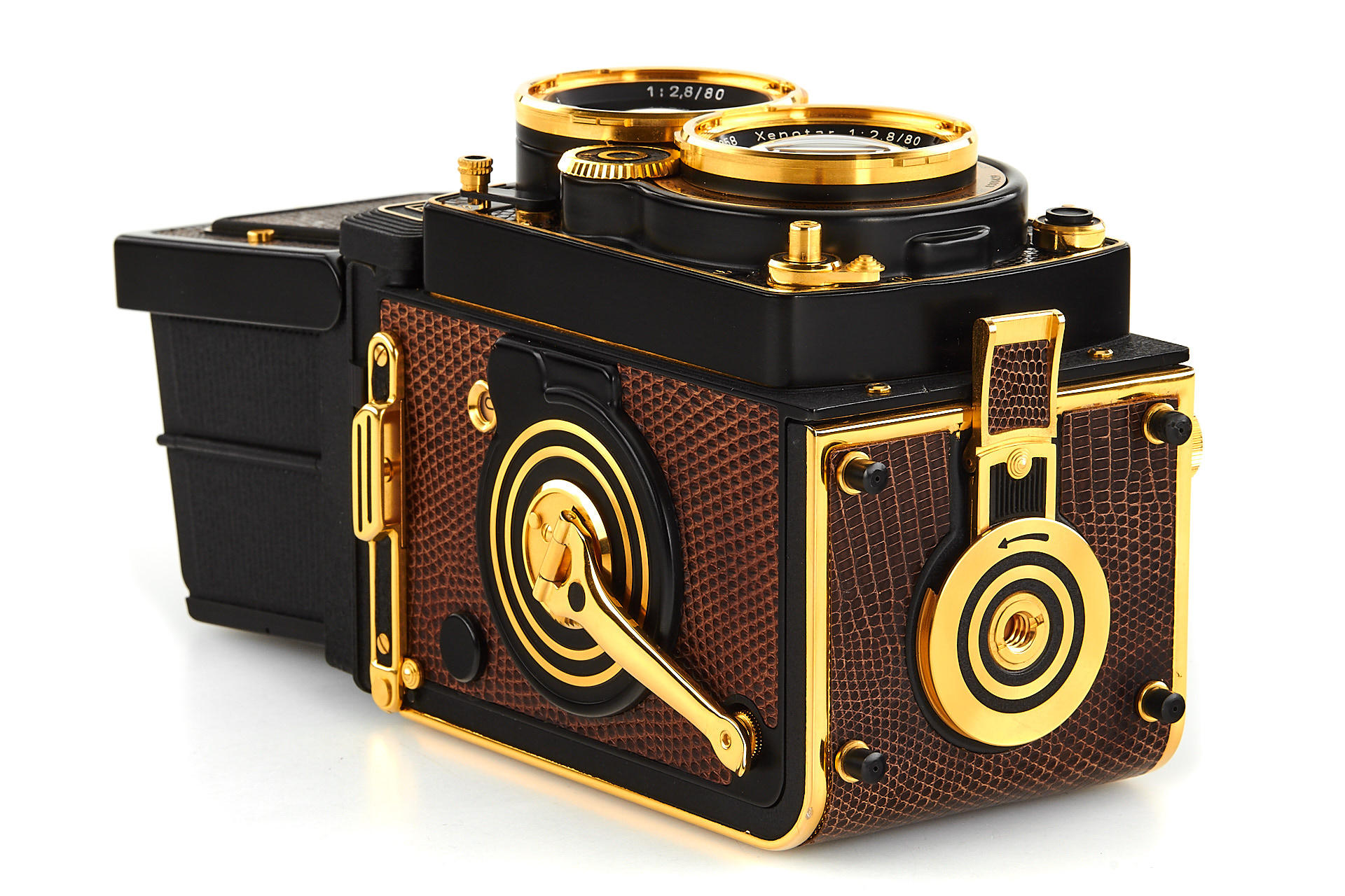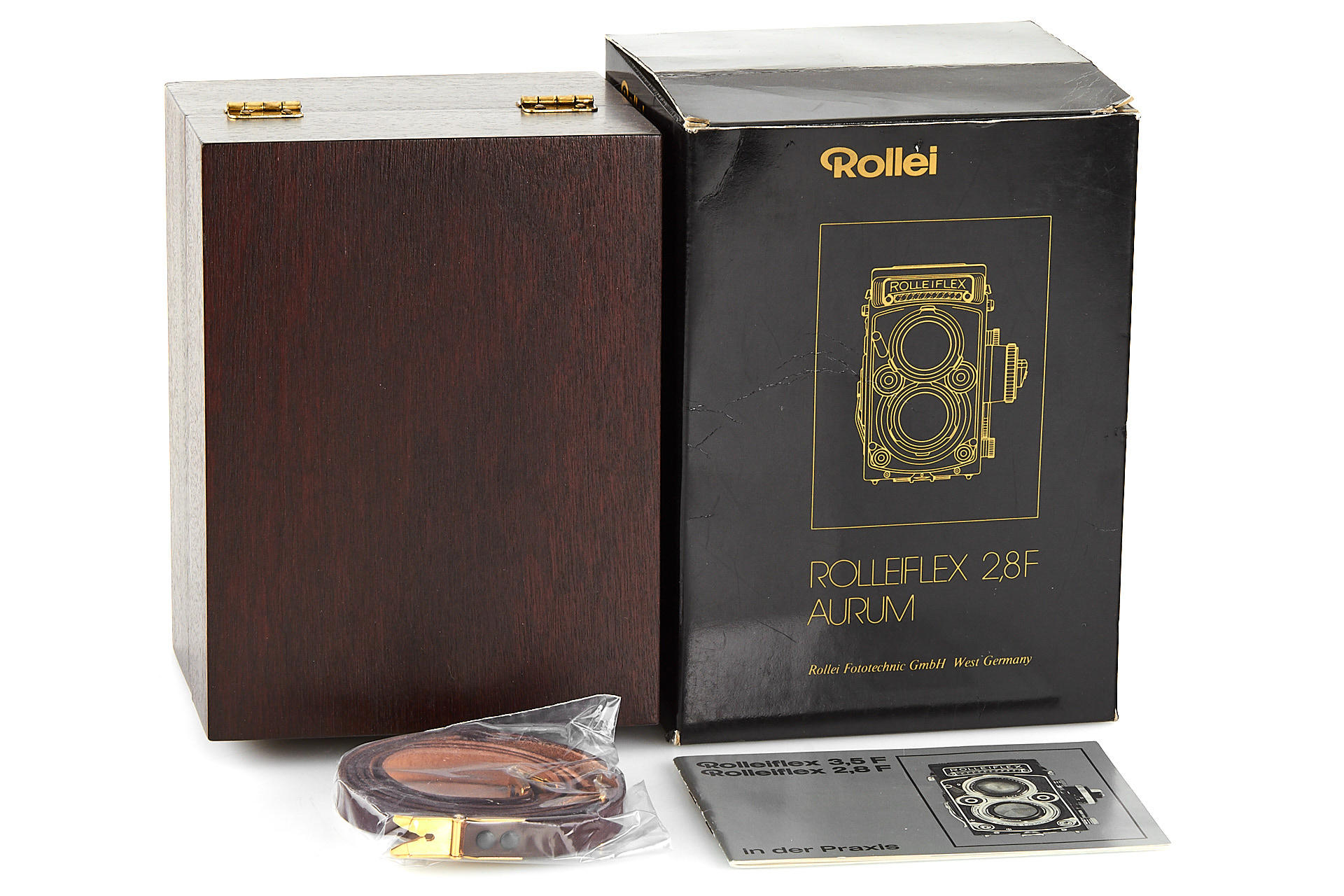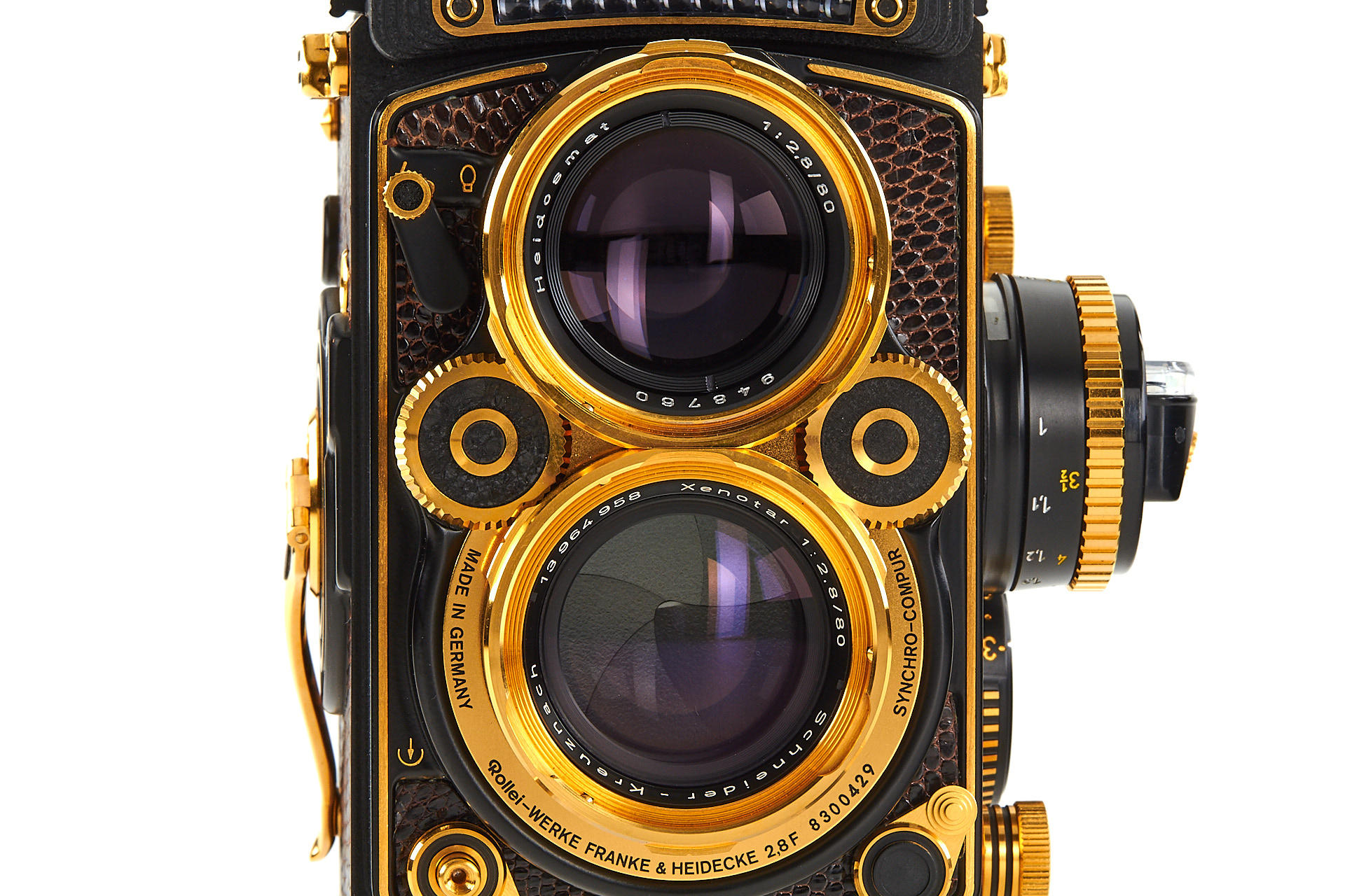 gold-plated special edition Rolleiflex in mint condition, with Xenotar 2.8/80mm no.13964958, wooden presentation box, strap, instructions, and maker's box, only 1500 these rare cameras have been made after the F-series has been suspended
