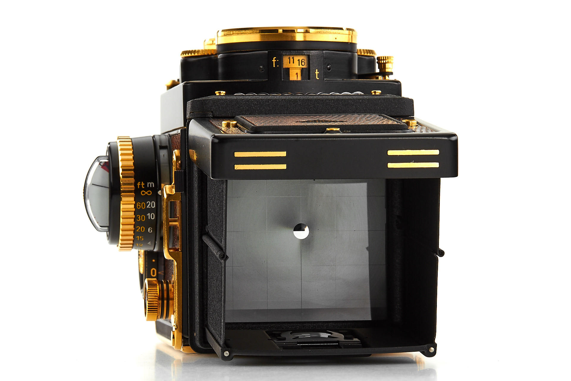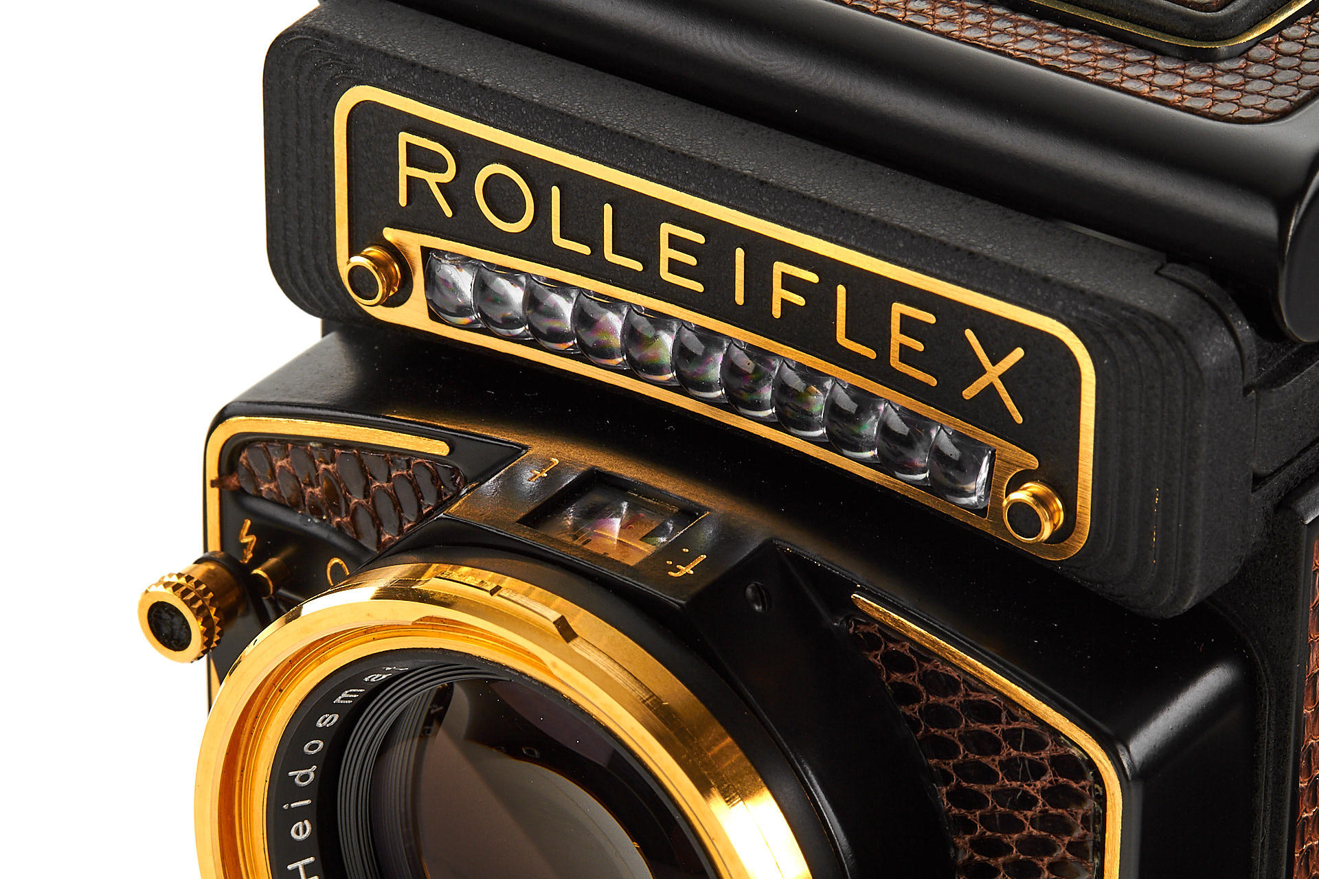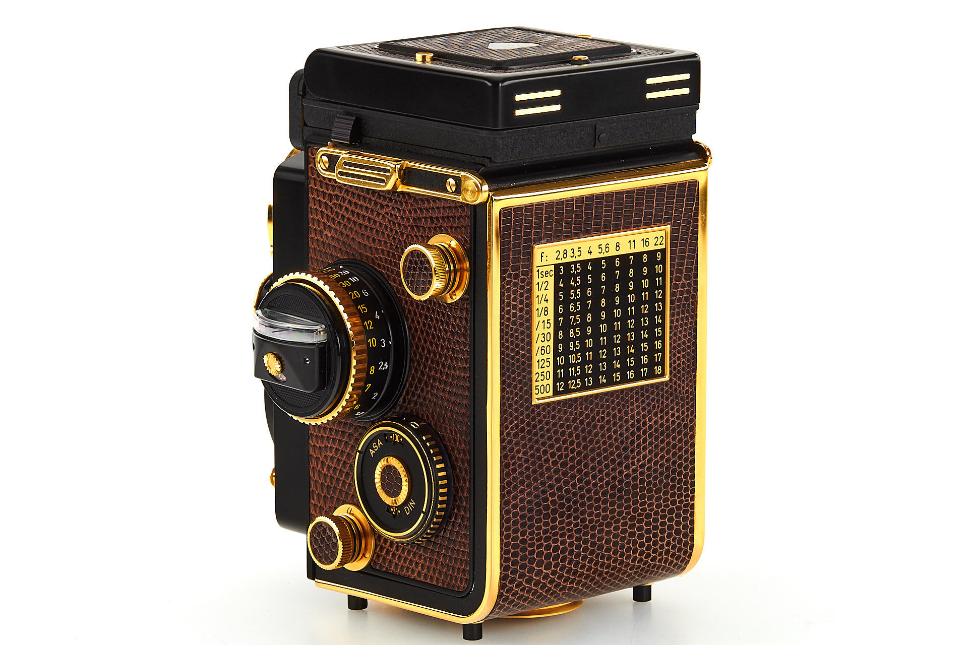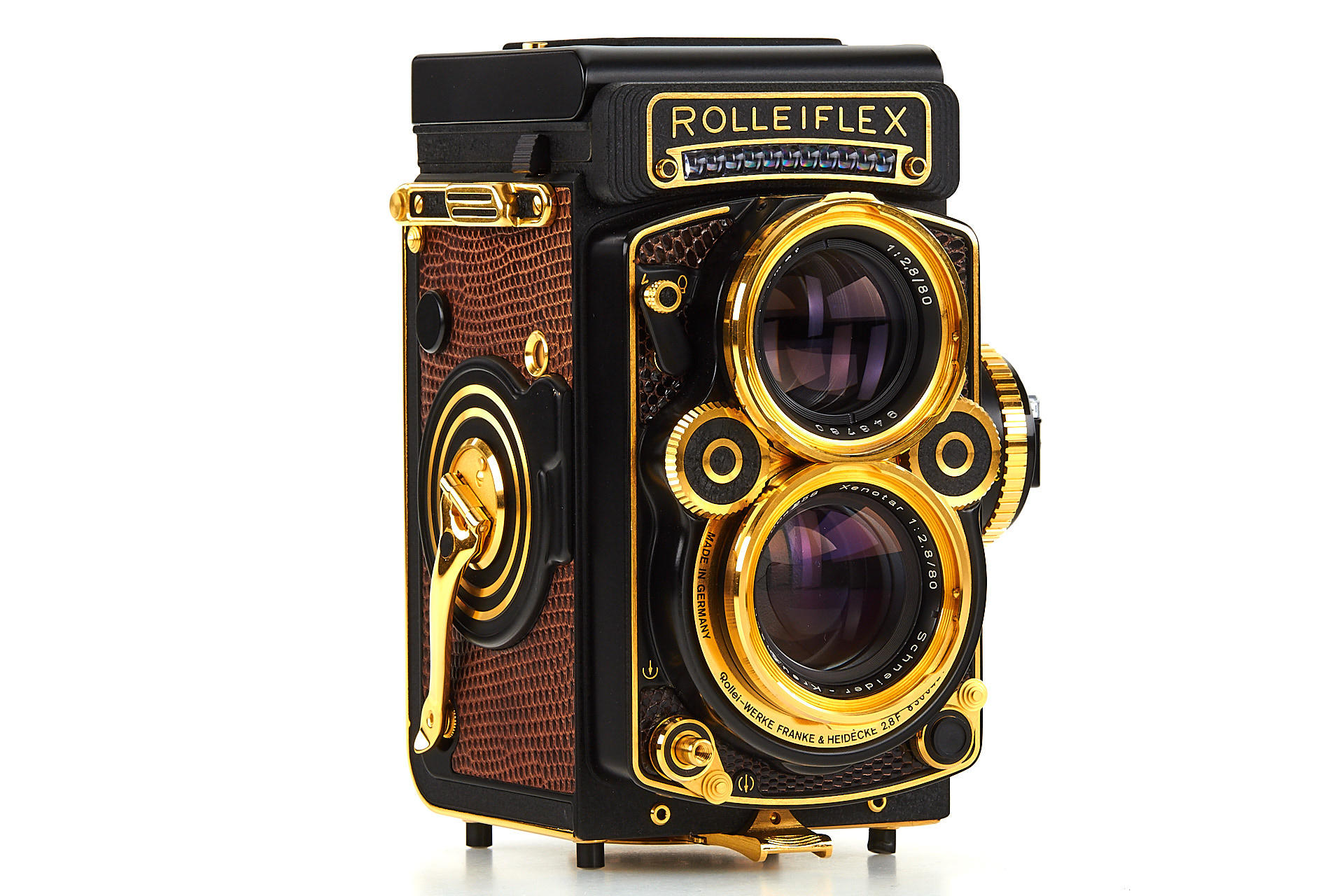 gold-plated special edition Rolleiflex in mint condition, with Xenotar 2.8/80mm no.13964958, wooden presentation box, strap, instructions, and maker's box, only 1500 these rare cameras have been made after the F-series has been suspended