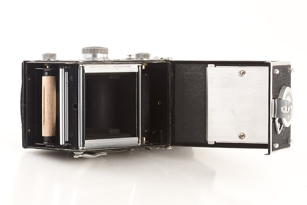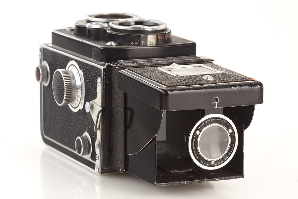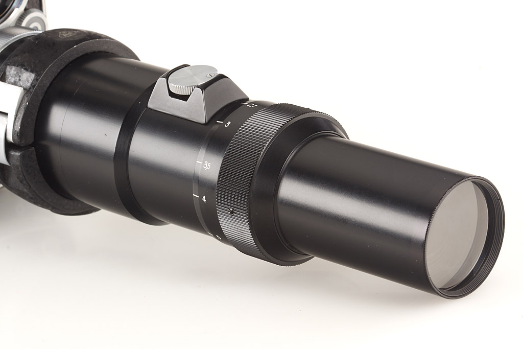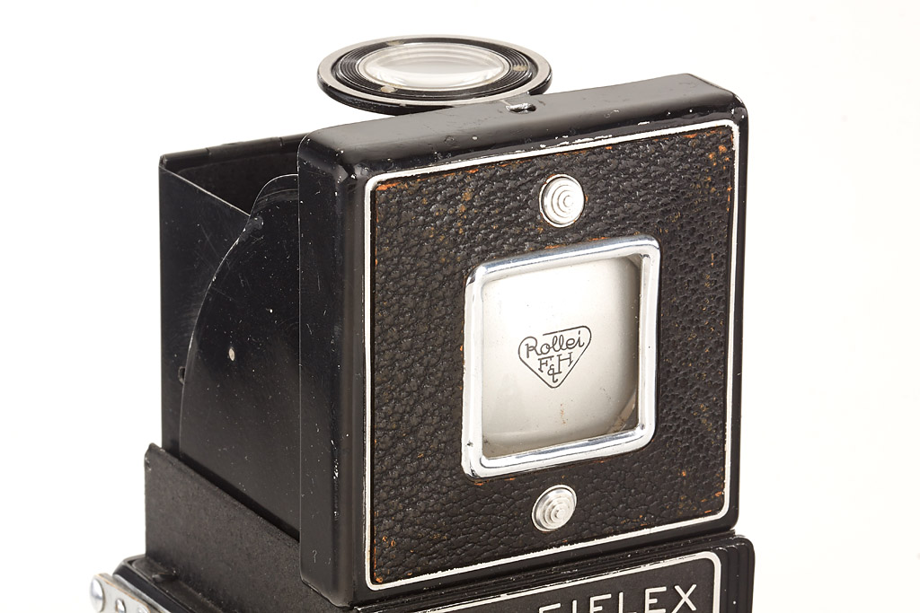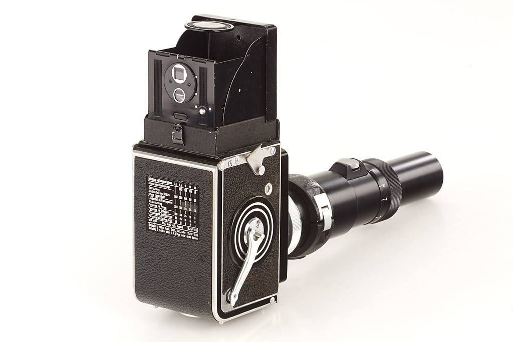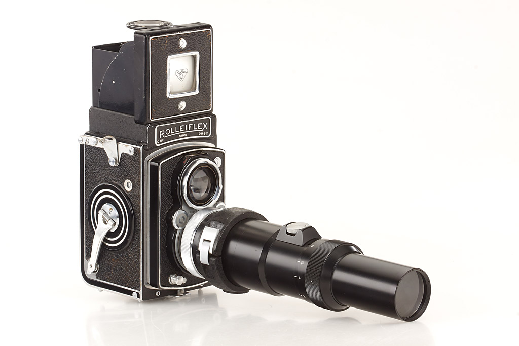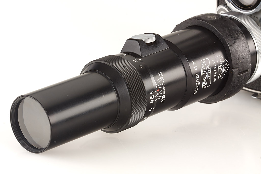 very interesting prototype in fine condition, modified waist-level finder with tele lens magnifier, a similar camera is illustarted in Claus Prochnow Rollei Report 2 p.345, including Carl Zeiss Jena Magnar 4x no.2449917 (case)