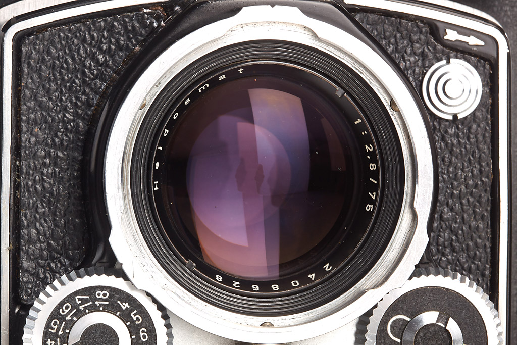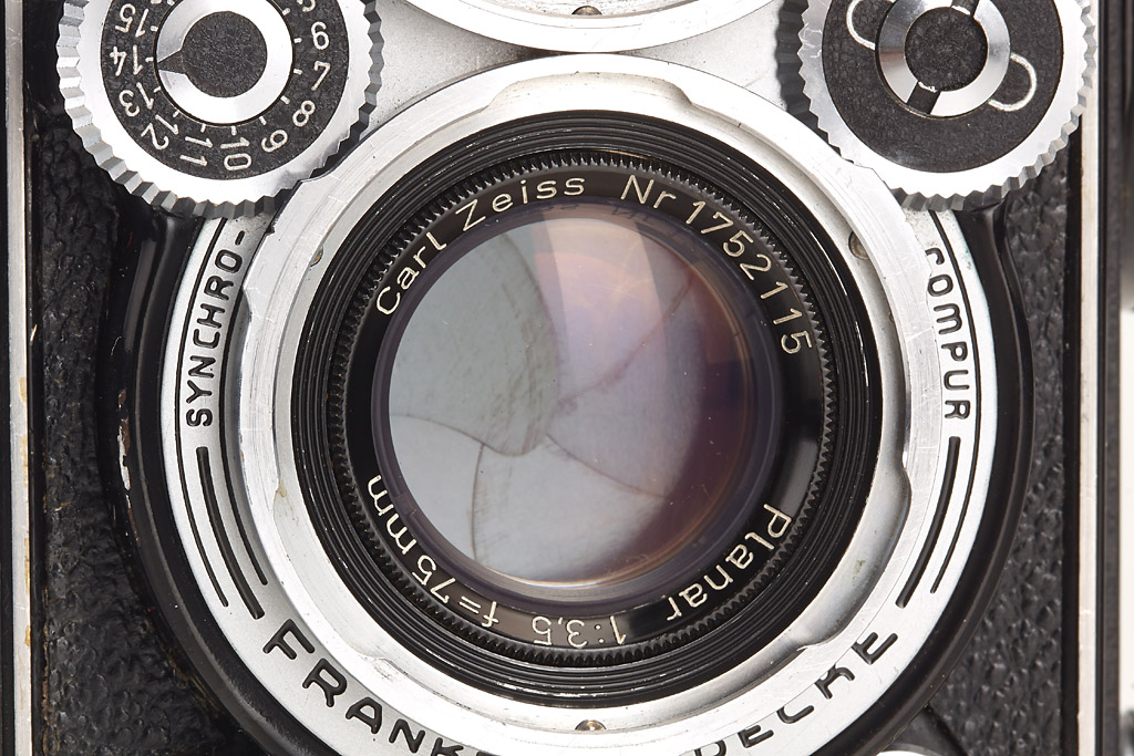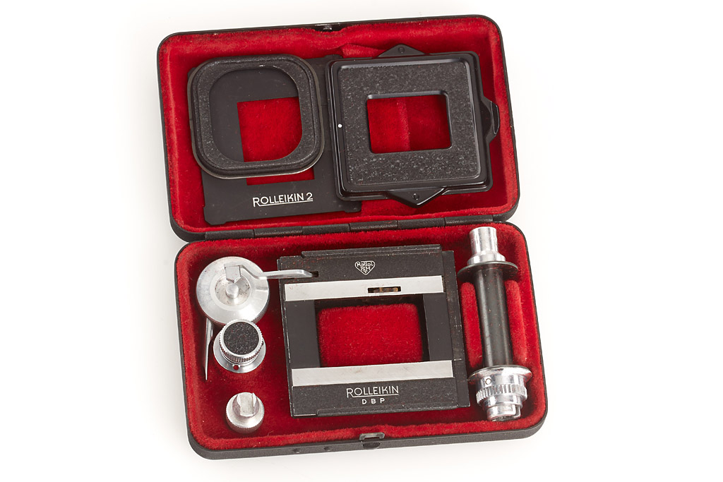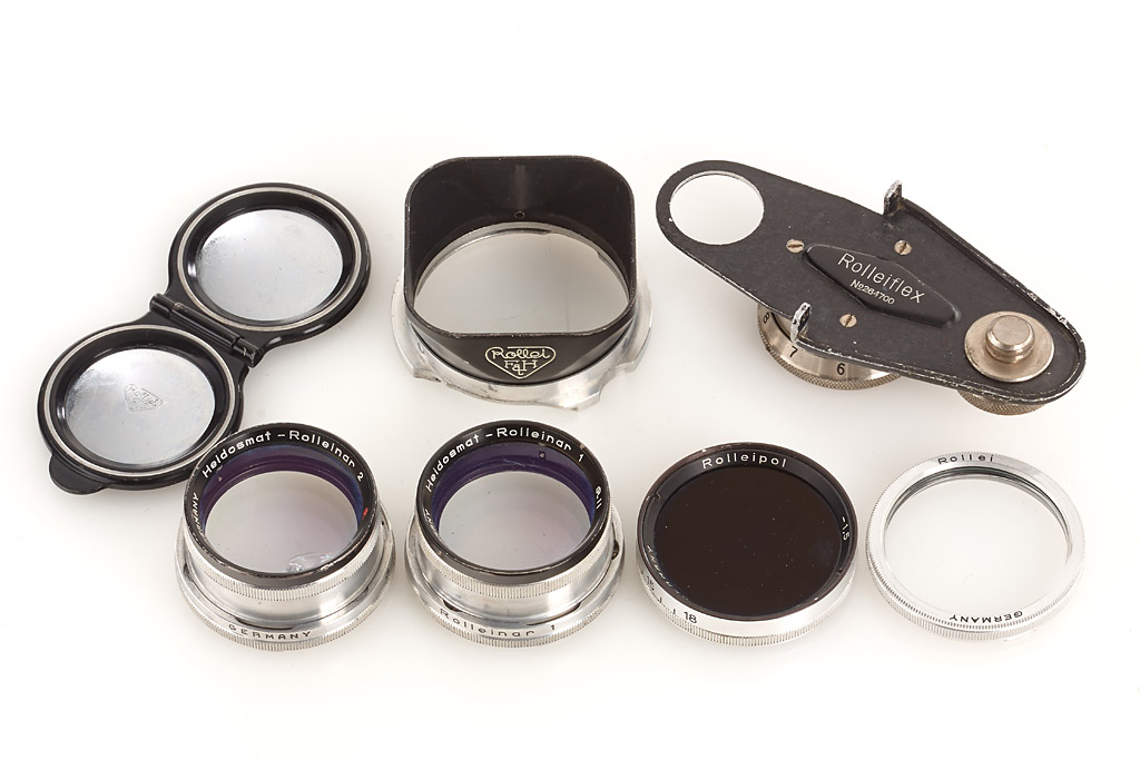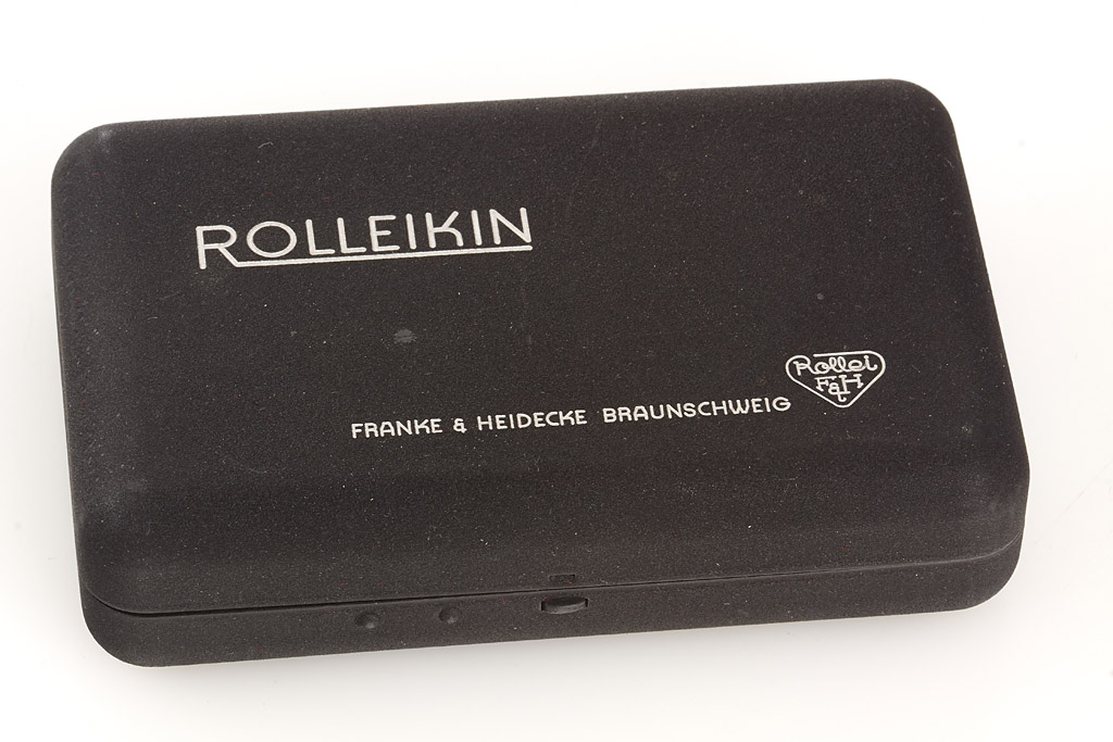 metered body in fine condition, Planar 3.5/75mm no.1752115 taking lens, Heidosmat 2.8/75mm no.2408628 viewing lens (cap), 24x36 counter, Rolleikin 2, Rolleifix, 3 filters (keepers), strap, case, maker's box