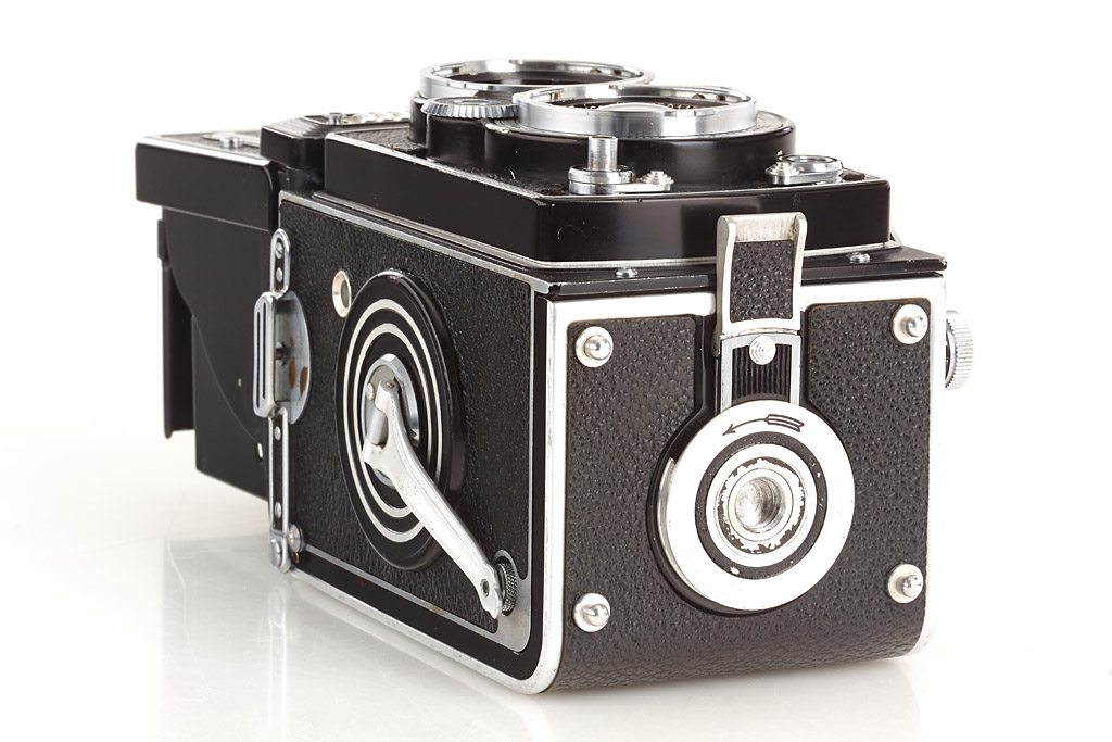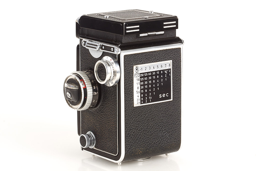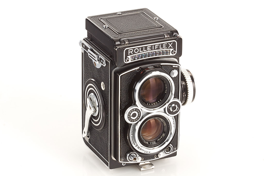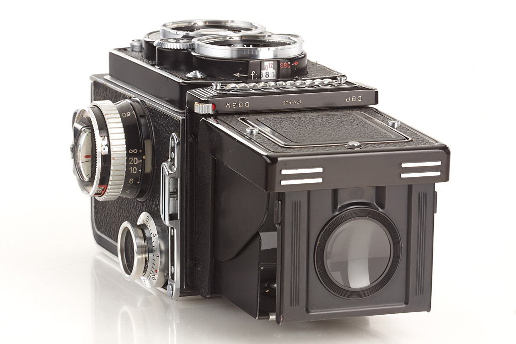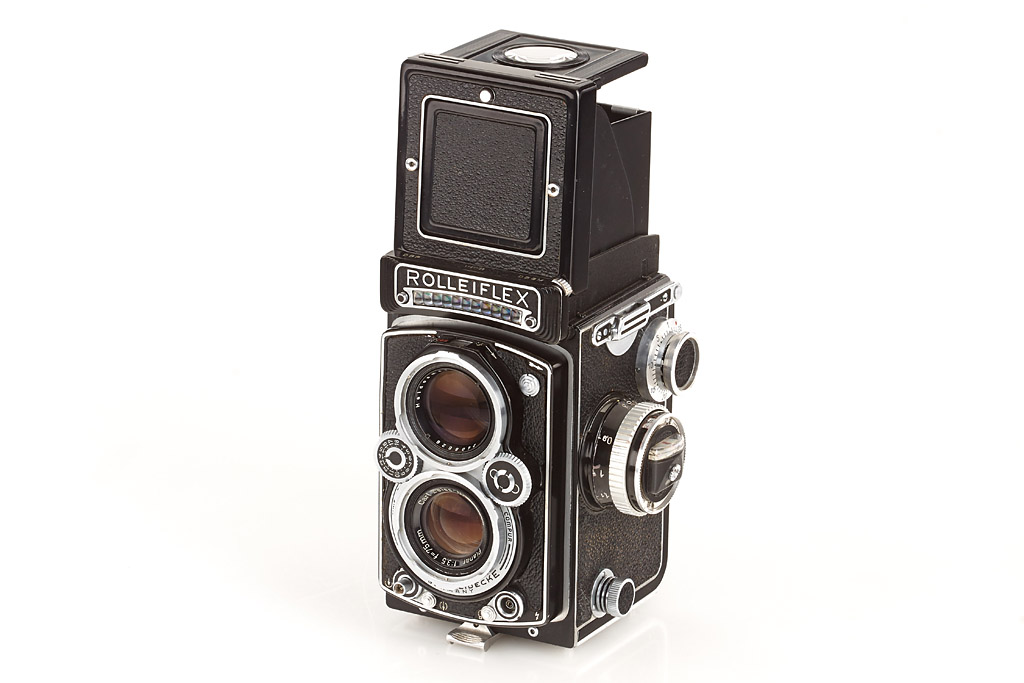 metered body in fine condition, Planar 3.5/75mm no.1752115 taking lens, Heidosmat 2.8/75mm no.2408628 viewing lens (cap), 24x36 counter, Rolleikin 2, Rolleifix, 3 filters (keepers), strap, case, maker's box