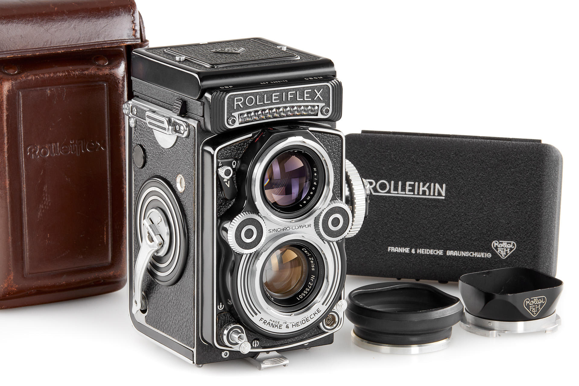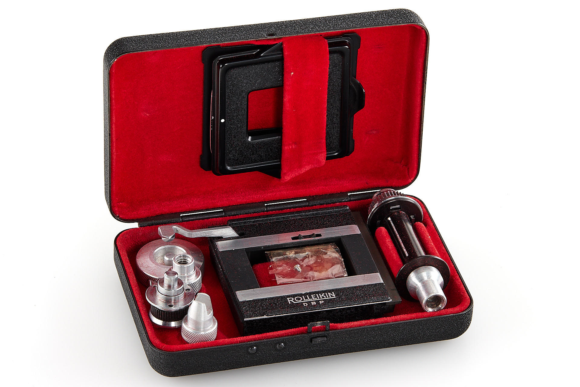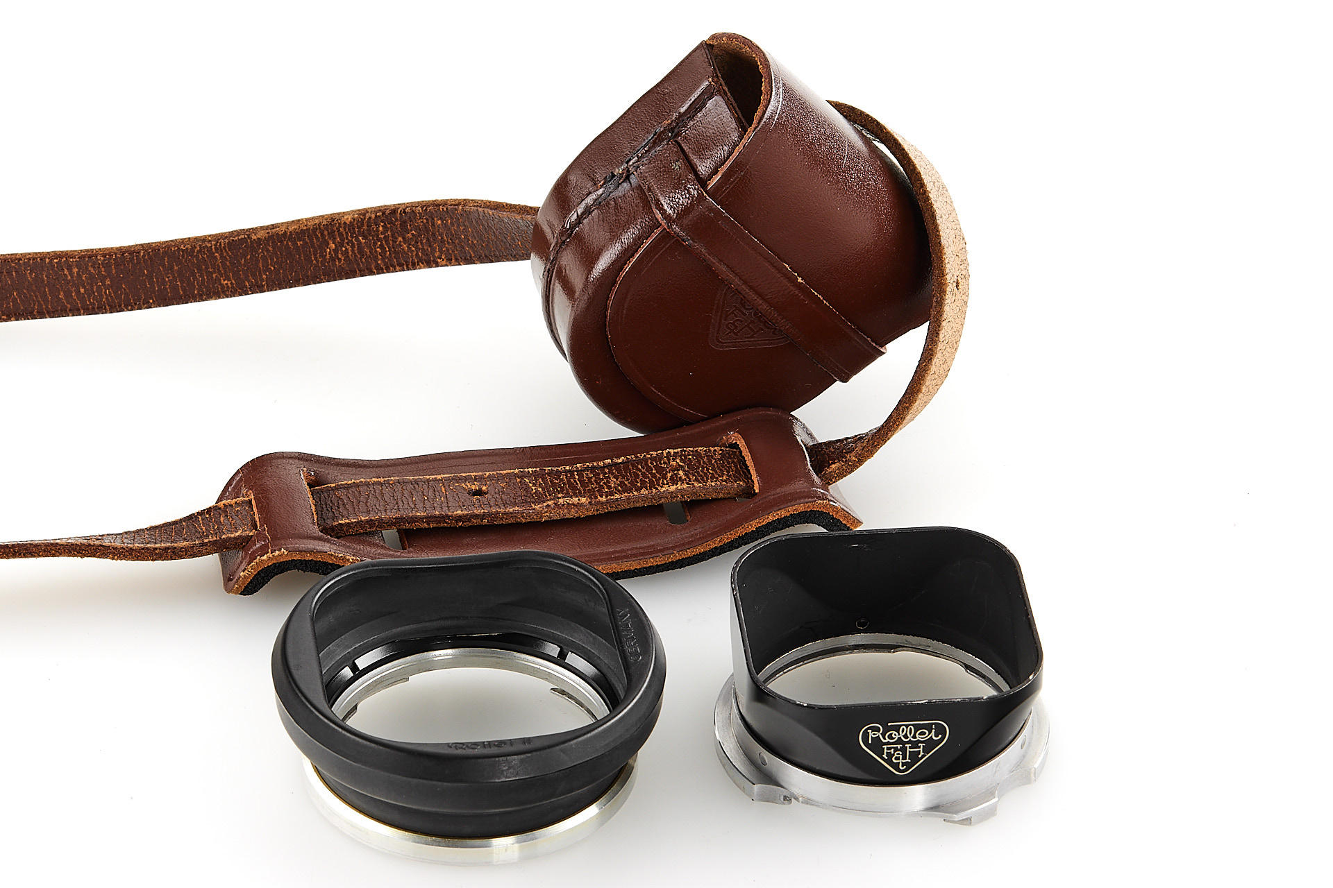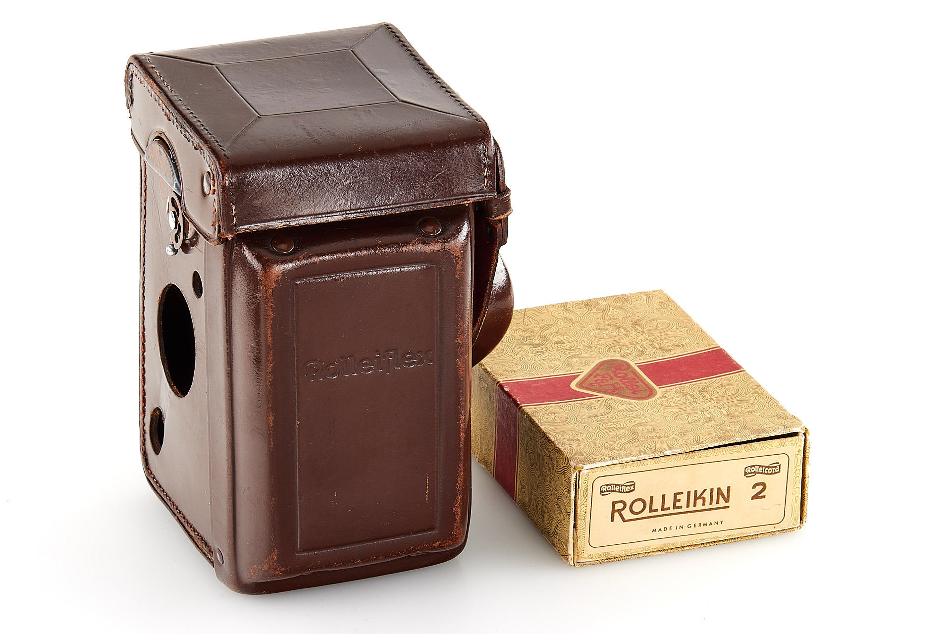 Beautiful third model in near mint condition and working order, clean Planar 3.5/75mm no.2755501, working light meter, with rubber and metal hoods, Rolleikin 2 in maker's box, leather strap and ever ready case with light meter protection