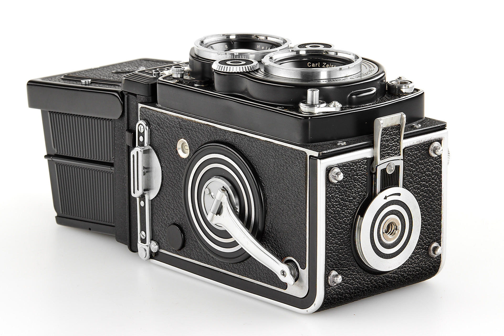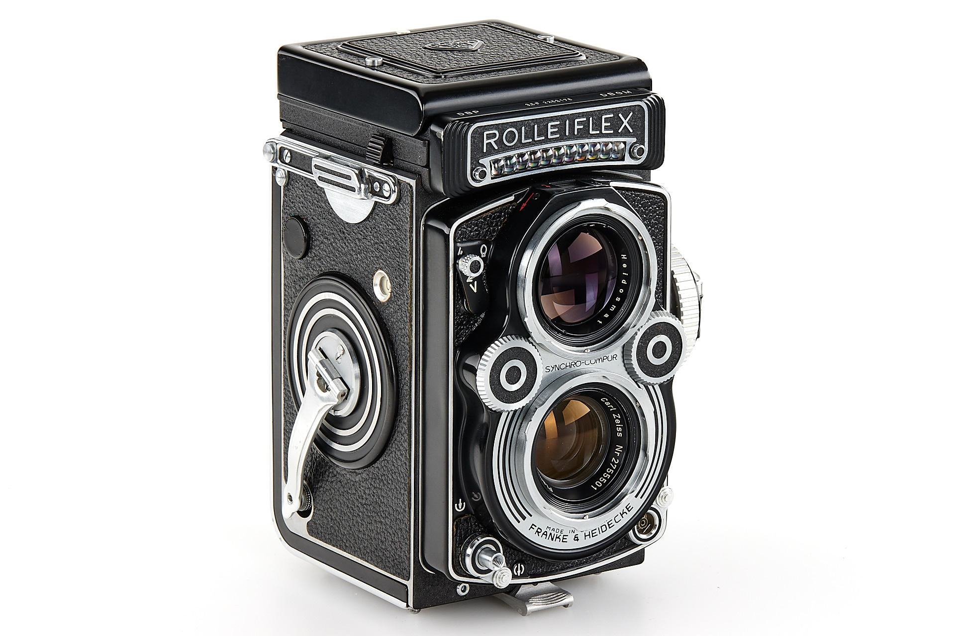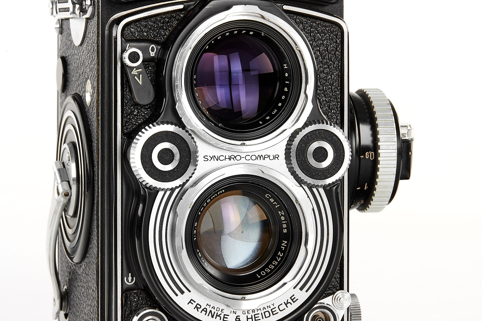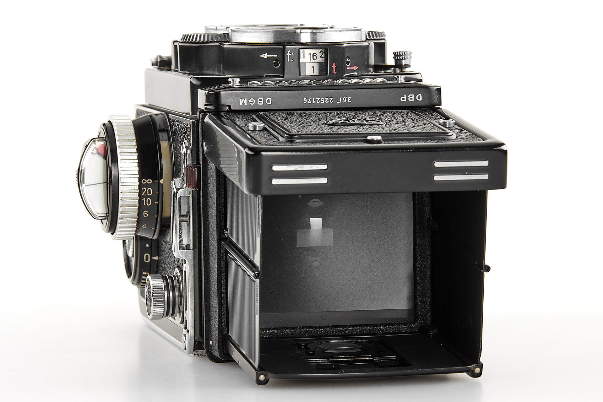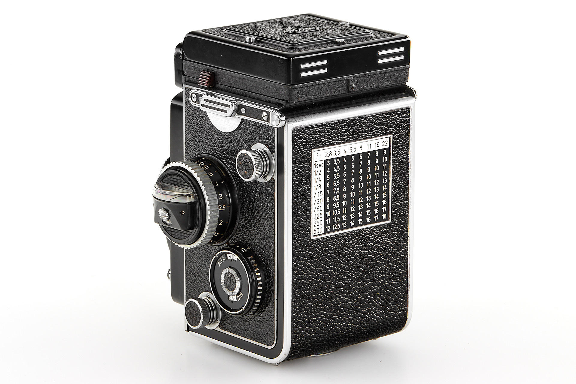 Beautiful third model in near mint condition and working order, clean Planar 3.5/75mm no.2755501, working light meter, with rubber and metal hoods, Rolleikin 2 in maker's box, leather strap and ever ready case with light meter protection
