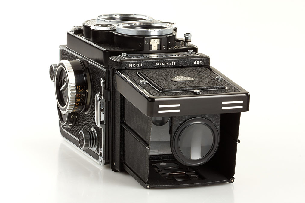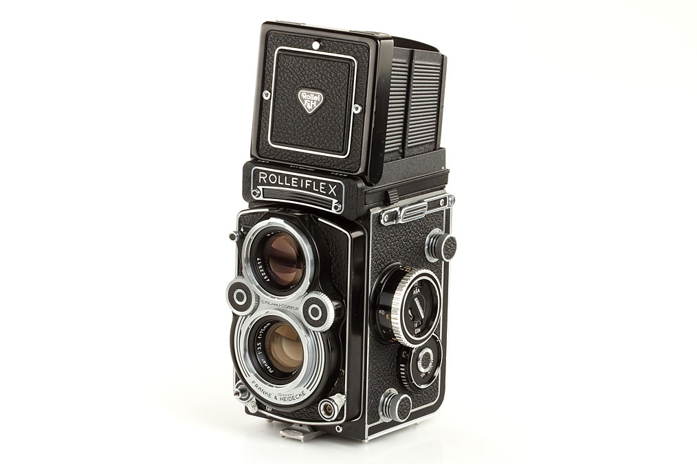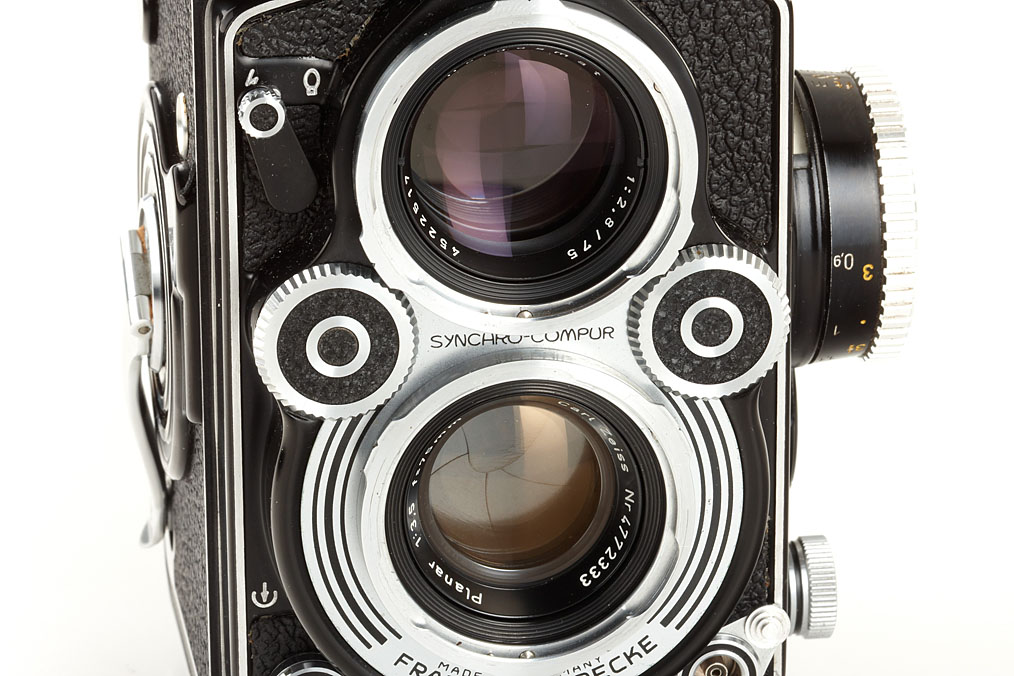 near mint 3.5F Planar, Planar 3.5/75mm no.4772333 taking lens, Heidosmat 2.8/75mm no.4522517 viewing lens, cap, case, strap, complete Rolleikin in case, Rolleifix in maker's box, hood in case, 6 filters in keepers