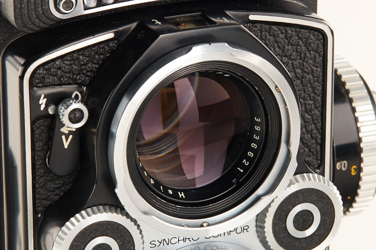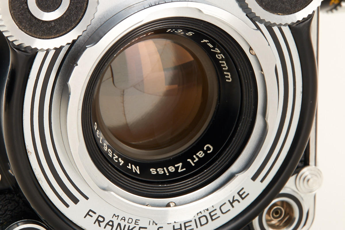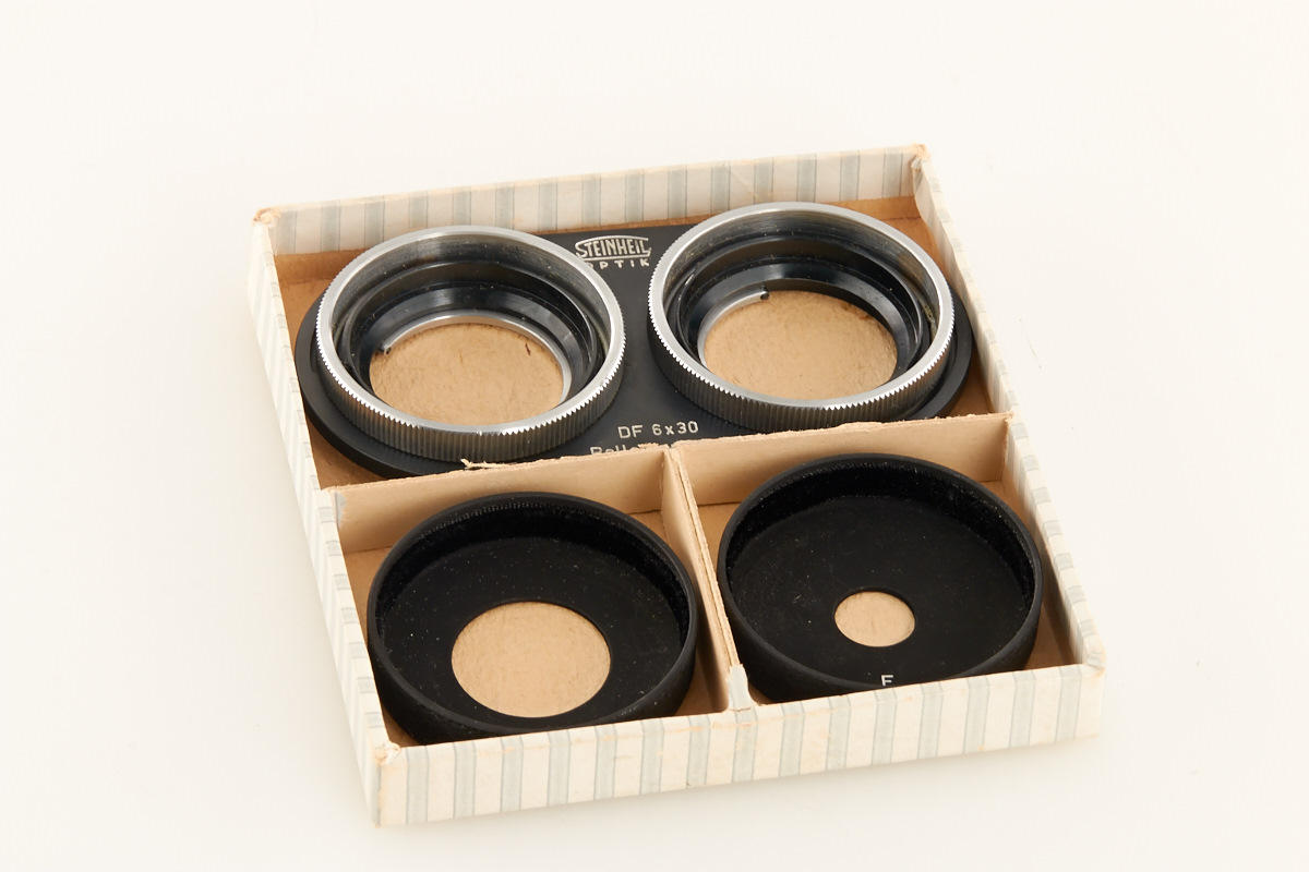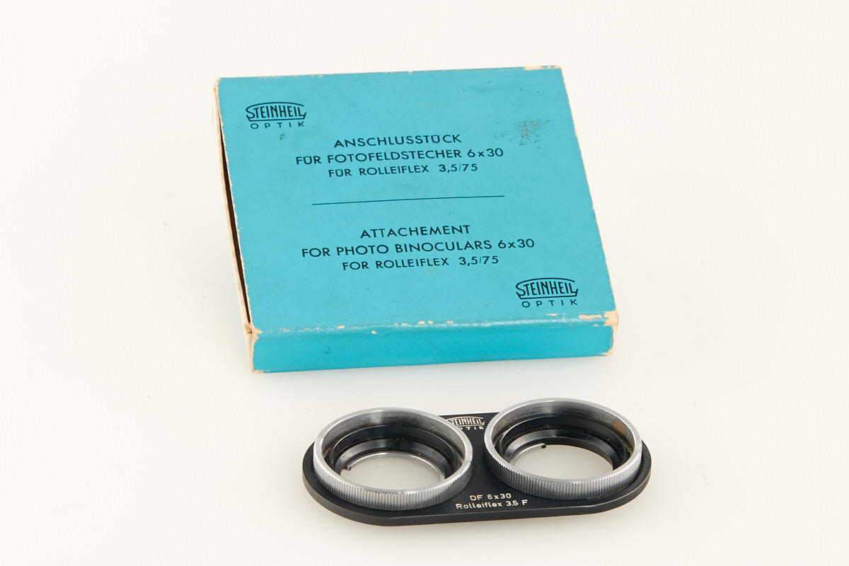 metered camera in near mint condition and good working order with Planar 3.5/75mm no.4256135 (cap), diffusor, everready case with strap, including an uncommon Steinheil binocular attachment in maker's box