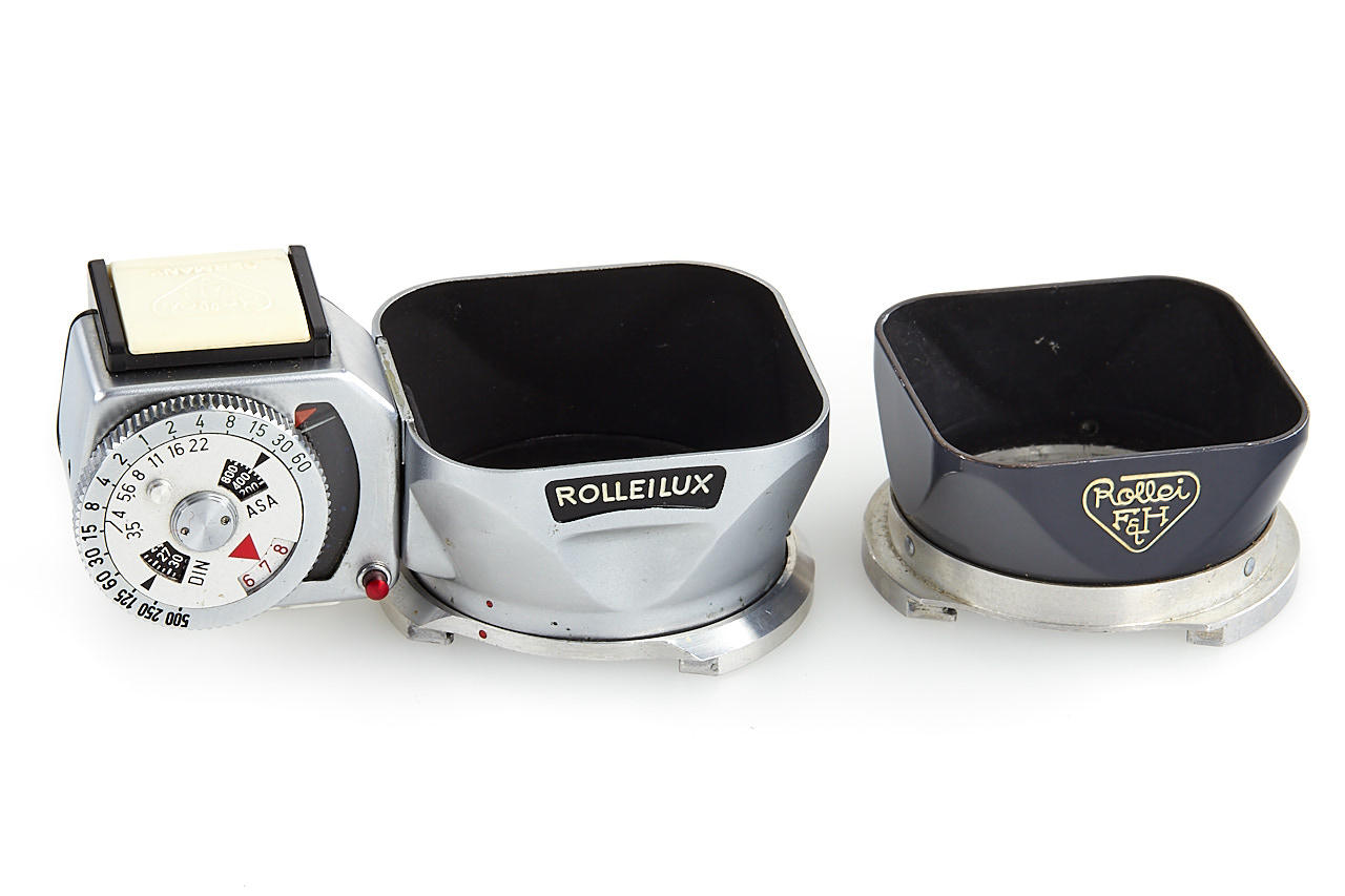near mint baby Rolleiflex in good working order, with case, uncommon metal tropical case in hammertone finish, Rolleifix tripod mount, matching grey painted hood, Rolleilux hood with meter, strap, various filters and closeup lenses