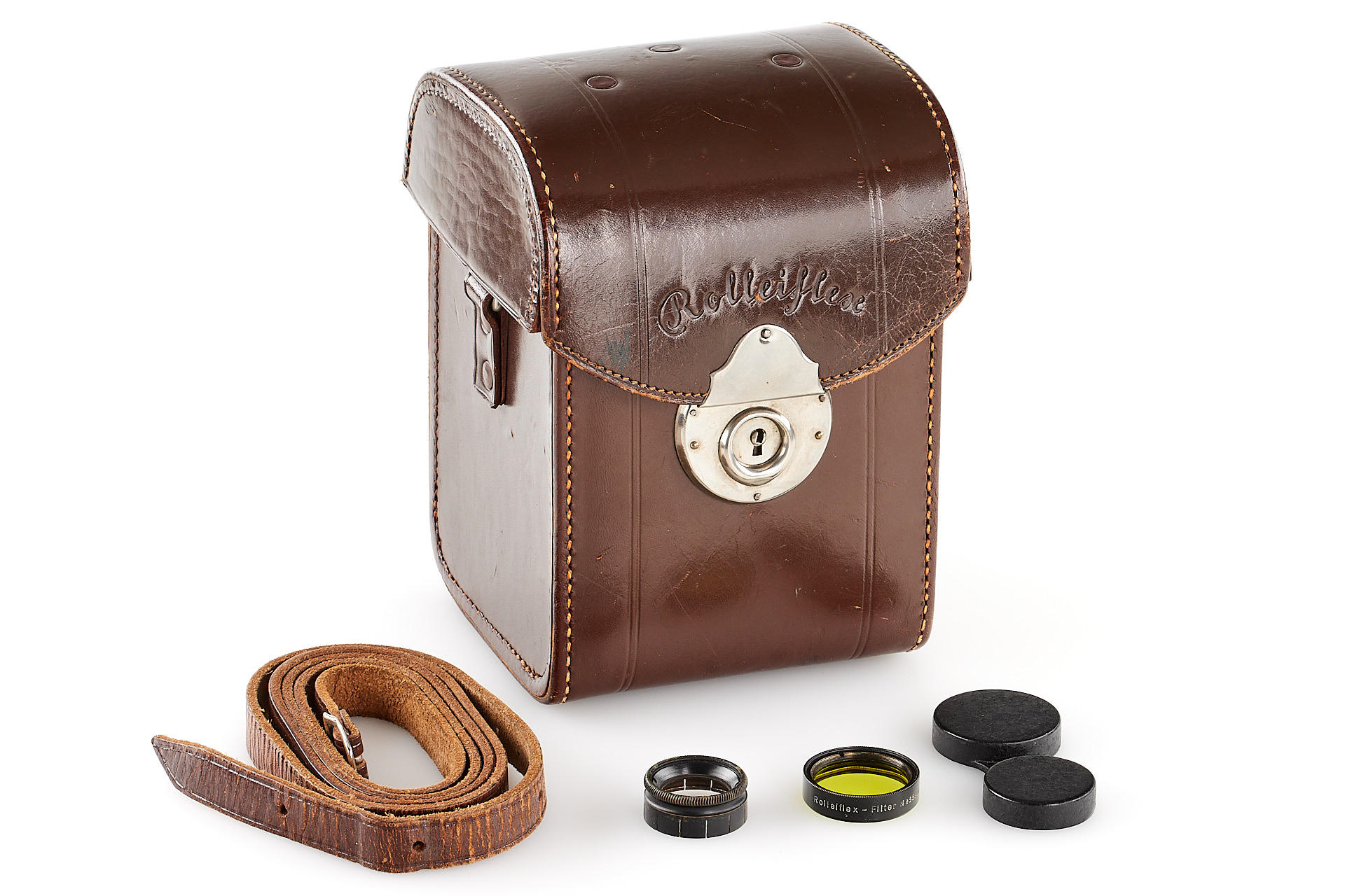 Beautiful and very early first version, with Tessar 4.5/7.5cm no.991737, in almost mint condition and working order, no focus scale, chassis engraved with 8777, with wooden spool, yellow filter no.35596, close-up lens, leather strap, very early lenses cap (without hole) and early leather case (with strap extension)