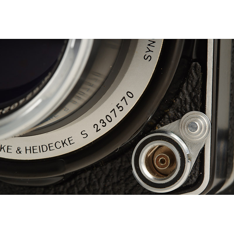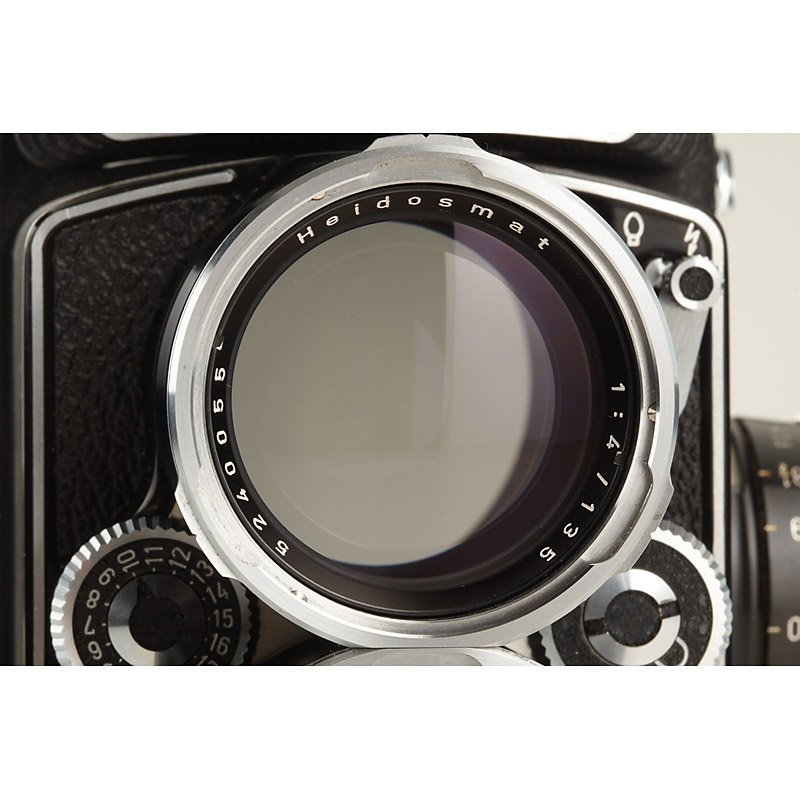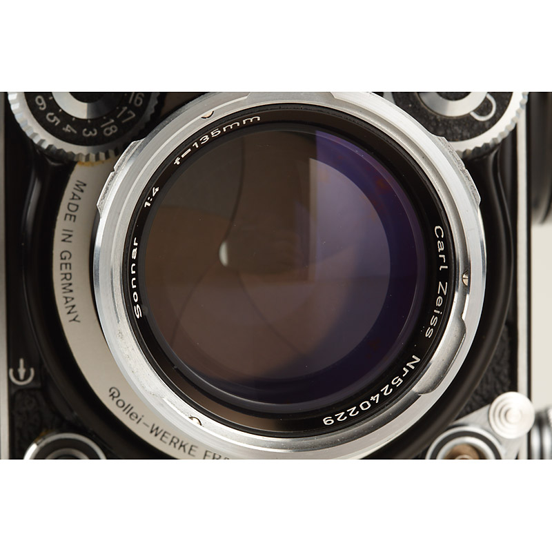 mint and very late Tele Rolleiflex with shiny front plate, Sonnar 4/135mm no.5240229 taking lens, Heidosmat 4/135mm no.5240055 viewing lens, clean finder and shutter