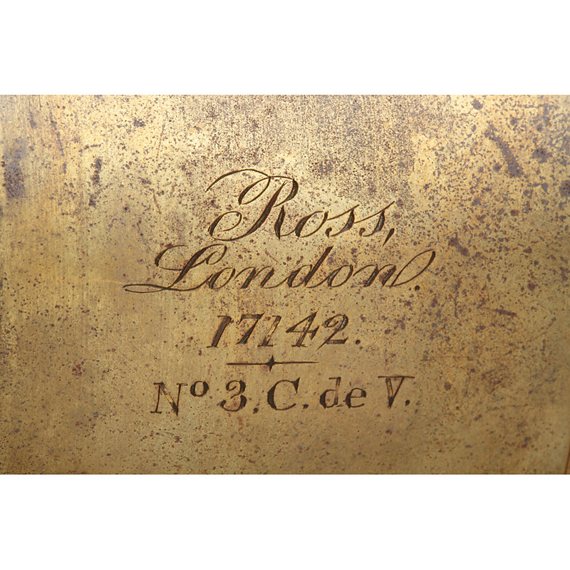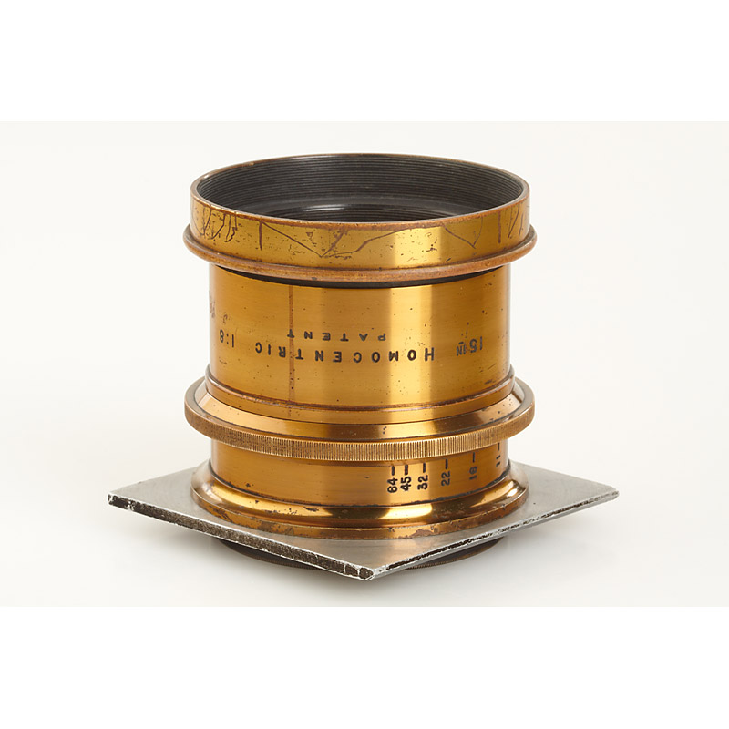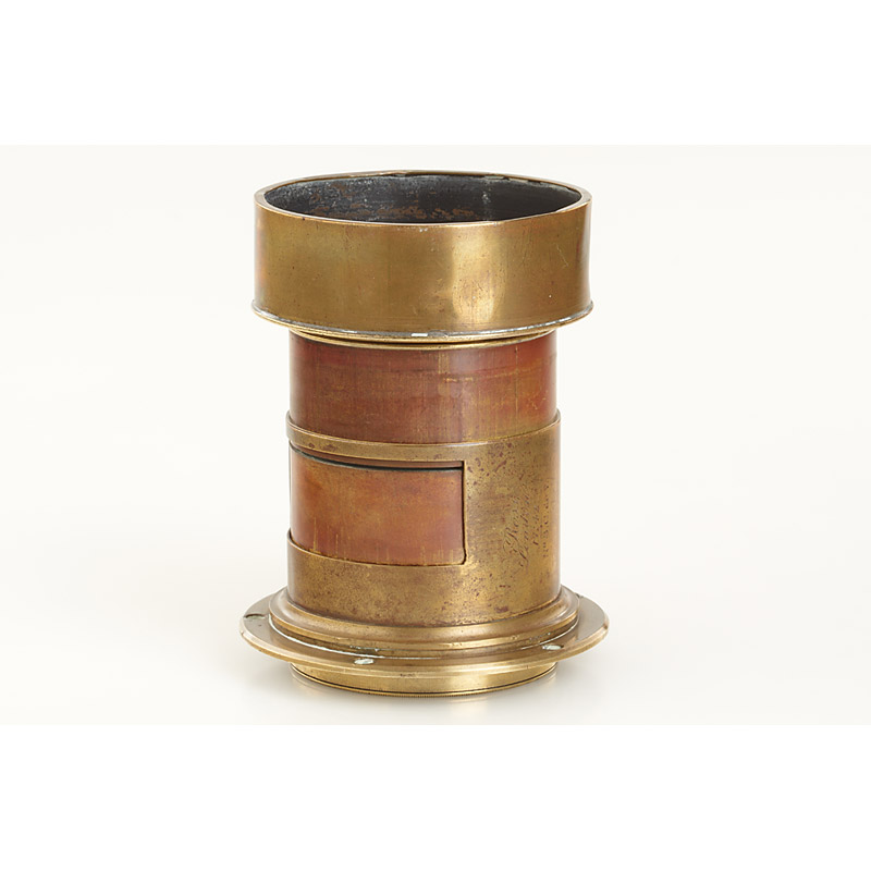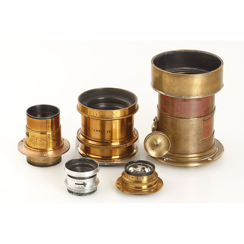 (1) brass Petzval lens no.17142 with approx. 22cm focal length, barrel engraved 'Ross London 17142 No.3.C.de V.', rack and pinion focusing, mounting ring, lens diameter c.6.5cm (cleaning marks, cap), total height incl. hood c.13cm, (2) brass 8/15 Inch Homocentric lens no.72687 with iris diaphragm to 64, several marks, mounted on square 8.5x8.5cm metal lens board, (3) brass Actinic Triplet No.2 no.11445, focal length c.24cm, built-in orange filter in front lens element, mounting ring, front lens diameter c.3.5cm, rear lens diameter c.4cm, total height c.7cm, two waterhouse stops, (4) brass Ross Xpres 4.5/4 3/4' no.89895 with iris diaphragm to 32, mounting ring, box, (5) aluminium 3x3 Rapid Symmetrical no.53129 with iris diaphragm from 8-64, focal length c.8cm, total height c.3.5cm (5)