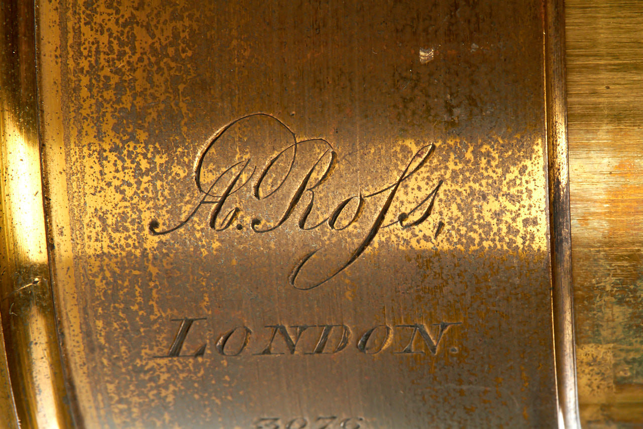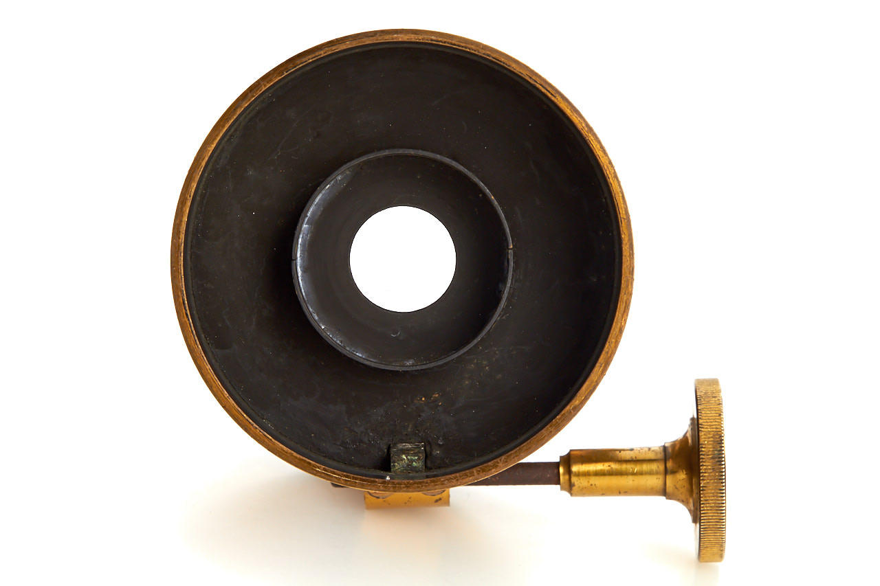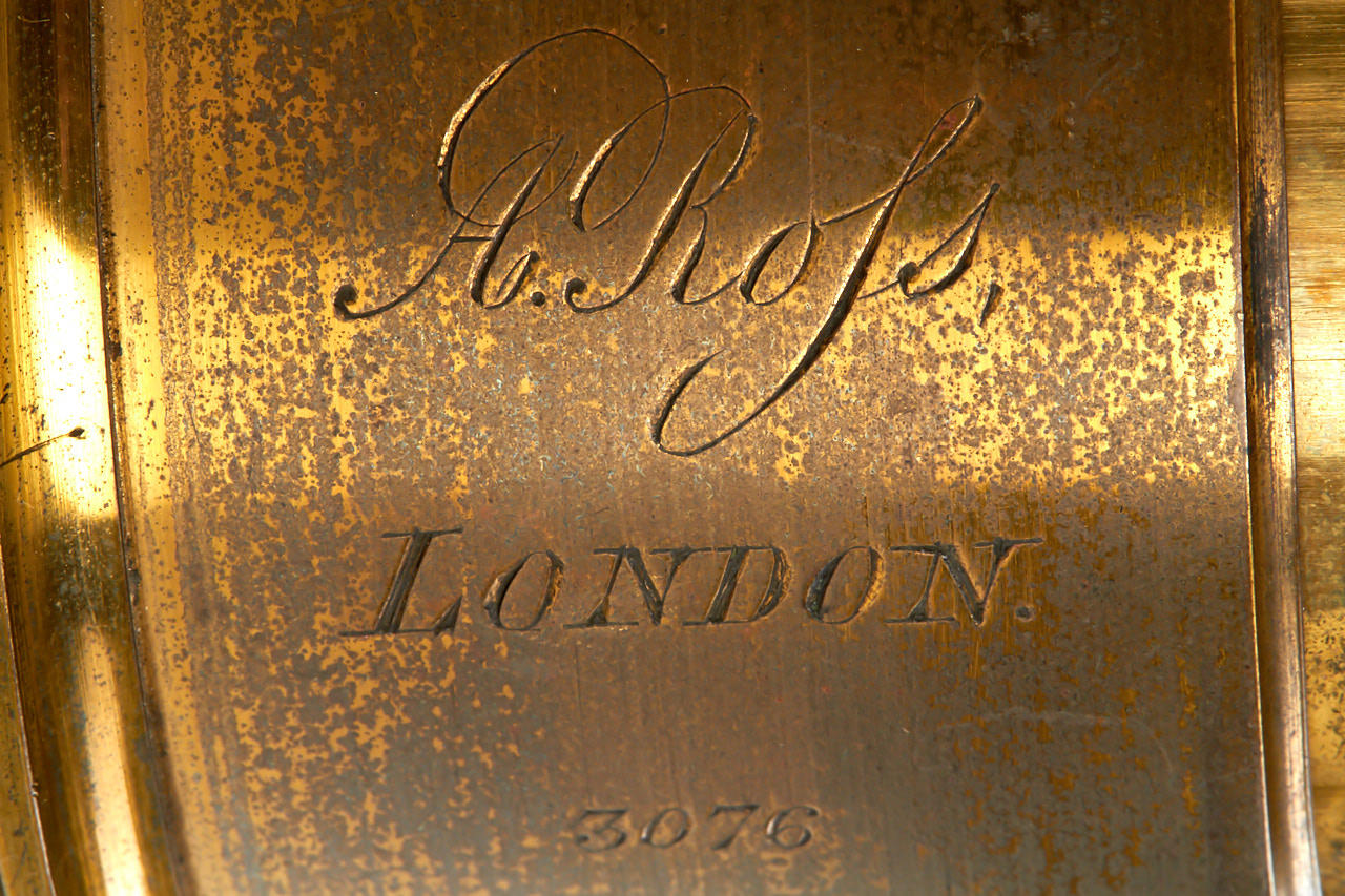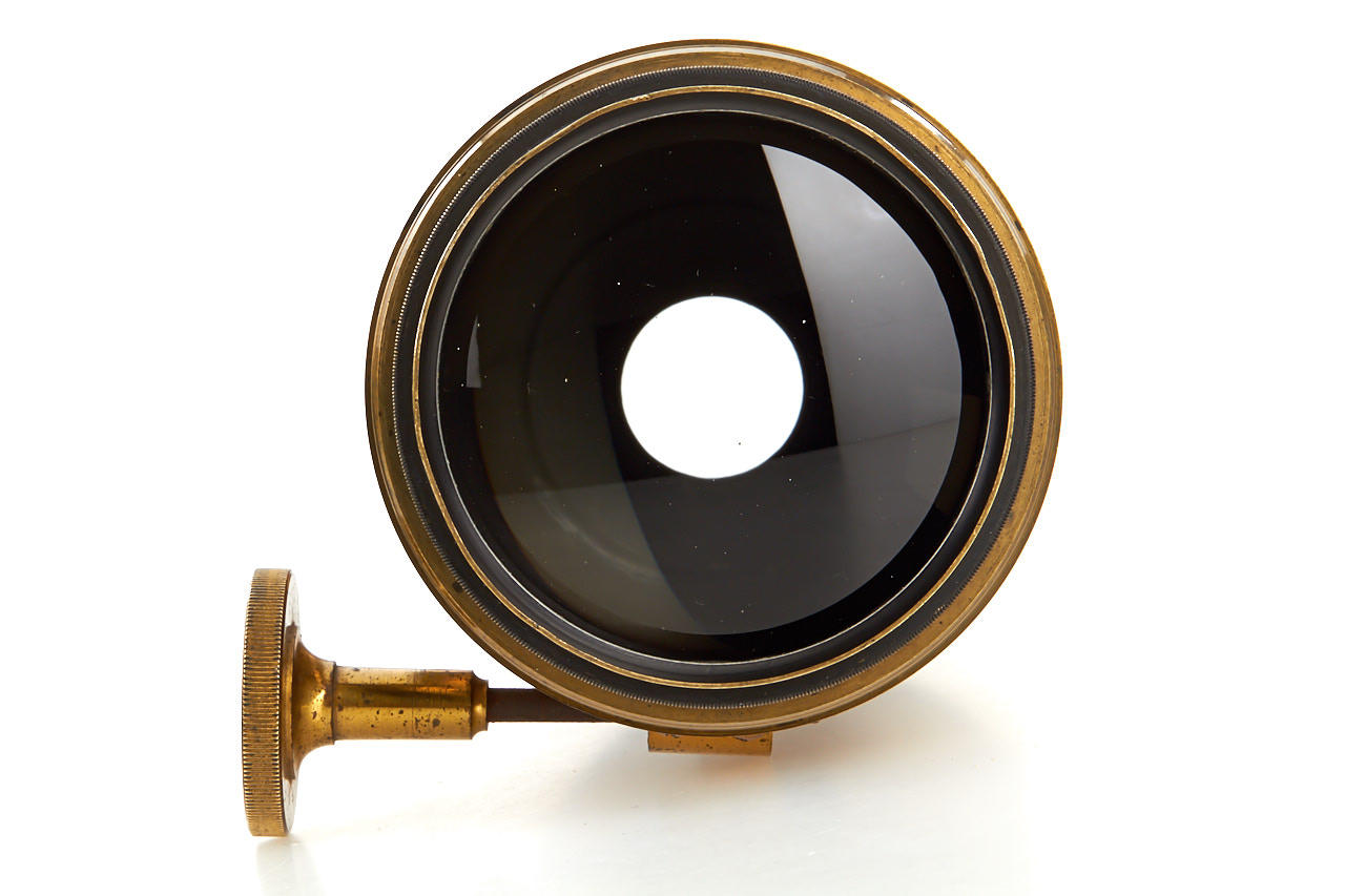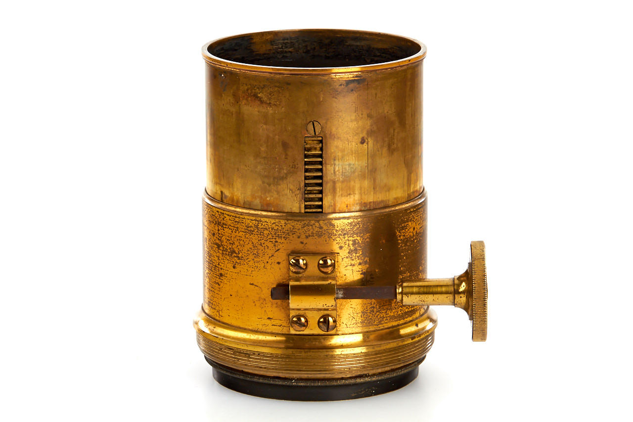 early Ross brass meniscus landscape lens in very good condition, focal length c.30cm, total height 11cm, early engraving style 'A. Rofs', rack and pinion focusing, good optics, with matching brass cap