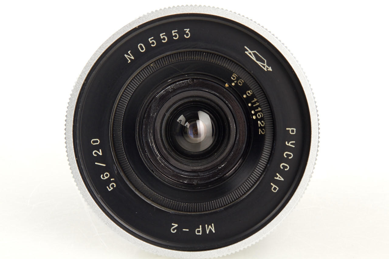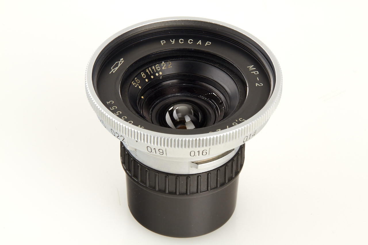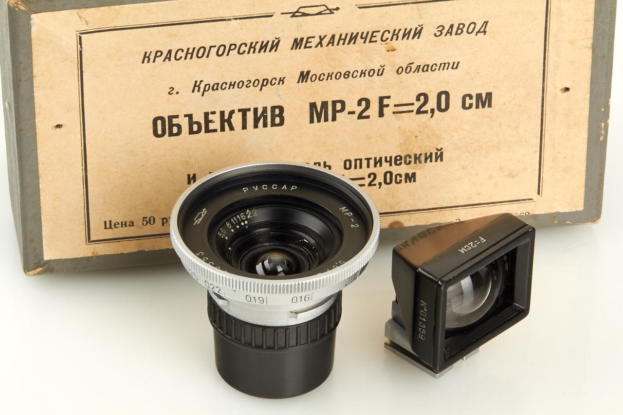 chrome Russar with Kiev mount, Kiev rear cap and Zenit front cap, keeper, matching finder in keeper, all in original grey maker's box - ex Barringer collection