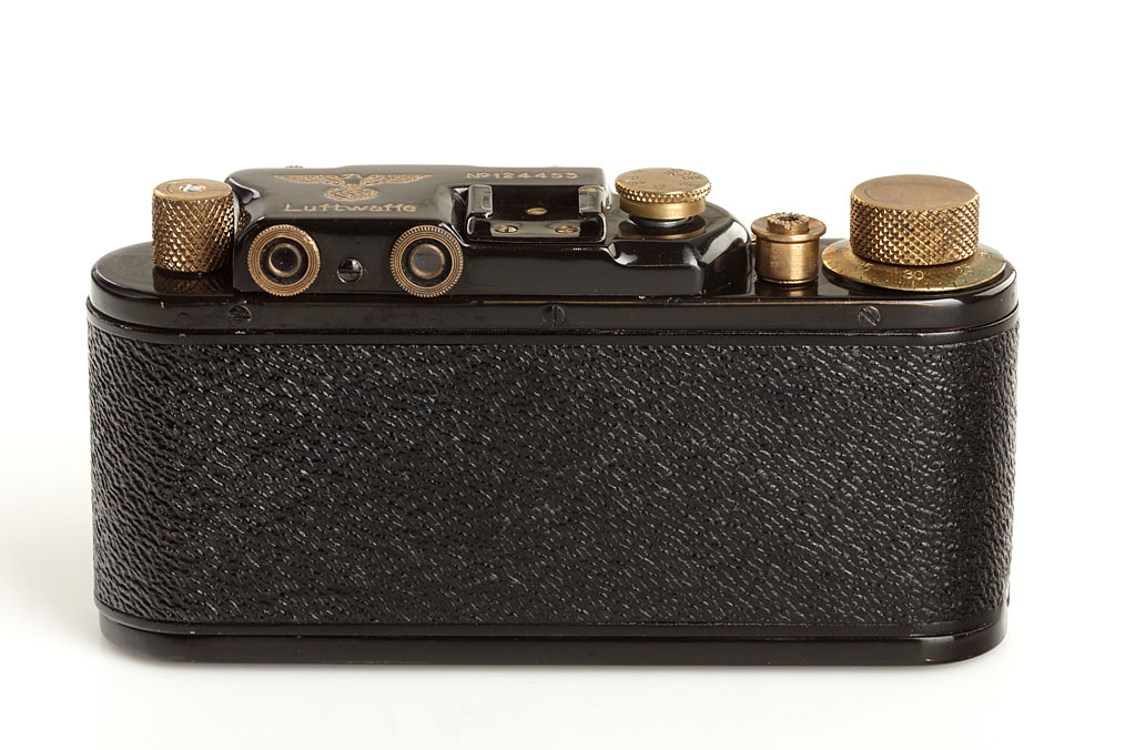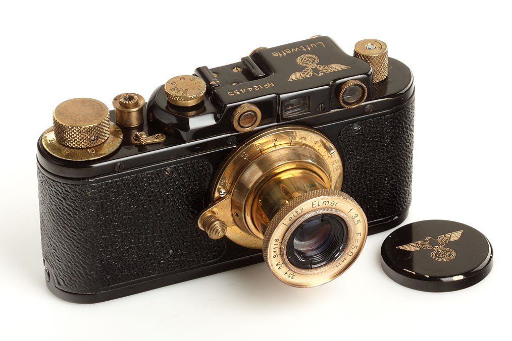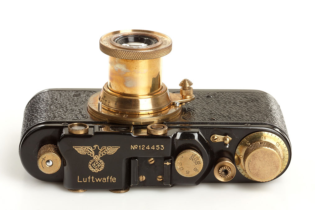 Zorki Id no.55151039 with Industar-22 3.5/5cm no.5125903, chrome BILDBERICHTER no.309741 with Swastika with wood-like covering, Elmar 3.5/50mm fake, cap with Swastika, black Luftwaffe Leica no.124453 with Swastika, brass fittings, Elmar 3.5/50mm fake, cap with Swastika, brass Leica II fake no.15279 with Elmar 3.5/50mm fake, brass cap, all in working order (4)