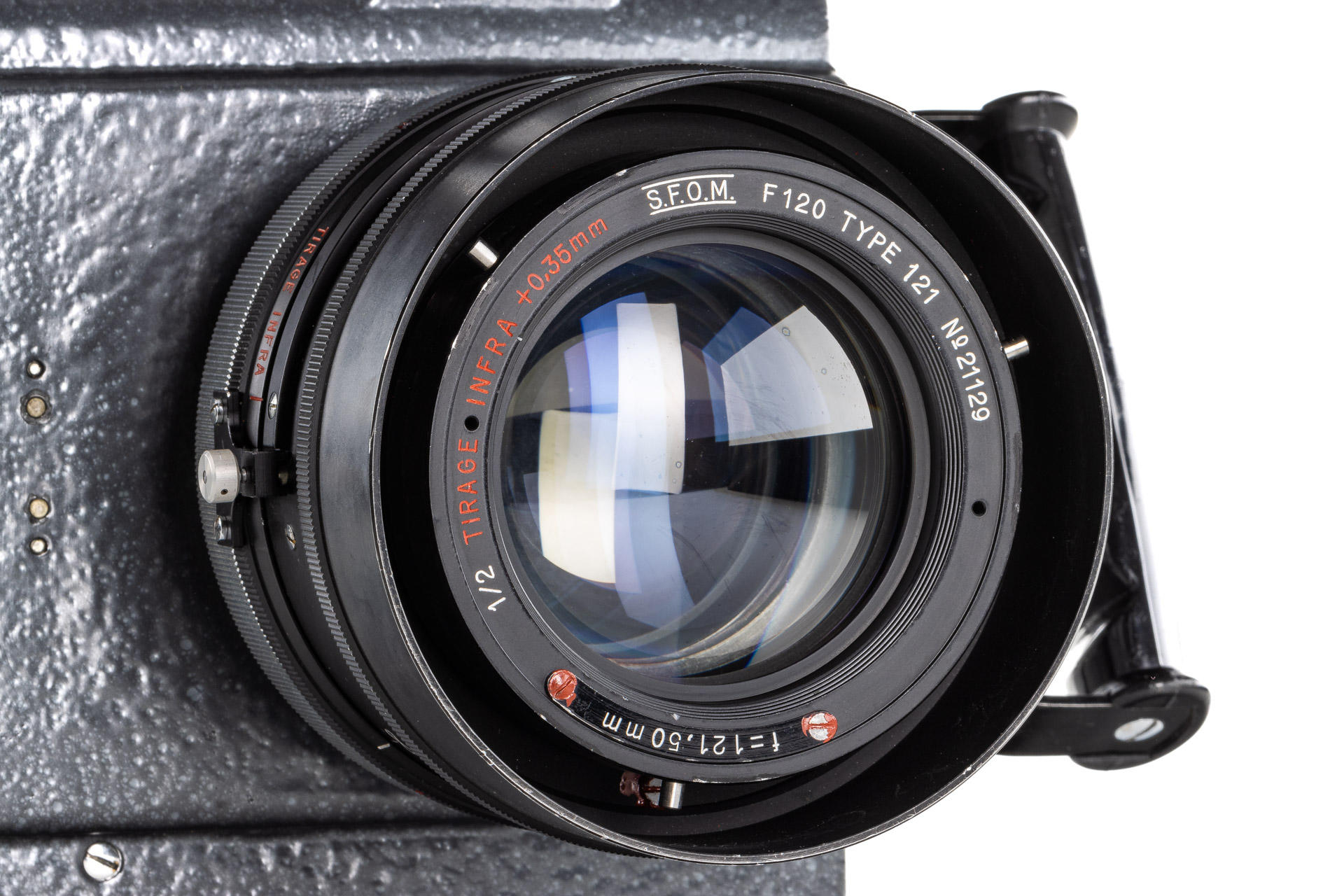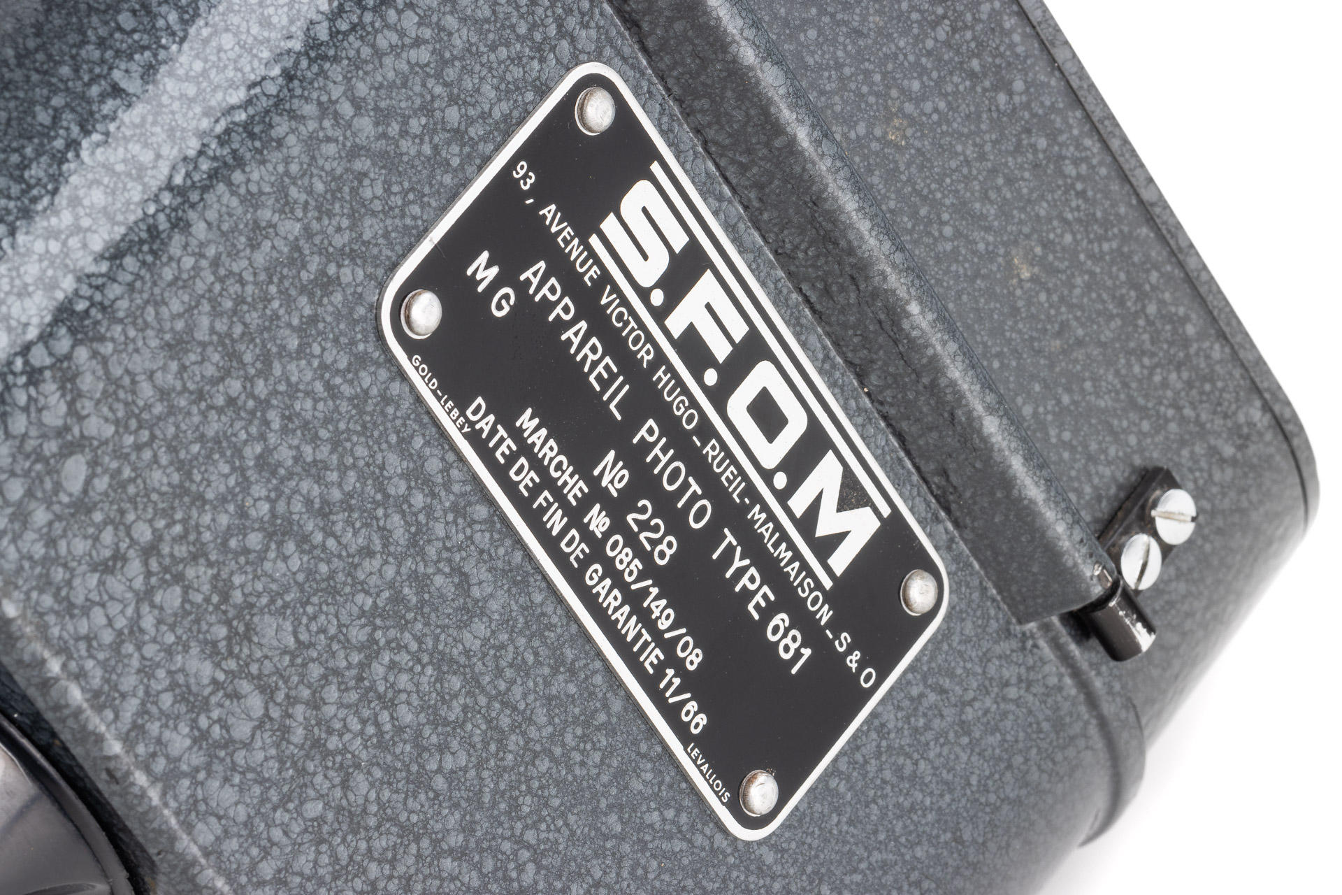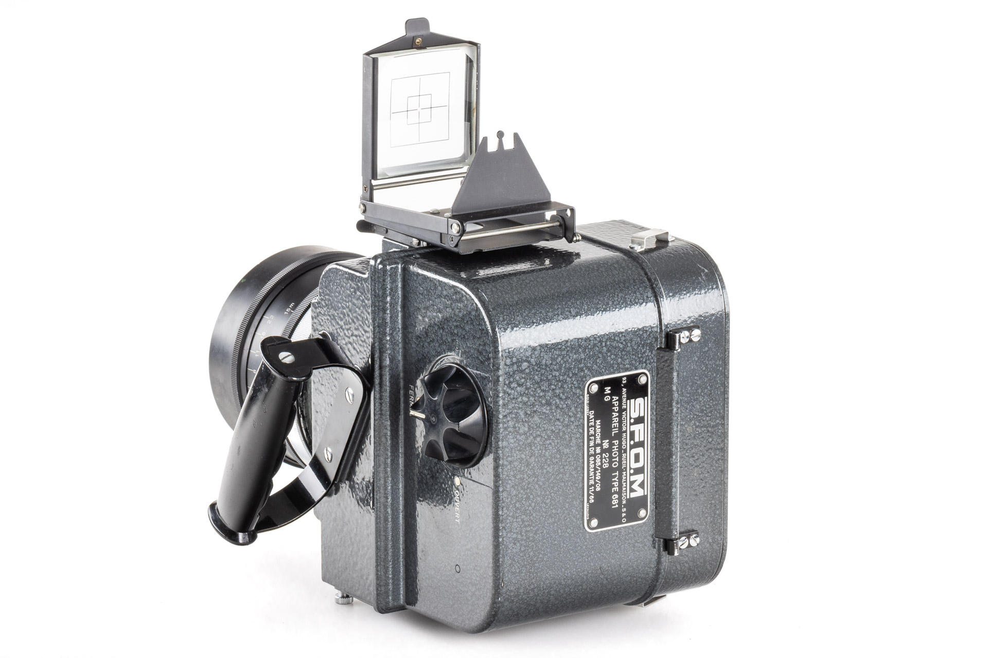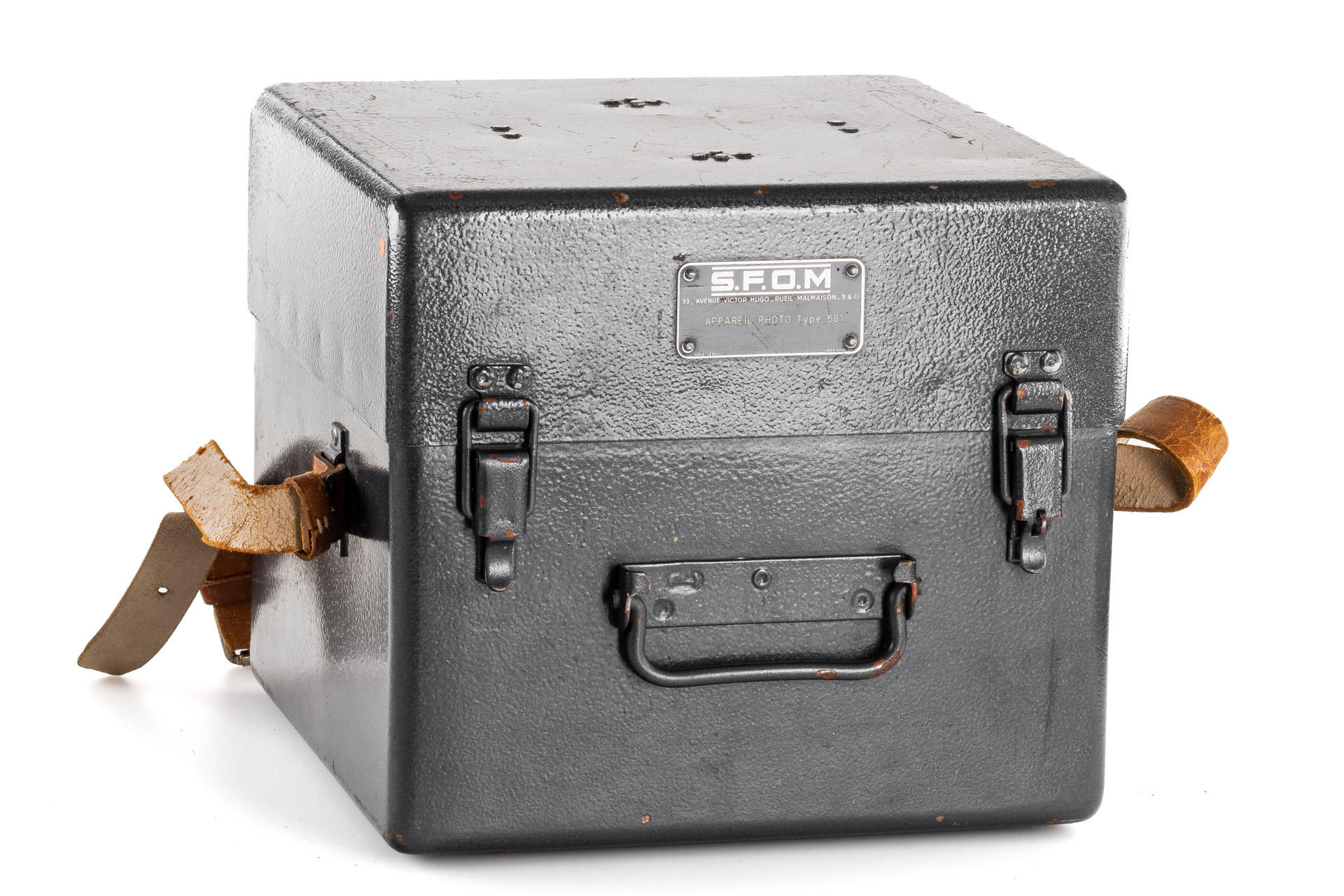 rare military aerial reconnaissance 6x7cm camera for 70mm film, in near mint condition and working order, with S.F.O.M. Cone F120 2/121.50mm no.21129 showing some haze and light cleaning marks (front lens cap), with 3 interchangeable shutters 1/300-1/500-1/1000, yellow, red and IR filters, finder, 2x spools, French instructions, leather strap and special hard case