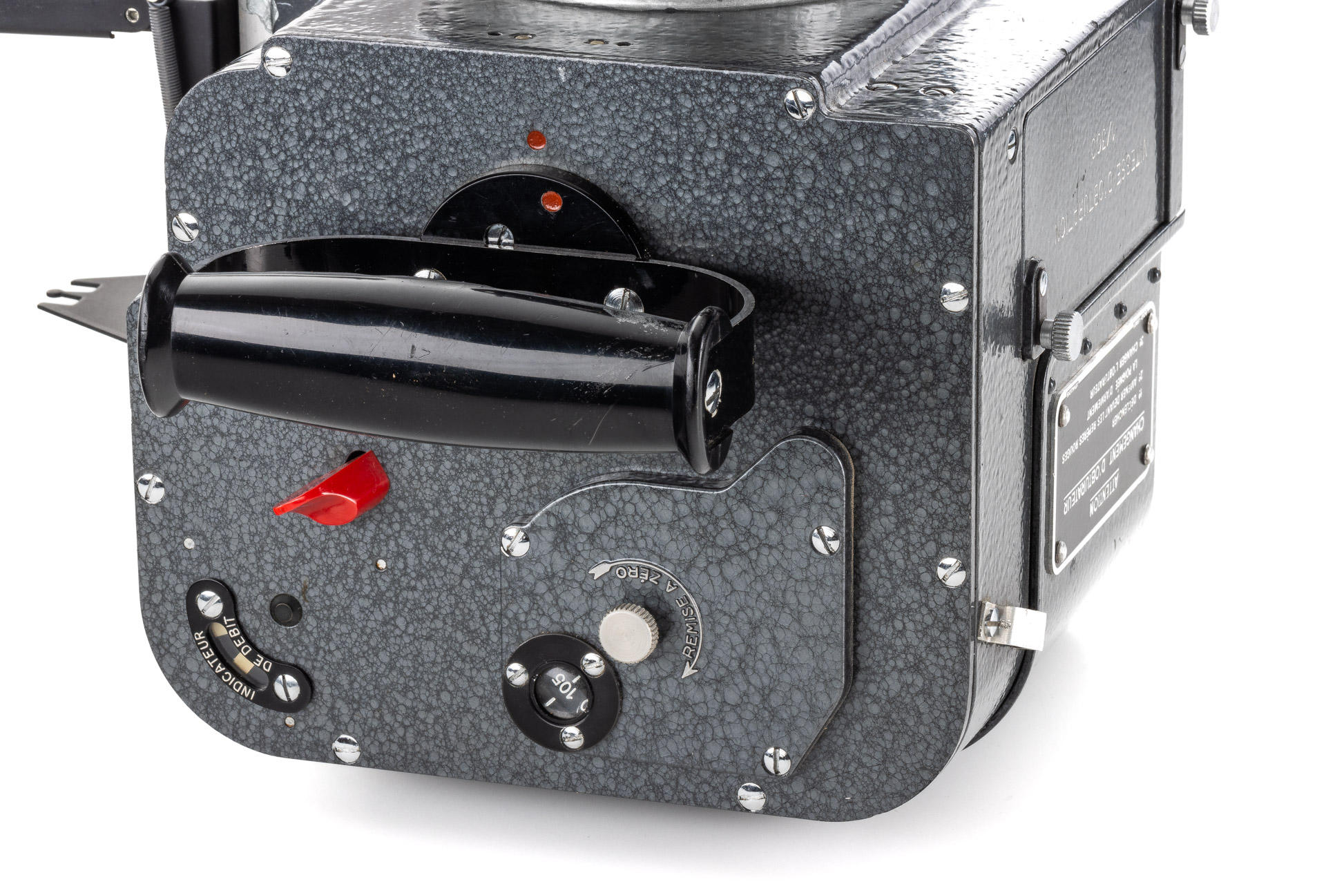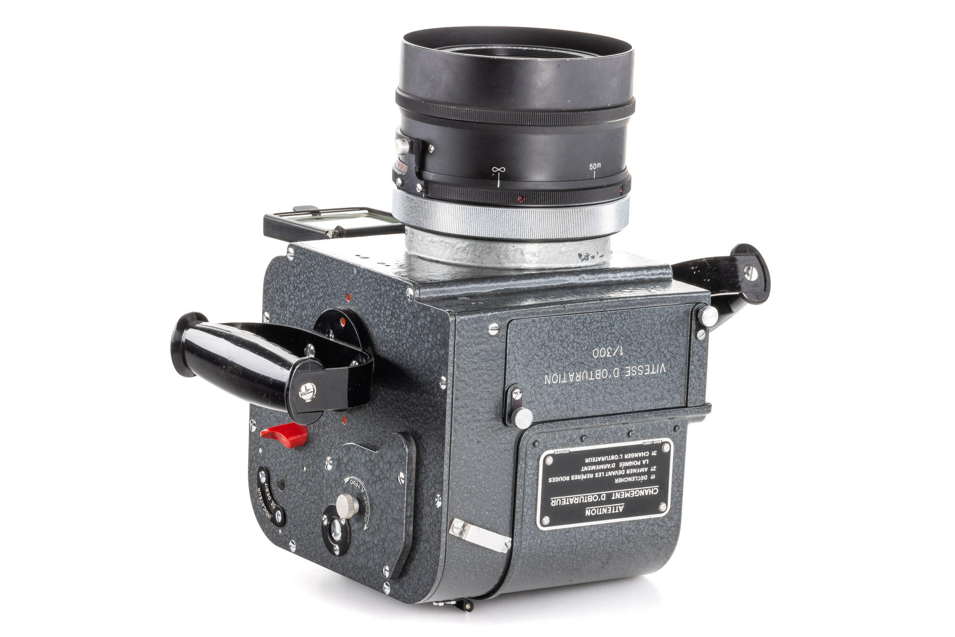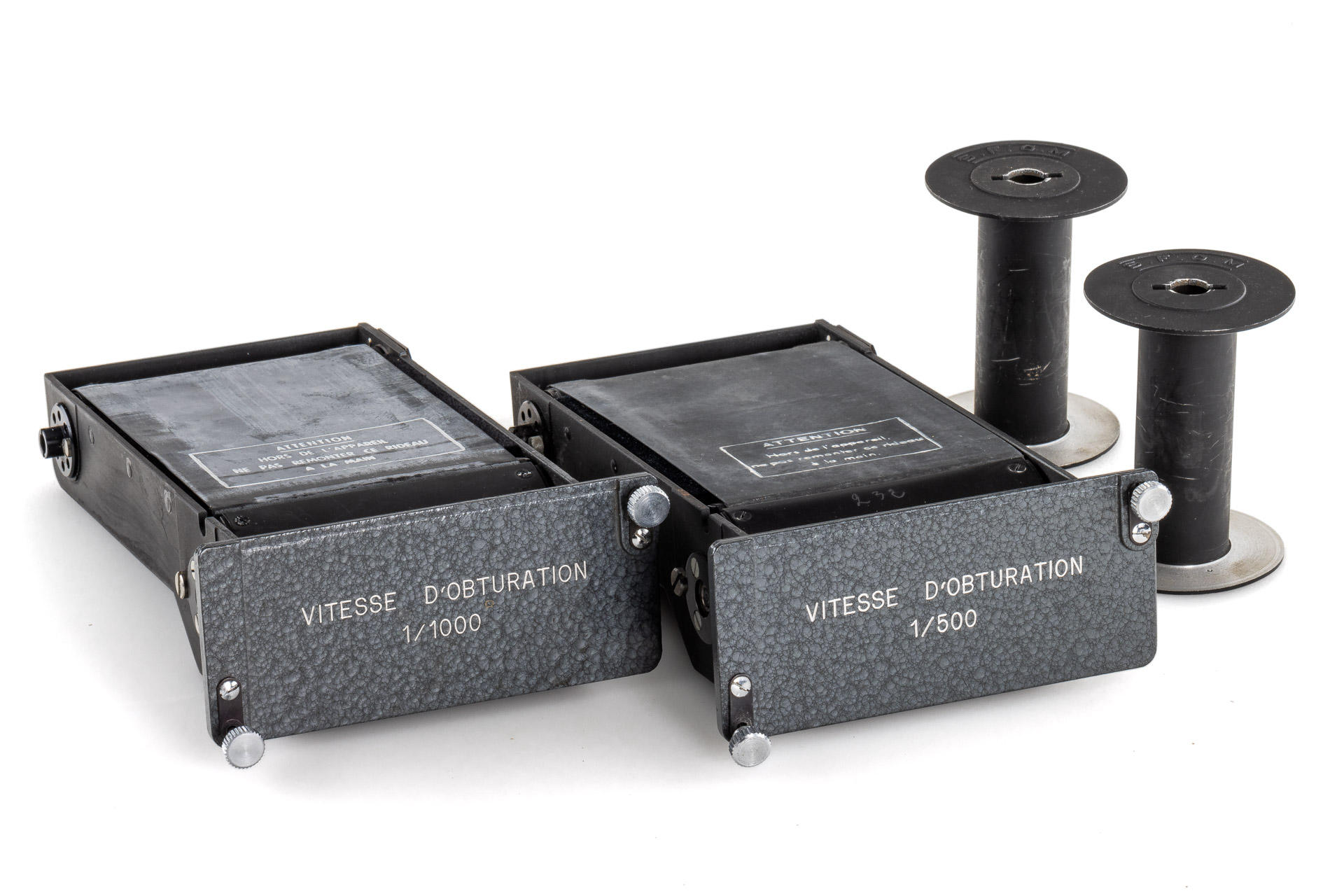 rare military aerial reconnaissance 6x7cm camera for 70mm film, in near mint condition and working order, with S.F.O.M. Cone F120 2/121.50mm no.21129 showing some haze and light cleaning marks (front lens cap), with 3 interchangeable shutters 1/300-1/500-1/1000, yellow, red and IR filters, finder, 2x spools, French instructions, leather strap and special hard case