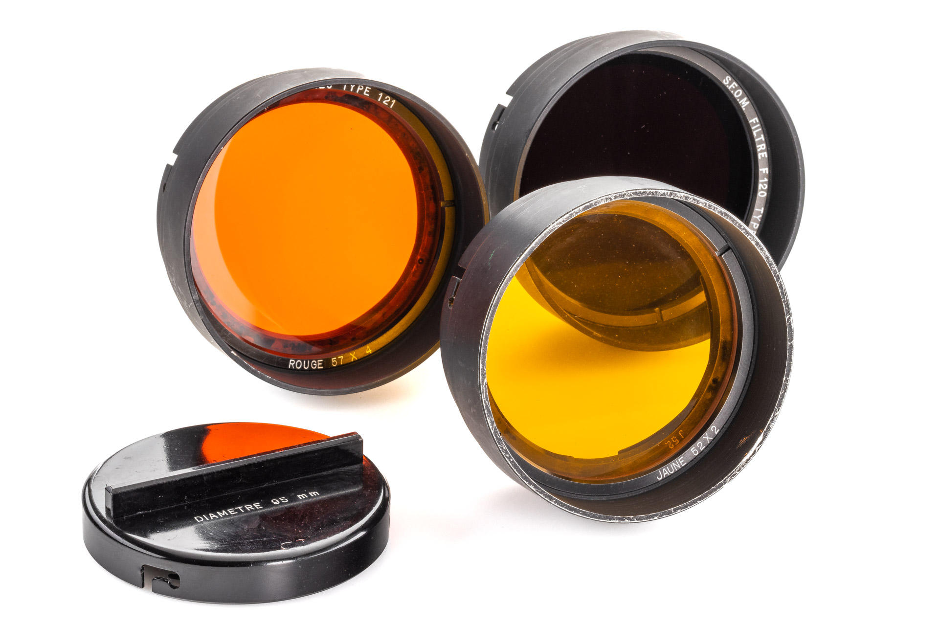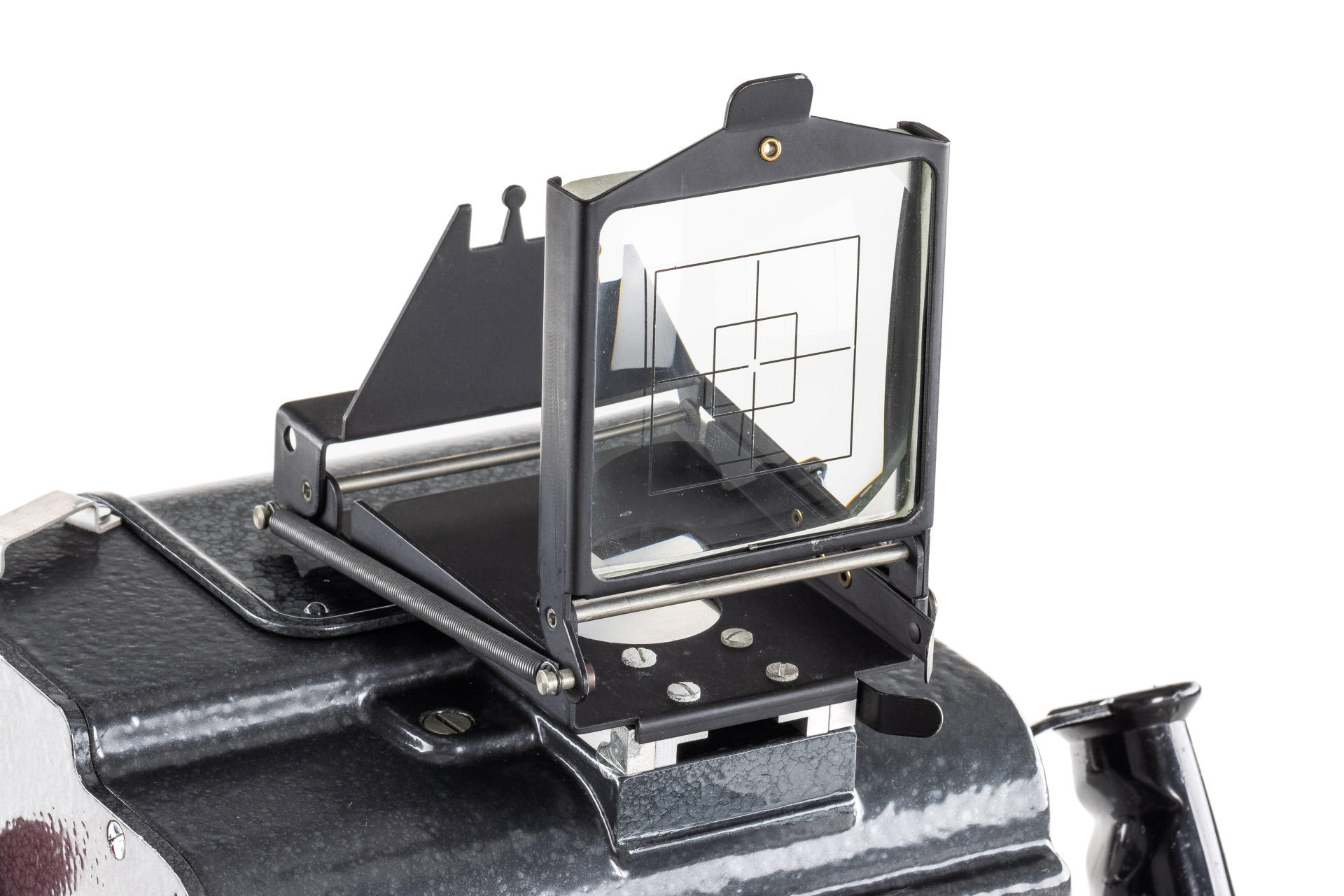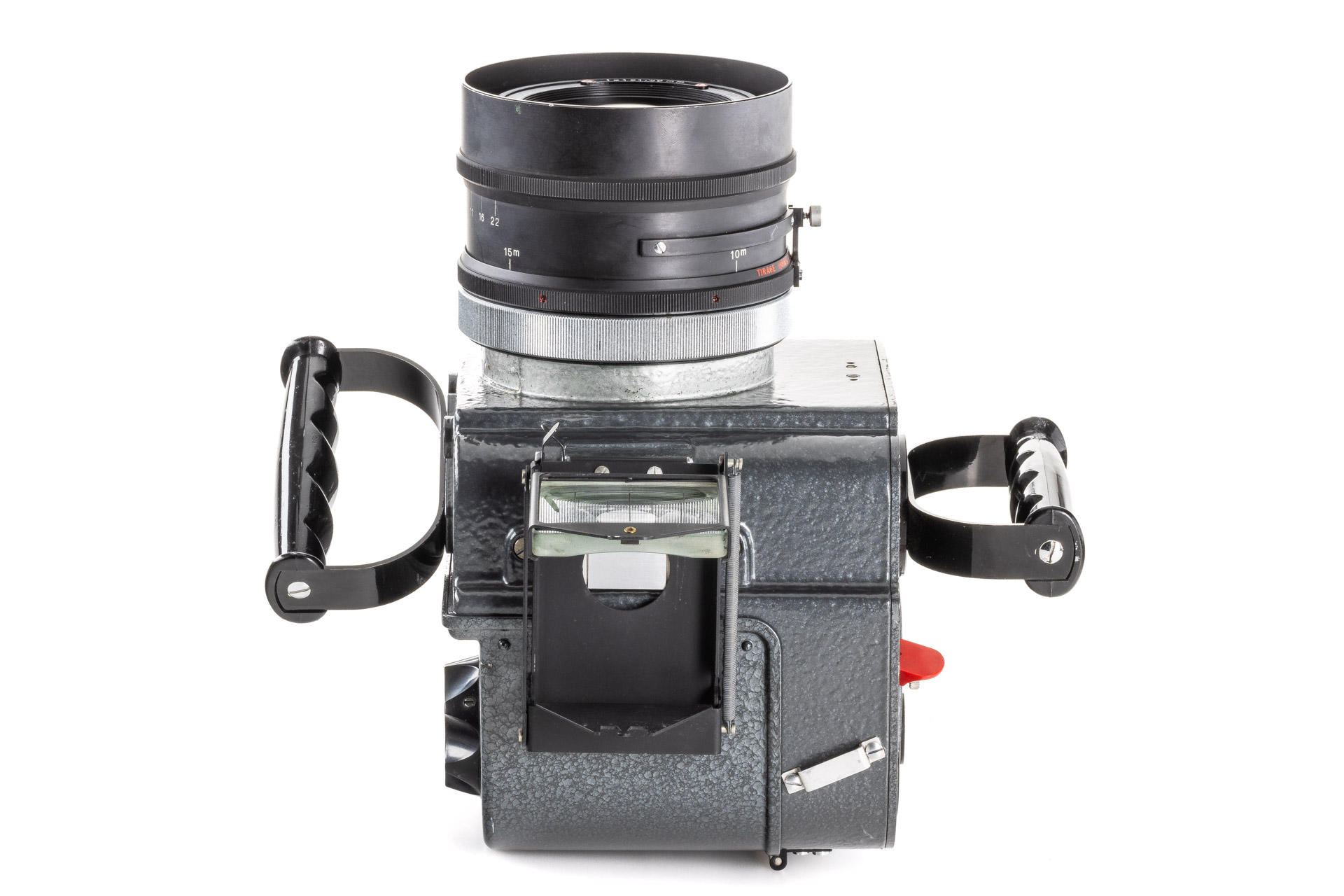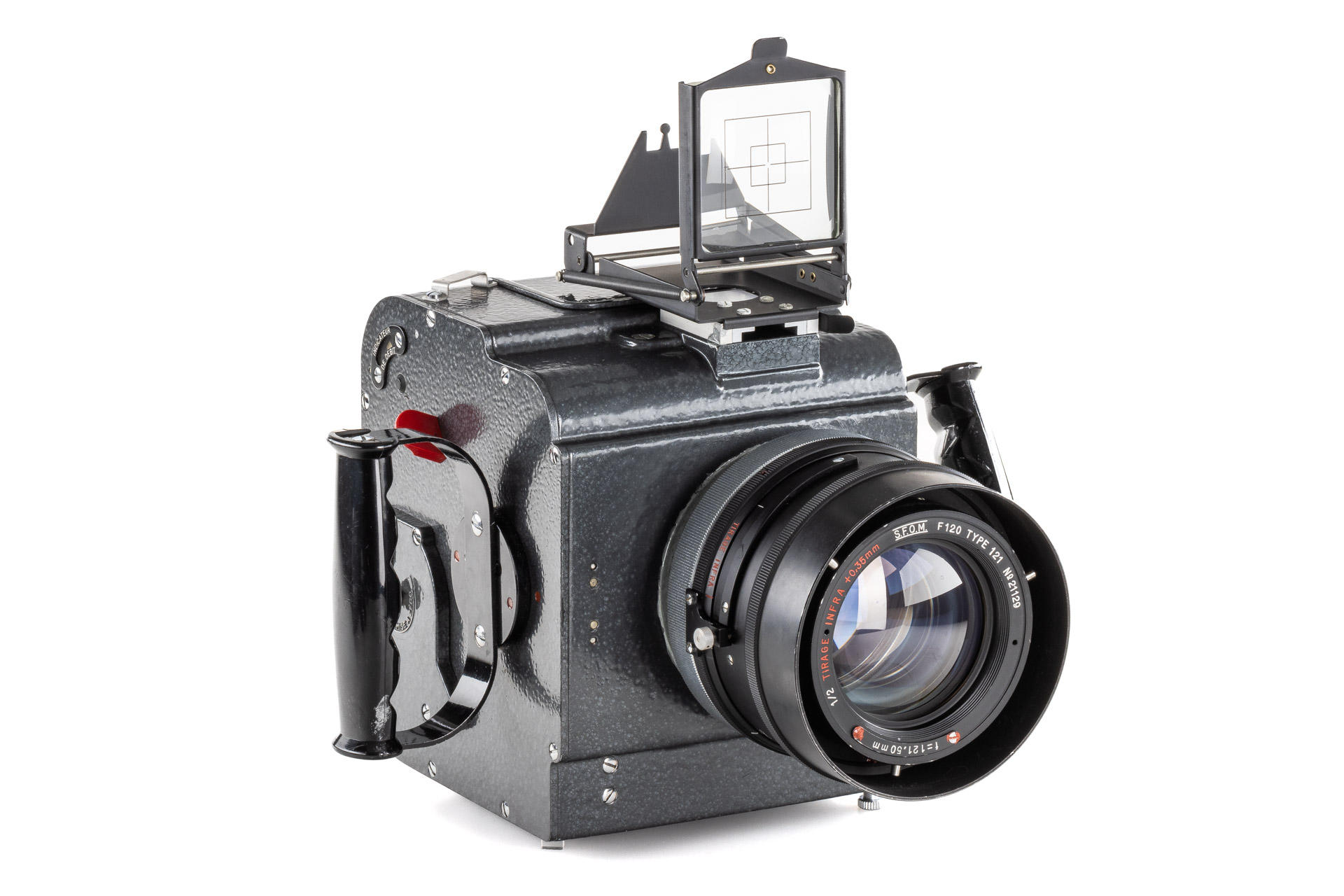 rare military aerial reconnaissance 6x7cm camera for 70mm film, in near mint condition and working order, with S.F.O.M. Cone F120 2/121.50mm no.21129 showing some haze and light cleaning marks (front lens cap), with 3 interchangeable shutters 1/300-1/500-1/1000, yellow, red and IR filters, finder, 2x spools, French instructions, leather strap and special hard case