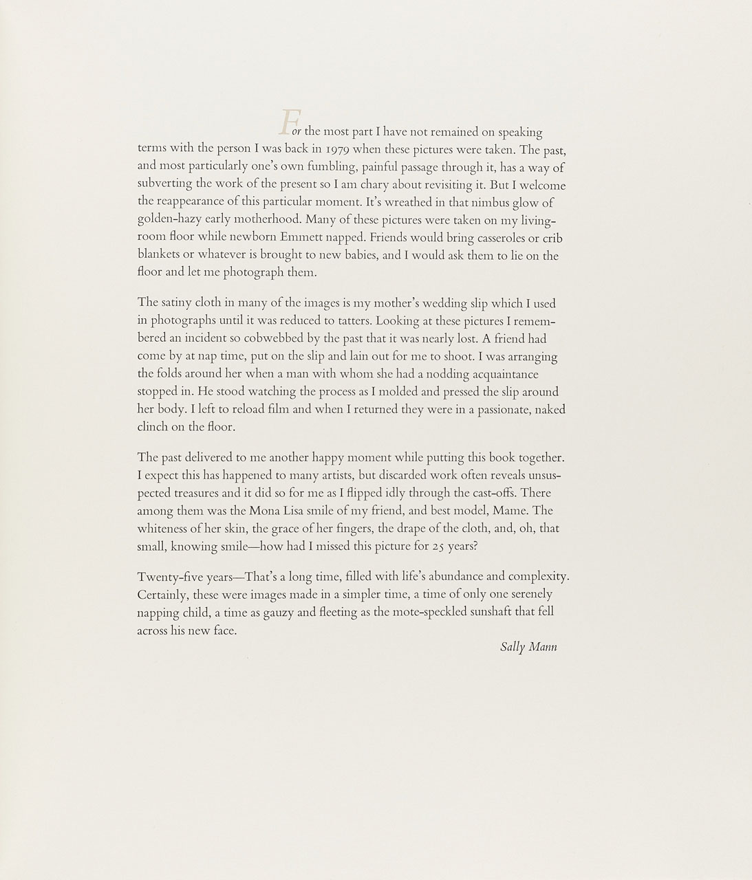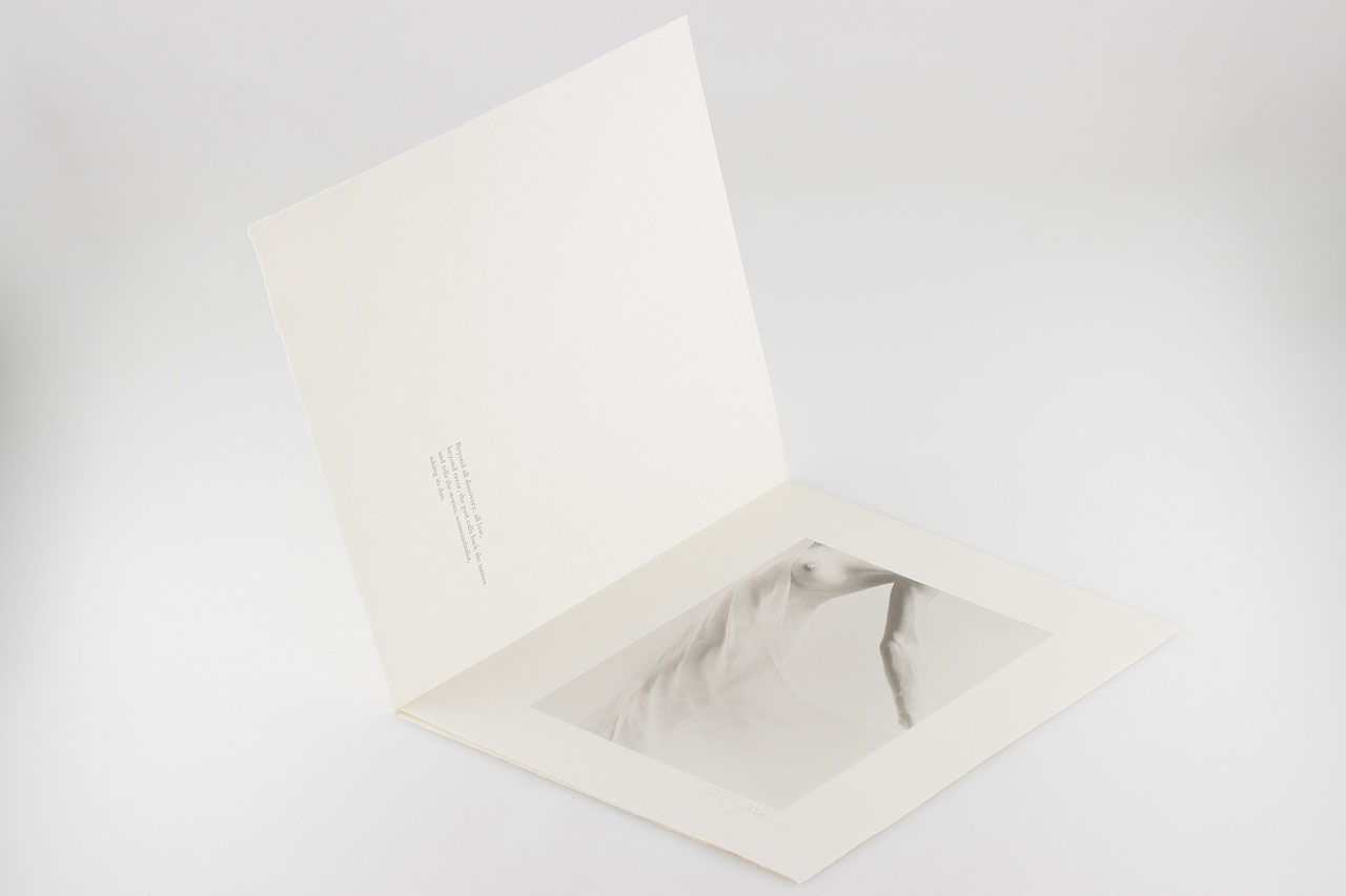 Sally Mann brings together many of the most graceful and sensuous early figure and drapery studies created by this internationally acclaimed artist. This precious platinum series volume is a true livre d'artiste, as the introduction and all of the accompanying poems were written by the artist herself. Each signed and numbered copy of Sally Mann is hand-bound, printed in letterpress on handmade cotton rag paper, and delivered in a unique case created to complement the exquisite binding. Hand coated platinum prints by Stan Klimek. Paper by Twinrocker. Hand binding by Sarah Creighton. Letterpress printing by Michael Russem."