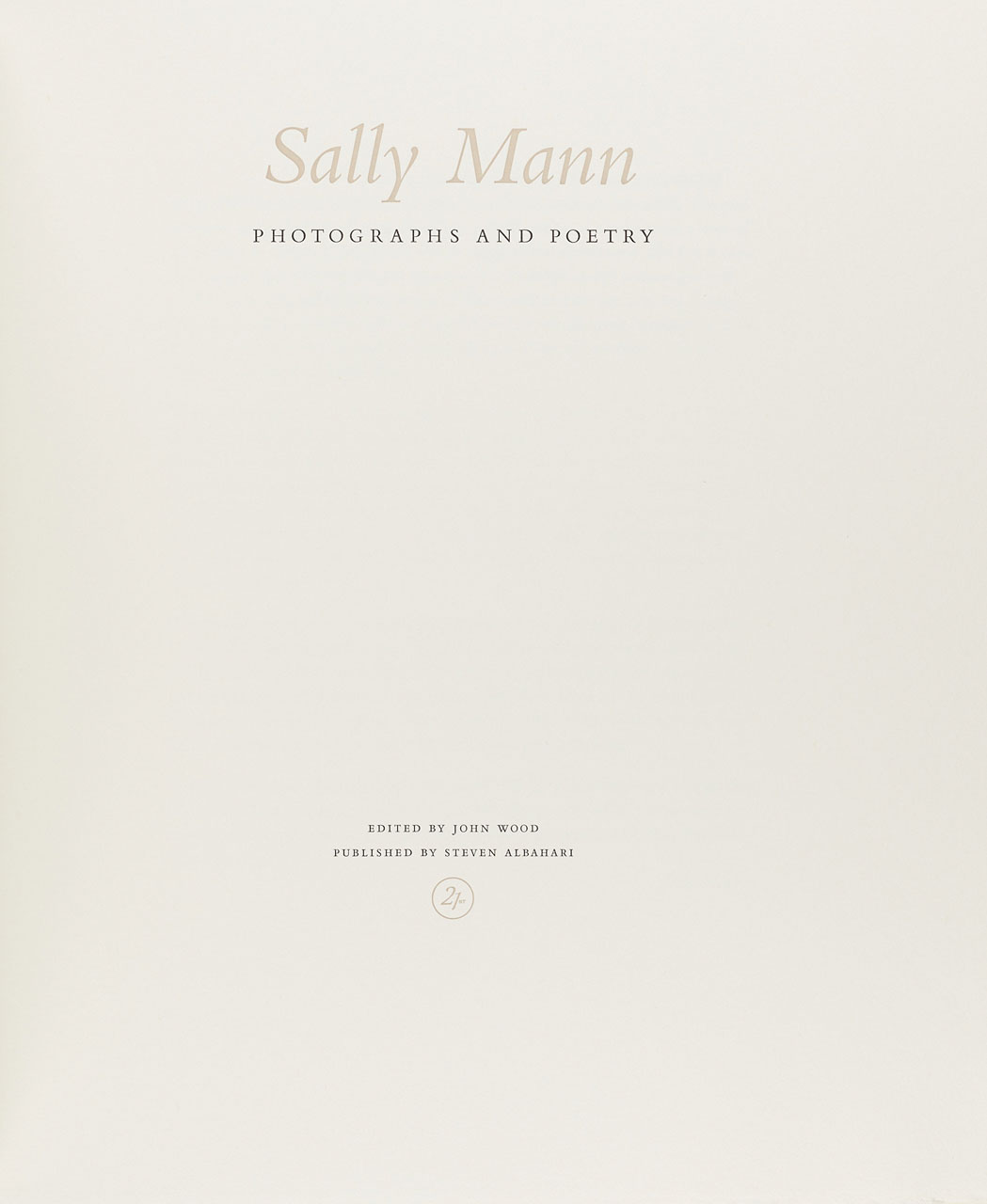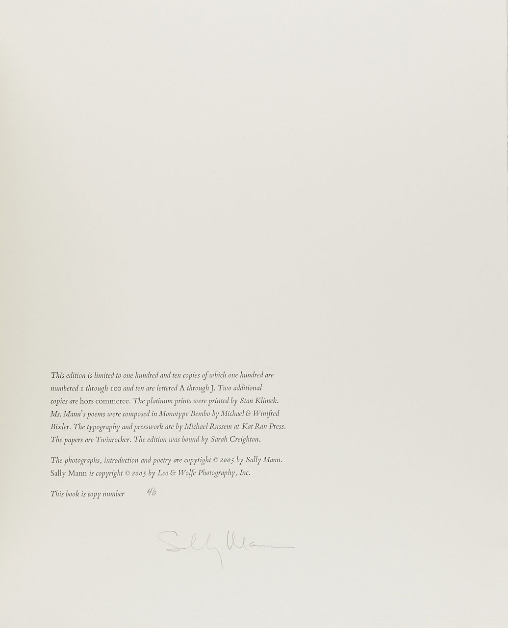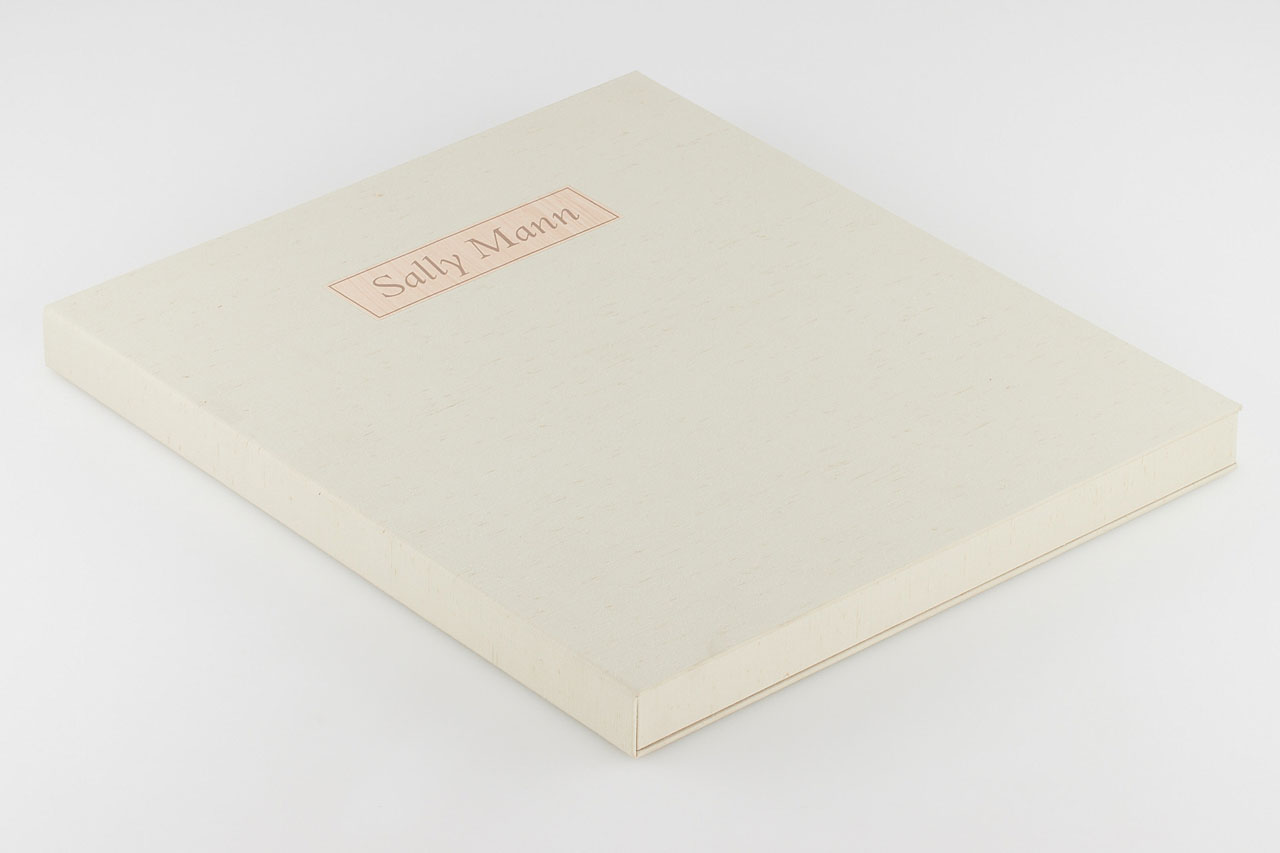 Magnificent 21st Platinum Limited Edition of 100 signed and numbered copies (this being copy number 46) and 10 lettered copies, includes a signed freestanding platinum print (image measures 9.8 x 7.4 in, paper 13.8 x 11.8 in), signed in pencil on lower right margin by Mann and accompanied by a poem. Hardcover, buff paper-covered boards with title stamped in silver on cover; contained in a buff raw silk cloth-covered clamshell box, photographs, introduction and poetry by Sally Mann. Edited by John Wood. Unpaginated, with ten bound platinum prints signed (monogrammed) in pencil in the margin by Mann, with the original wooden box (scarce) in which the box was delivered.