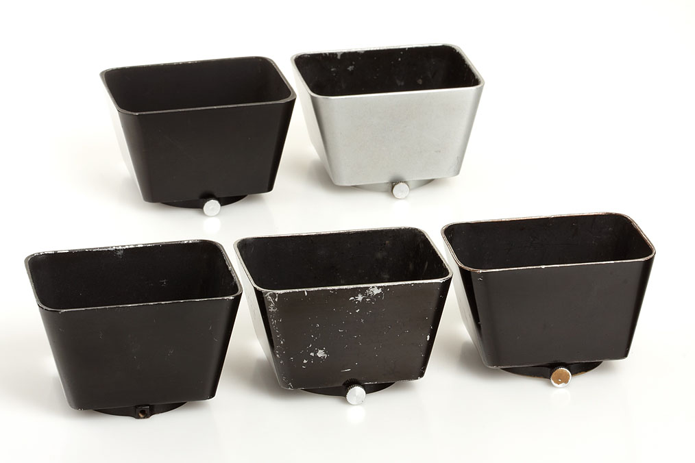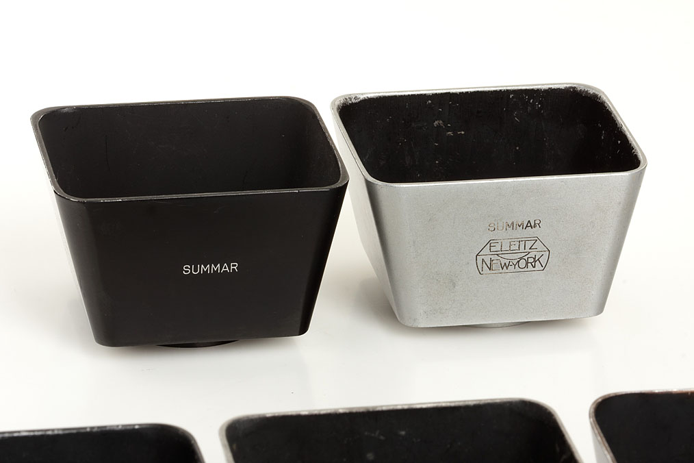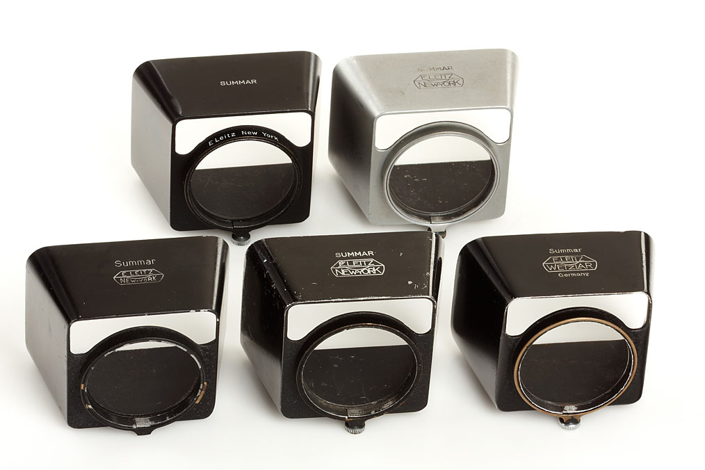 5 different Leitz hoods for Summar 2/5cm (1x black E.Leitz Wetzlar, 3x black E.Leitz New York, 1x chrome E.Leitz New York) (5)