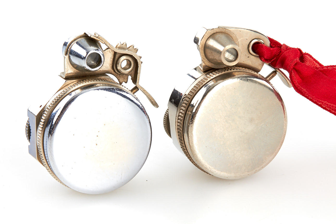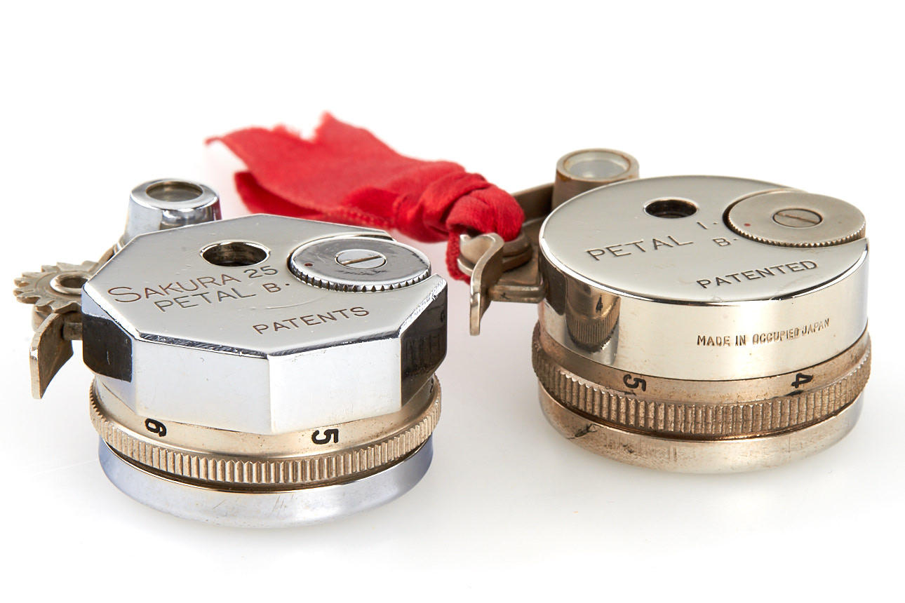 two Japanese miniature cameras for 6 exposures on circular film (1) rare octagonal model, (2) more common round model, both in excellent condition, each with the film magazine