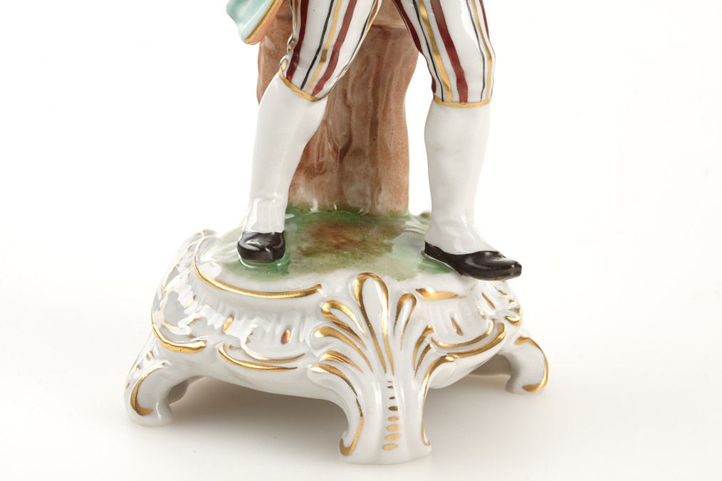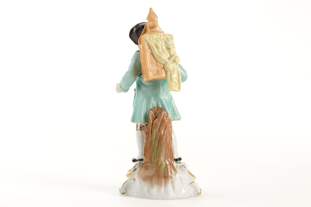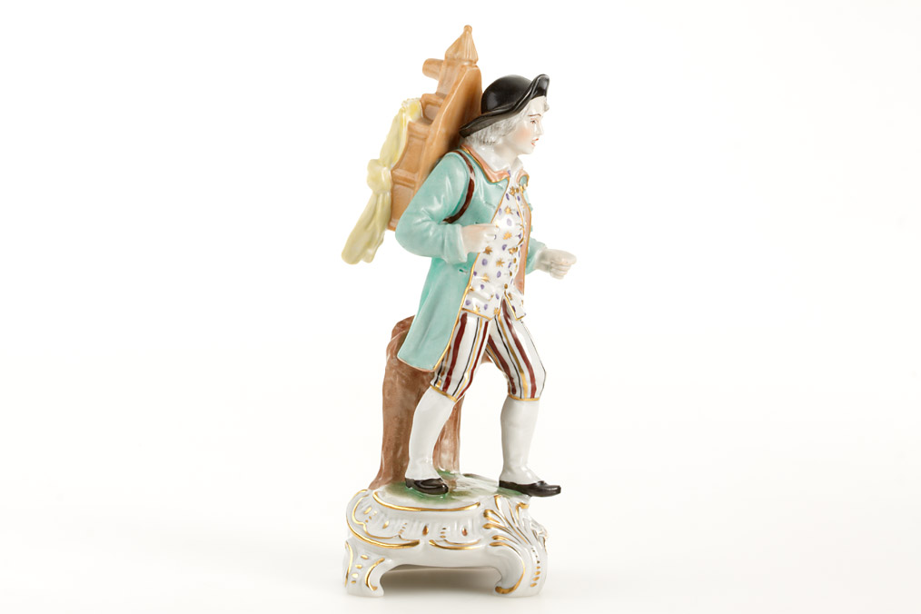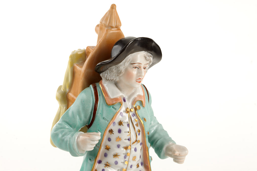 rare and beautiful porcelain figure of a travelling showman carrying a magic lantern on his back, made by Samson, marked with a cross on verso. By the mid 1900's Samson was a well known porcelain manufacturer specialized in copying well known and classic designs from all periods and countries. The offered figure shows clear reference to a similar figure produced by Meissen in 1756 and was modelled after a well known 18th century copper print. The figure is in perfect condition. Height: 19cm.