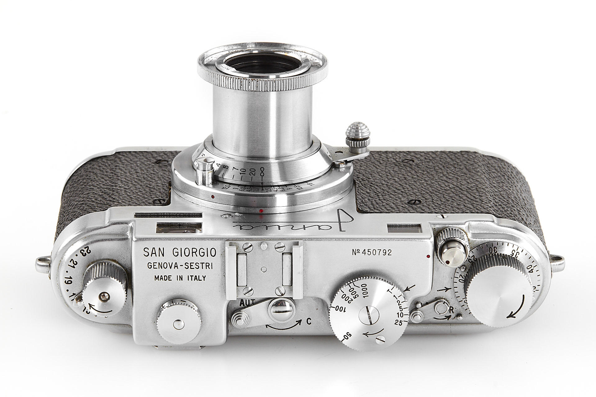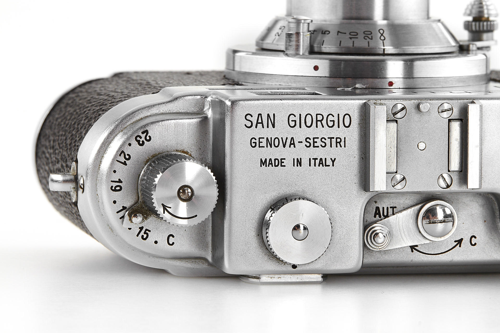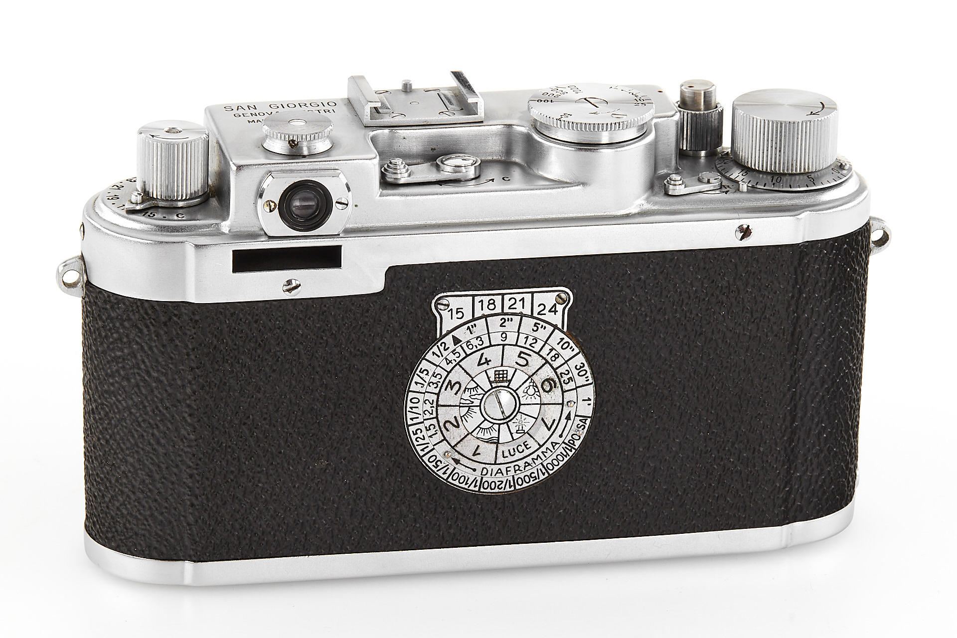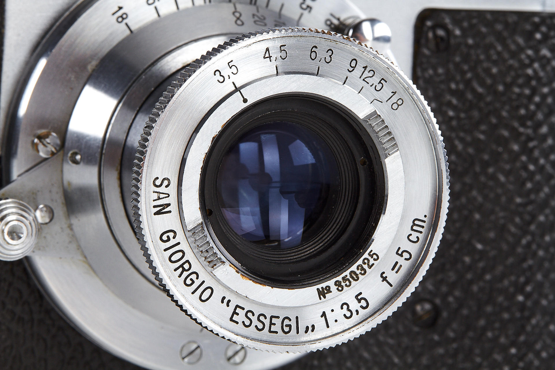 very rare Italian Leica copy in excellent cosmetic condition and in good working order, built-in extinction light meter, rangefinder and viewfinder combined in a single eyepiece, with collapsible Essegi 3.5/5cm no.350325, original leather case
