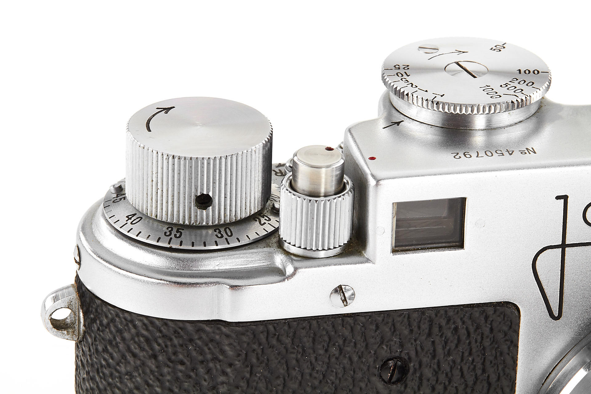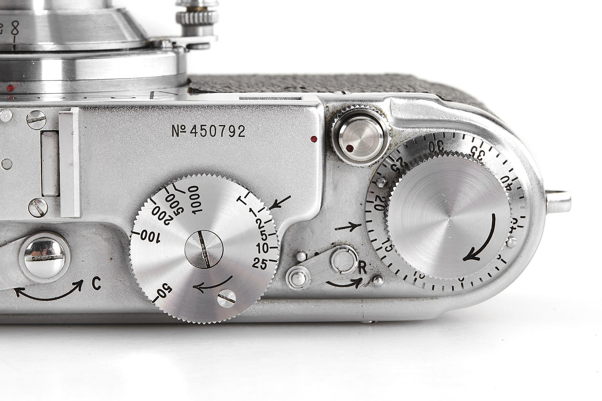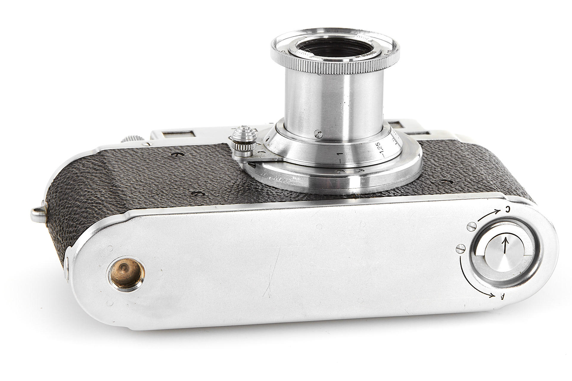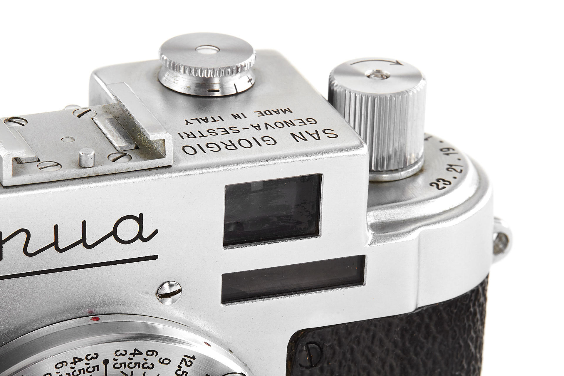 very rare Italian Leica copy in excellent cosmetic condition and in good working order, built-in extinction light meter, rangefinder and viewfinder combined in a single eyepiece, with collapsible Essegi 3.5/5cm no.350325, original leather case