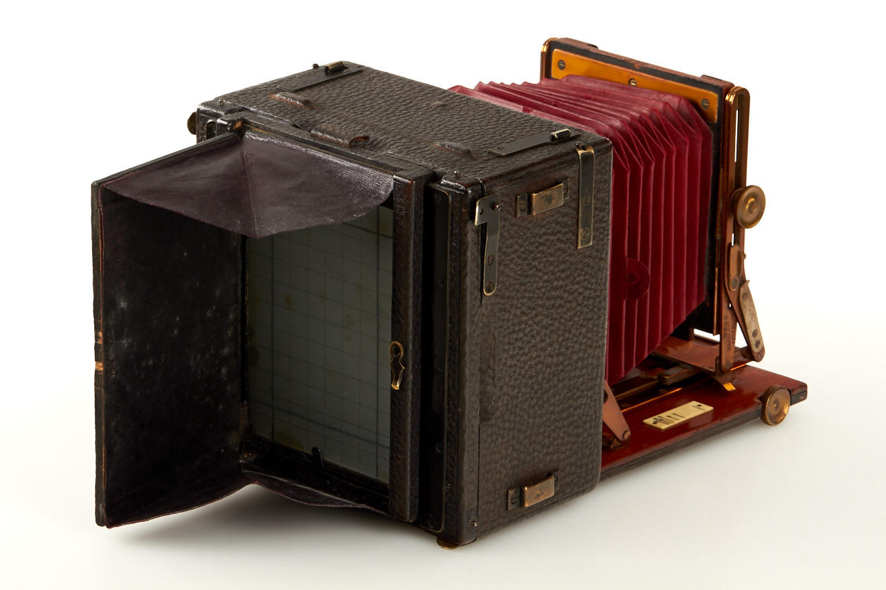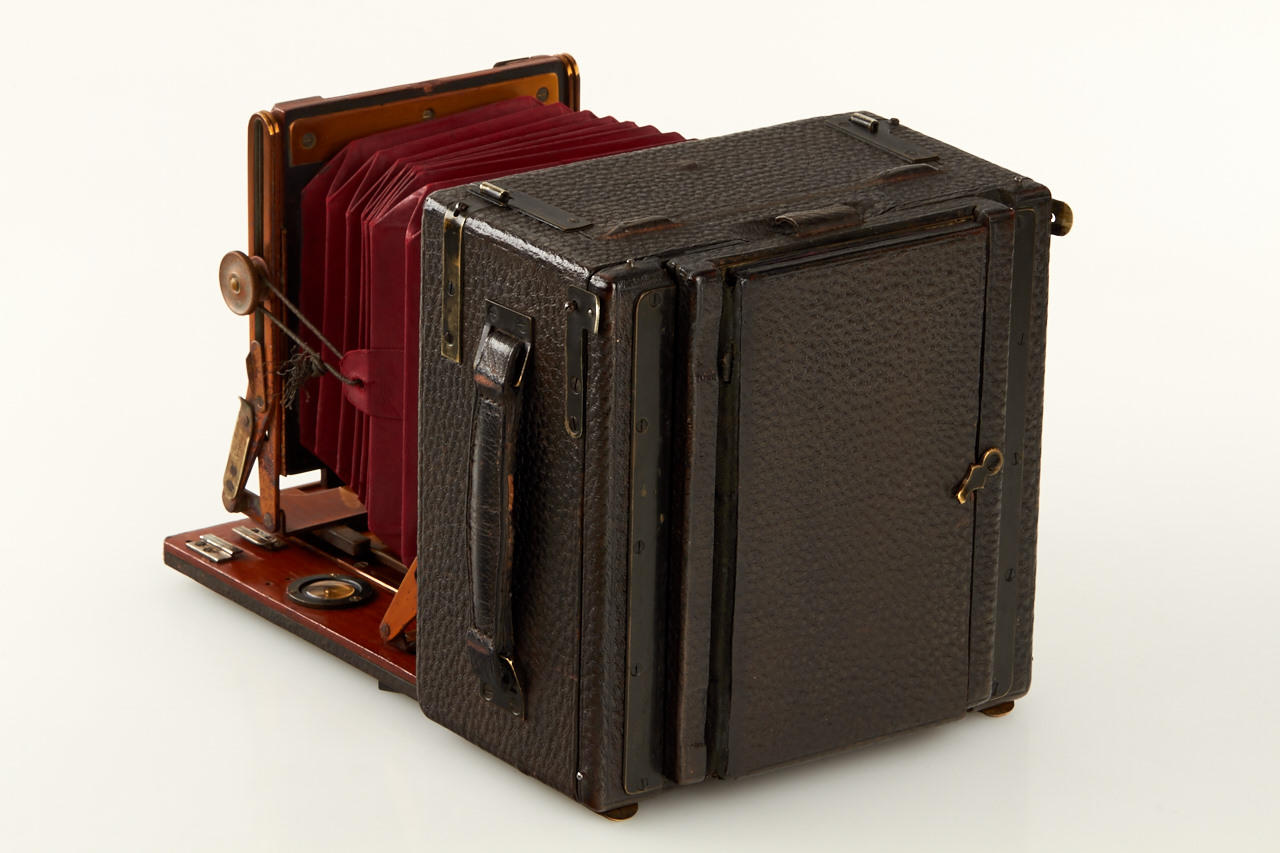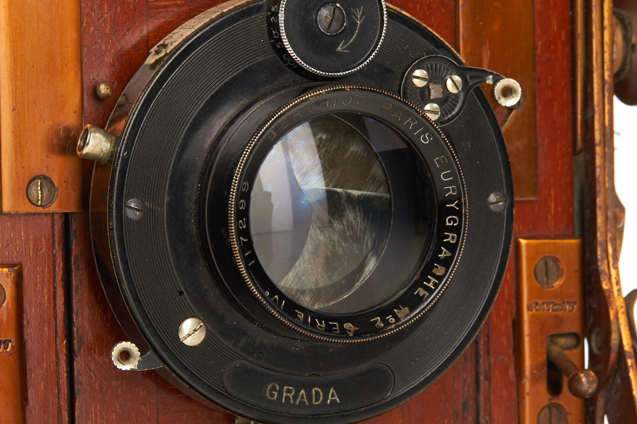 folding plate camera with finely polished wooden interior, 3 1/4 x 4 1/2 plate size, leather-covered brown exterior, with Berthiot Eurygraphe No.2 Serie IV in Grada shutter