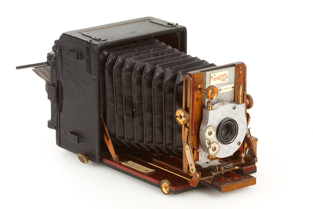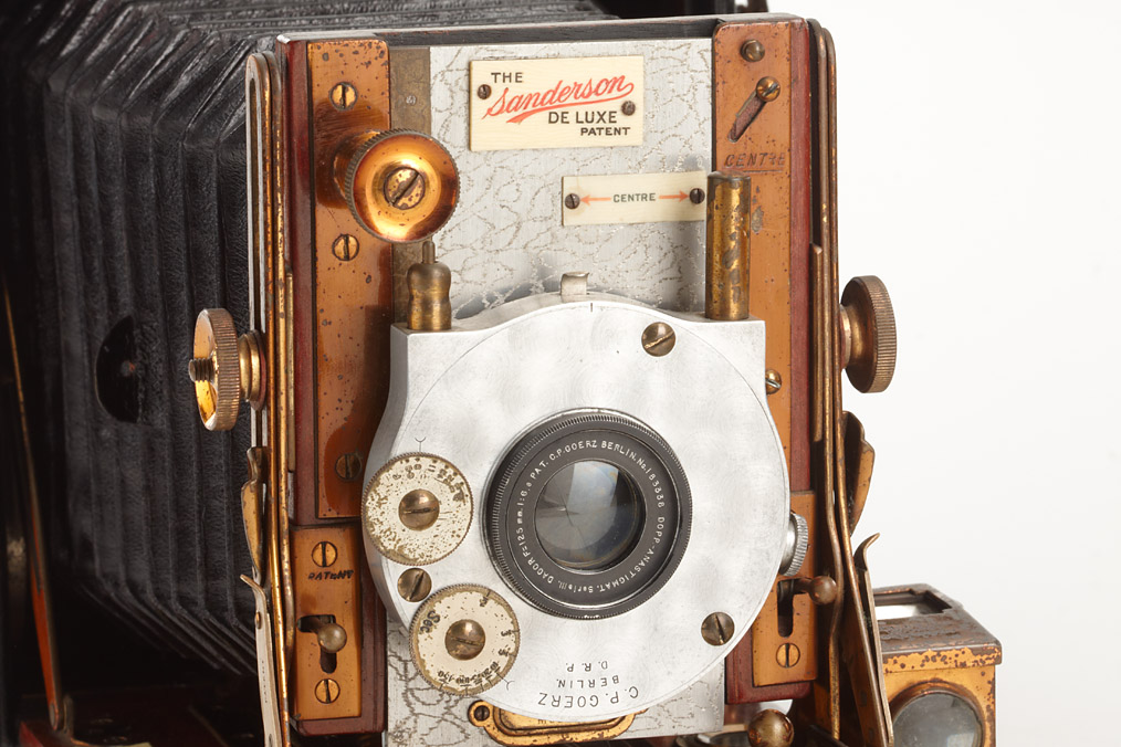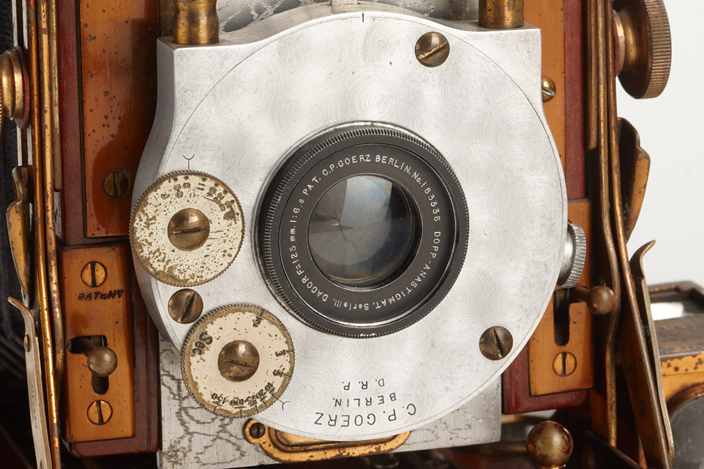 3 ¼ x 4 ¼“ (ca. 8x10cm), polished wood interior, heavy leather covering, brass fittings, Goerz Dagor 6.8/125mm Serie III no.183338 in Goerz shutter, ground glass screen, front door doesn't close, 4x double platefilm holders, all in matching case