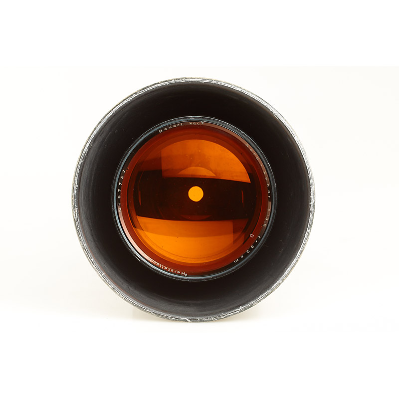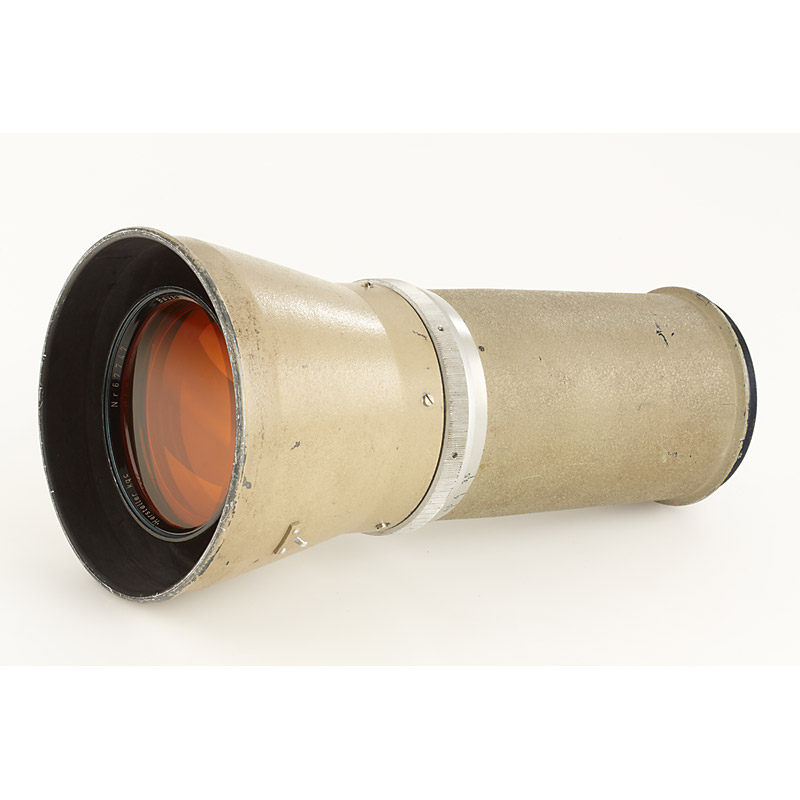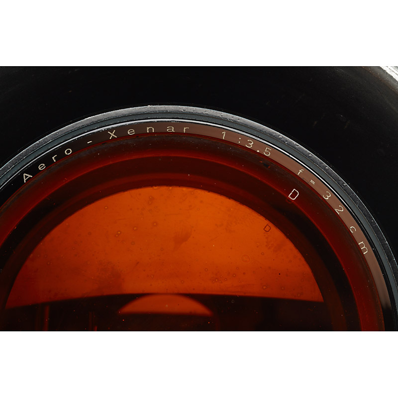 very rare aerial lens in grey painted housing, aperture 3,5-11, original orange filter engraved 'Aero-Xenar 1:3.5 f=32cm Hersteller Kqc Nr.67747 Bauart kqc', total height: 33.5cm, rear screw mount diameter c.10cm, cap