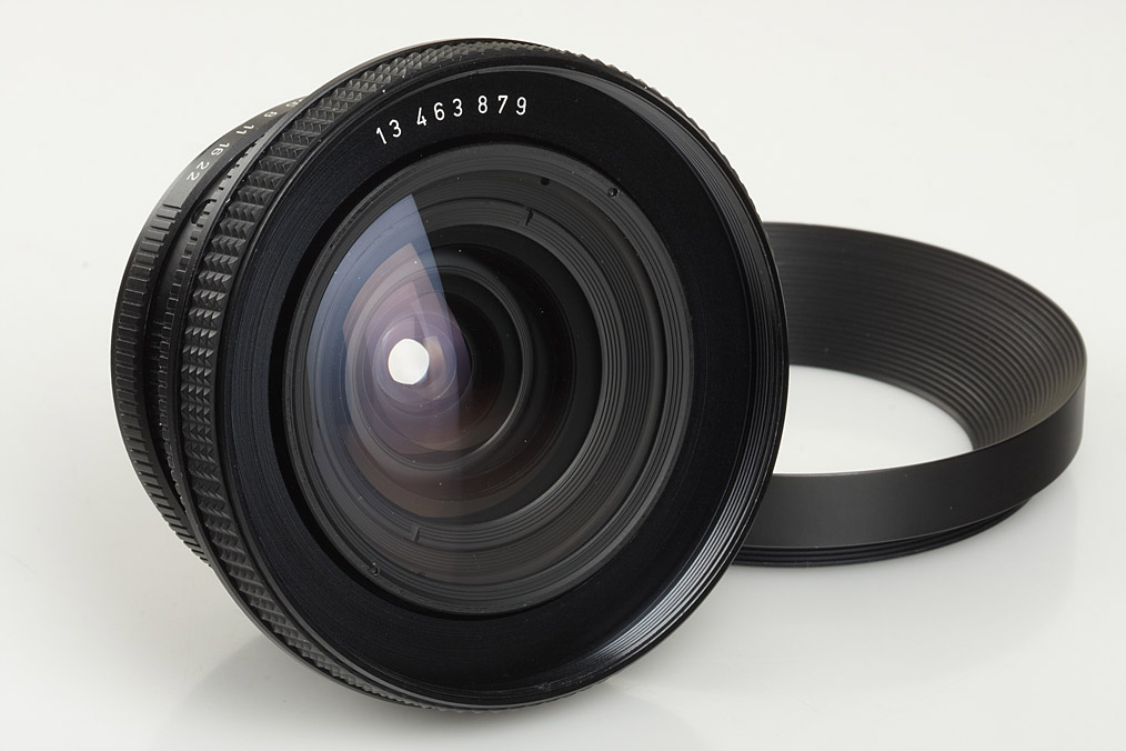 prototype for the later Leica R 21mm Super-Angulon, in M42 screw mount, without type designation, the number is engraved underneath the screw-off hood, cap