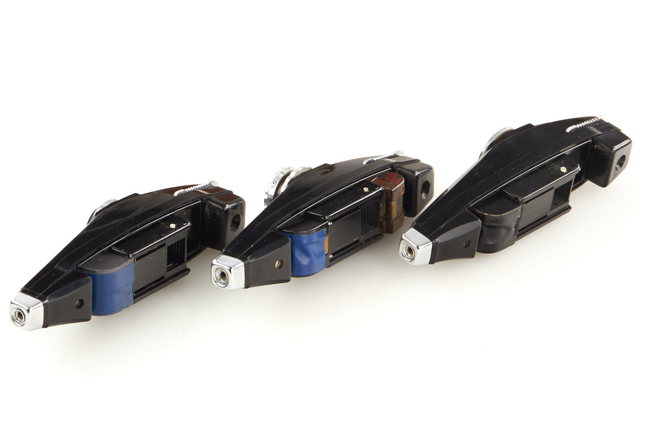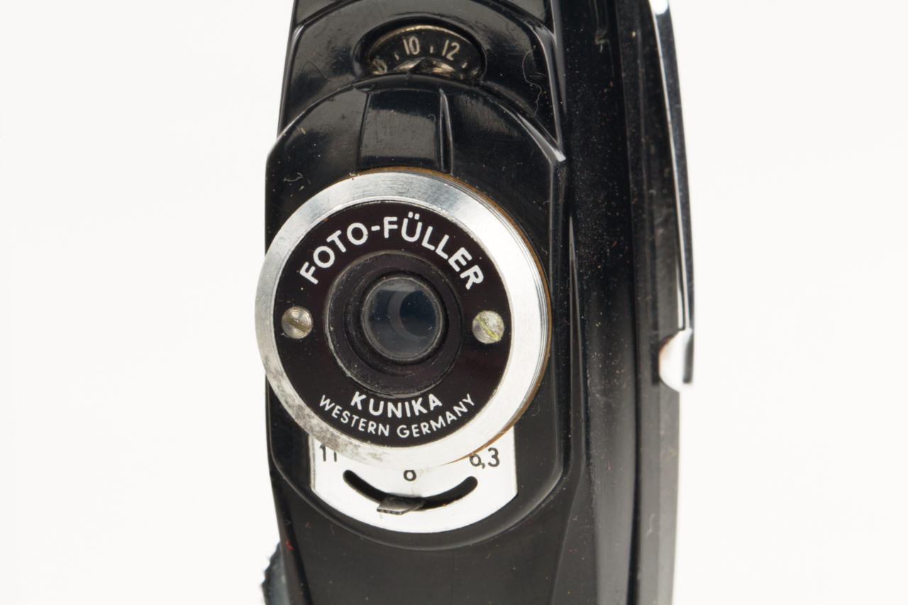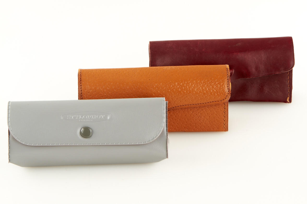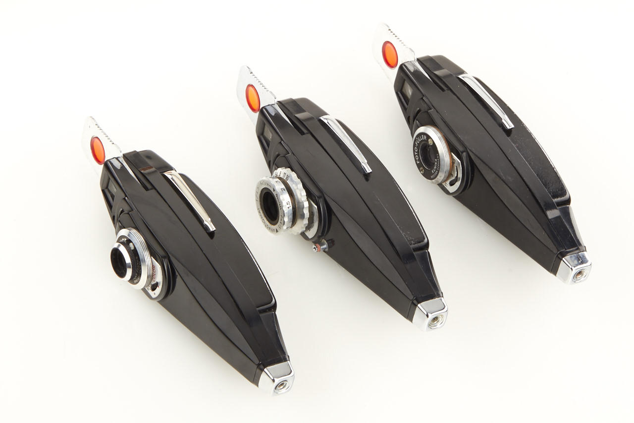 (1) Stylophot Standard in grey vinyl case, (2) Stylophot Luxe with Roussel lens in brown leather case, (3) quite rare German version Kunik Foto Füller in red leather case, all in very good condition