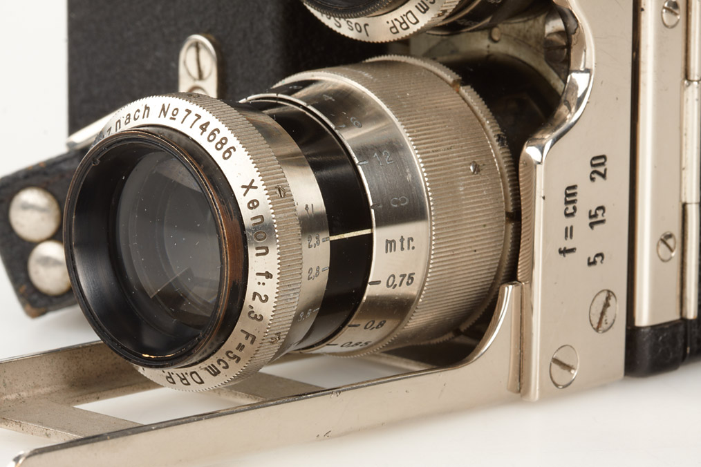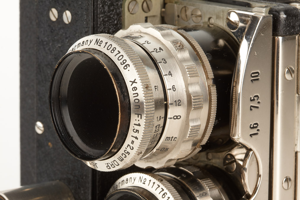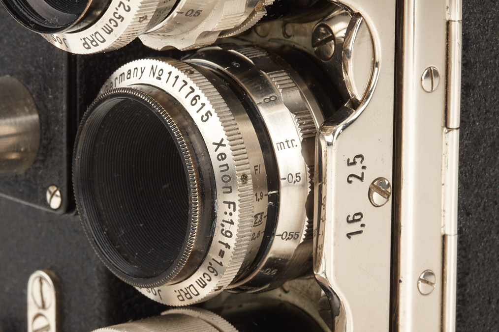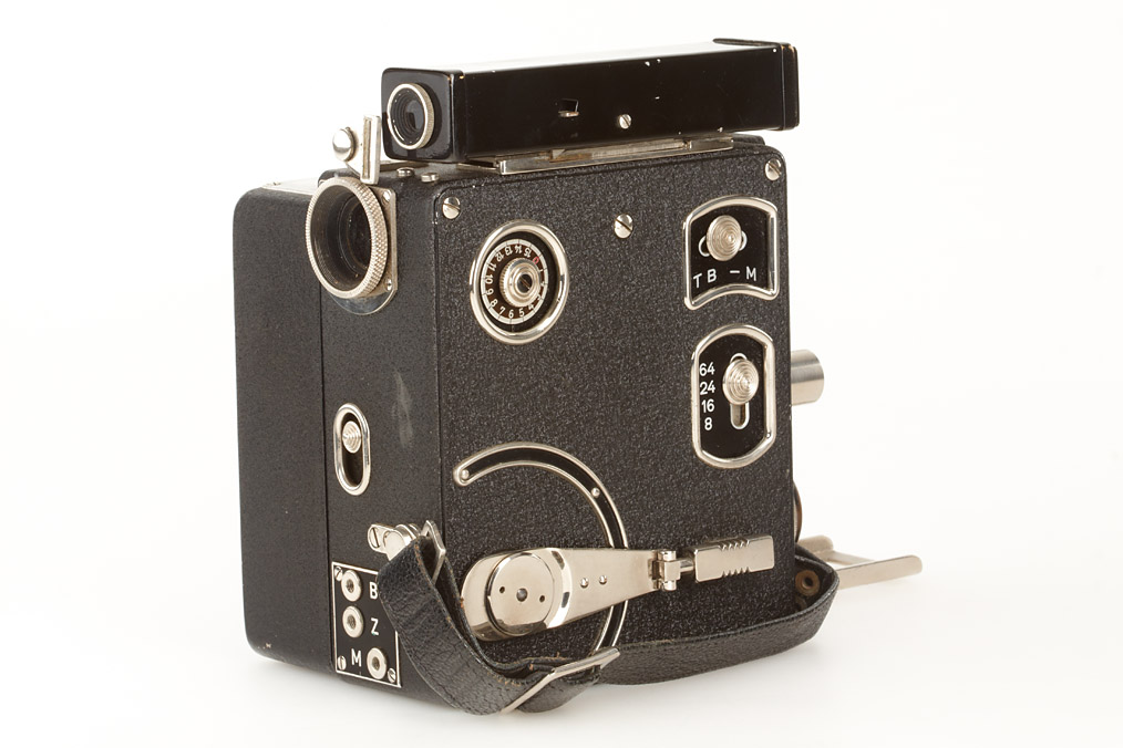 16mm spring motor camera in near mint condition with 4 matching black/nickel Schneider lenses: Xenon 1.9/1.6cm no.1177615, Xenon 1.5/2.5cm no.1087096, Xenon 2.3/5cm no.774686, Tele-Xenar 3.8/10cm no.1074319, two hoods, caps, all in fitted outfit case