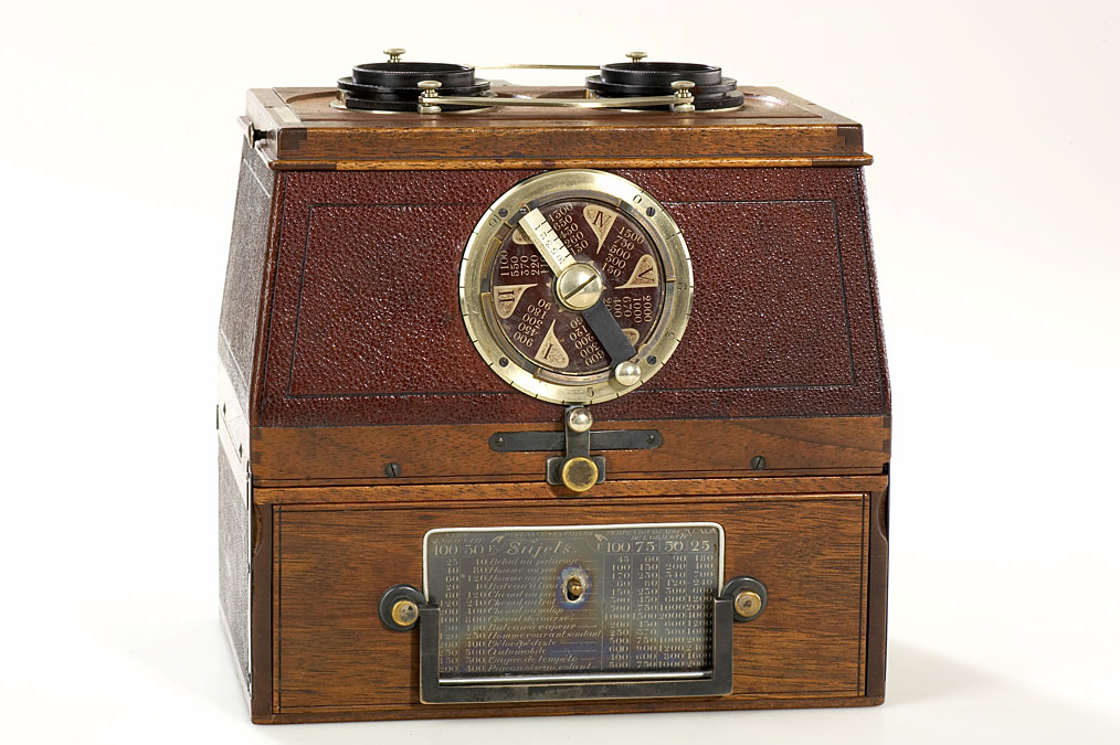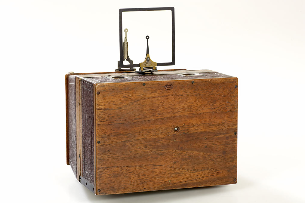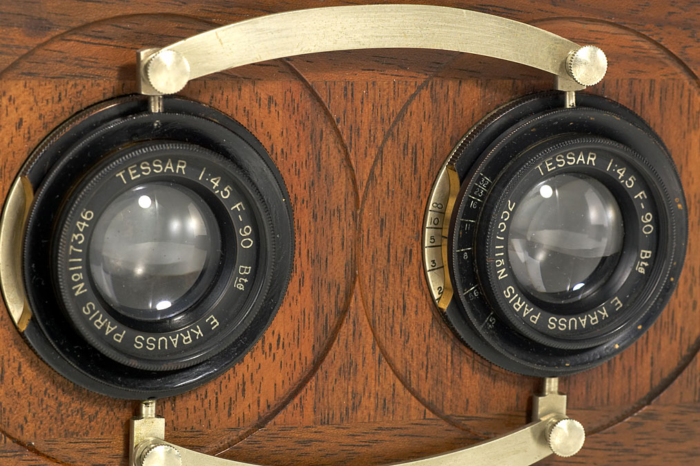 6x13cm, very rare jumelle styled stereo version with a pair of E.Krauss Tessar 4.5/90mm lenses nos. 17346/352, plate film magazine for 12 plates engraved 4-21, focal plane shutter to 1/2000s, in fine and fully original condition, matching leather case