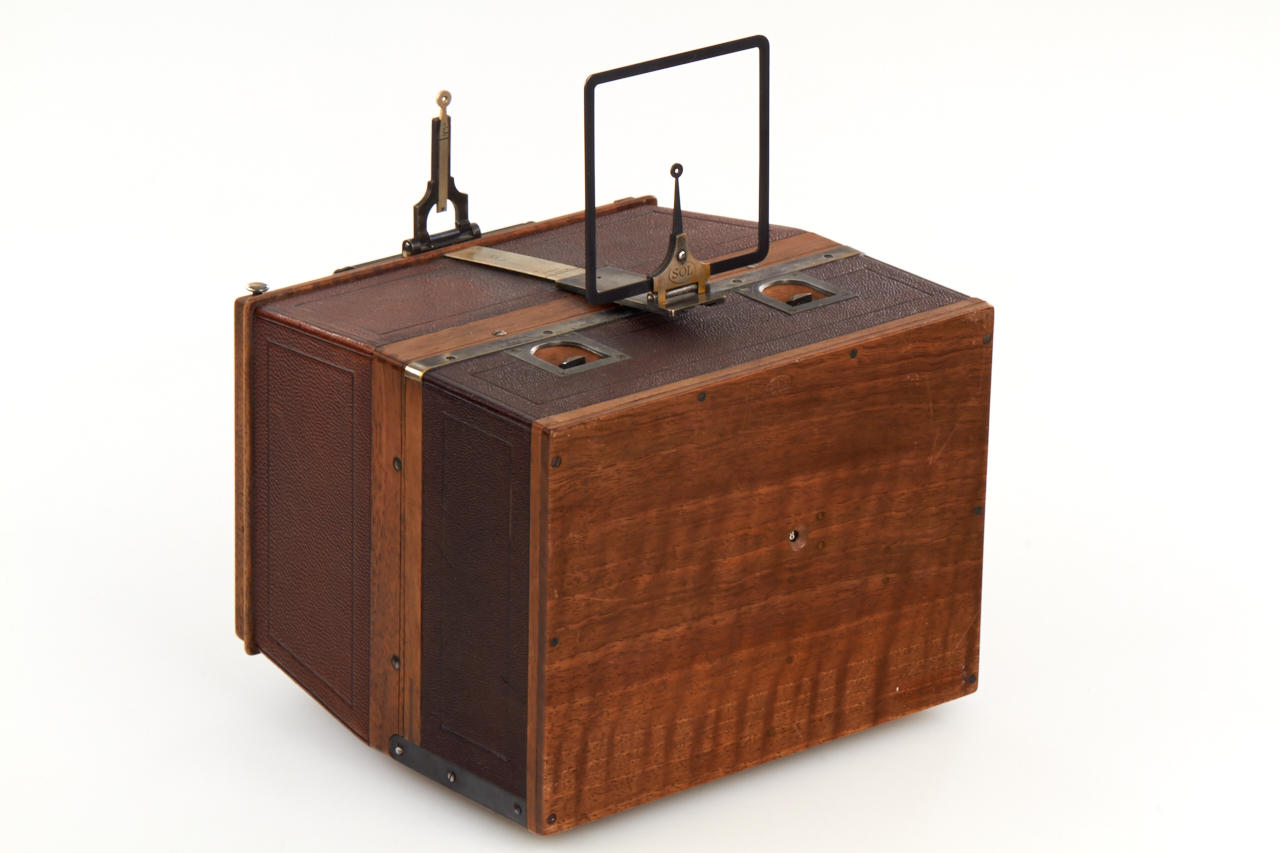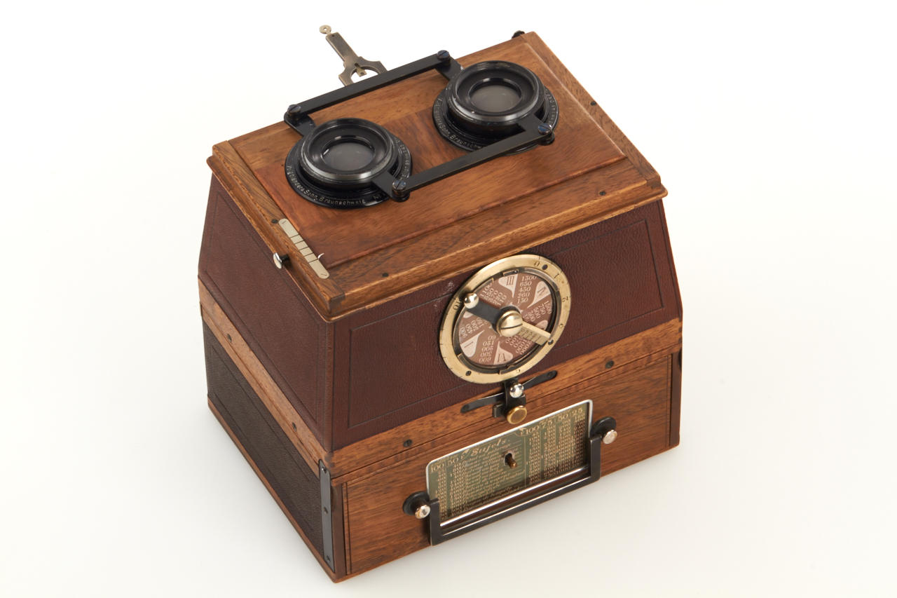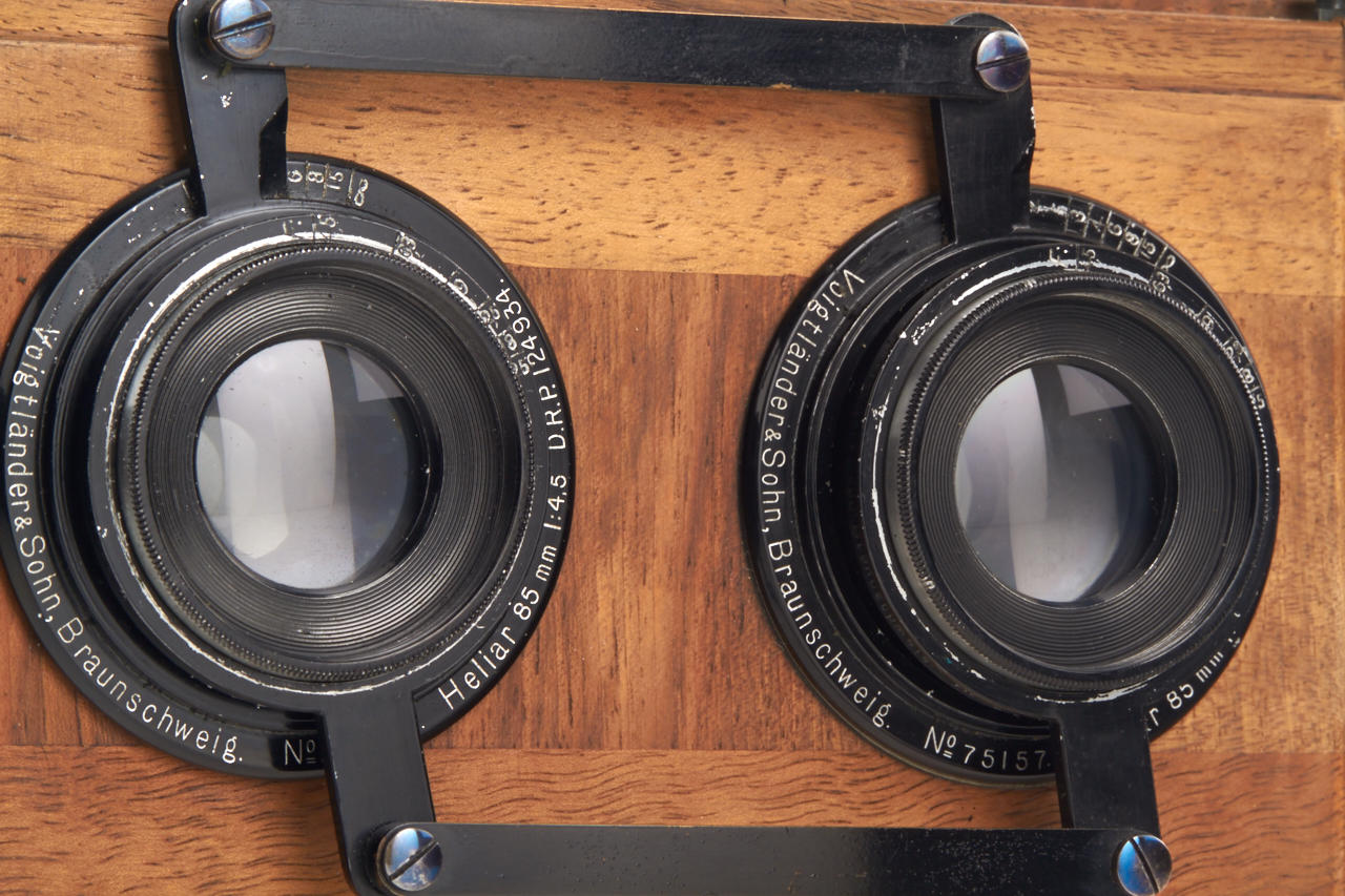 6x13cm, very rare jumelle styled stereo version with a pair of Voigtländer Heliar 4.5/85mm lenses nos.75157/58 (with lens caps), two matching plate film magazines for 12 plates engraved 4-32, focal plane shutter to 1/2000s, in fantastic and fully original condition