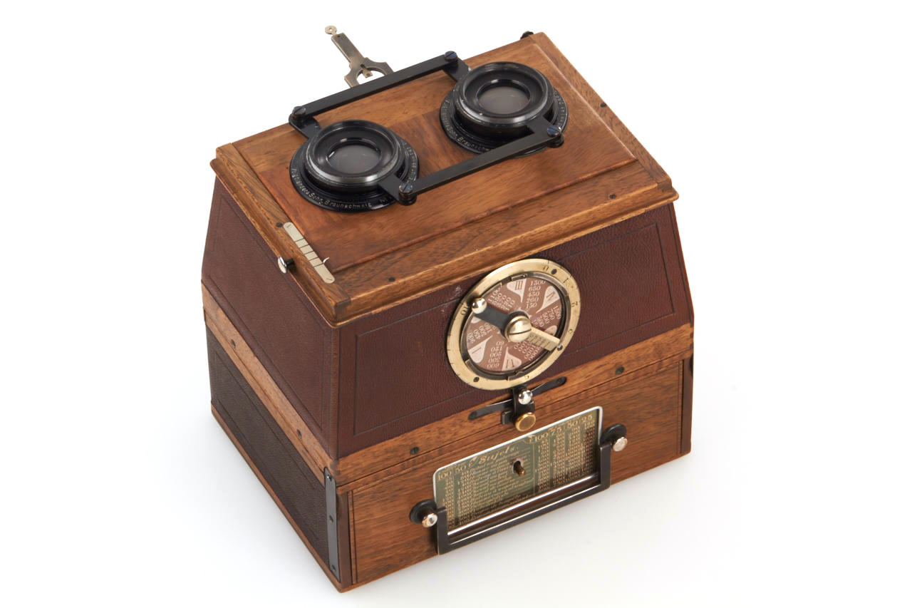 6x13cm, very rare jumelle styled stereo version with a pair of Voigtländer Heliar 4.5/85mm lenses nos.75157/58 (with lens caps), two matching plate film magazines for 12 plates engraved 4-32, focal plane shutter to 1/2000s, in fantastic and fully original condition