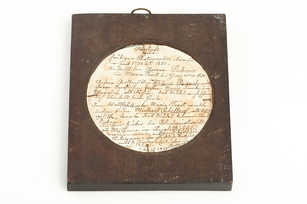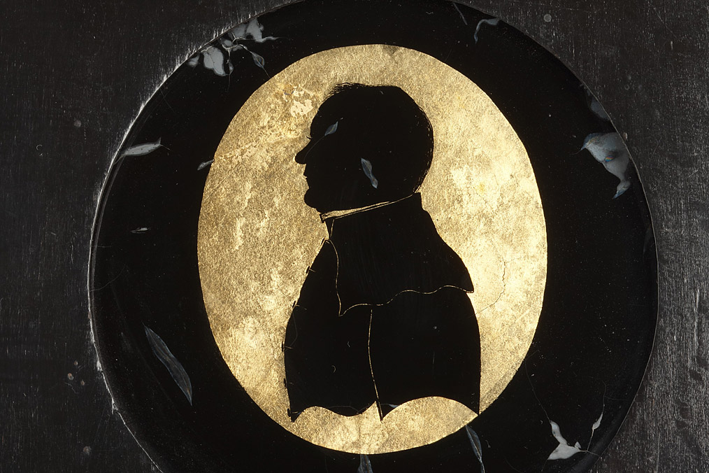 Exceptional Silhouette depicting an Austrian pastor. The technique originally was invented by the French finance minister Etienne de Silhouette approx.1760. Prior to the advent of photography, Silhouette profiles cut from black card were a cheap and very popular way of recording a person's appearance. The technique used in the offered image is unusual, since it is a reverse glass painting with a gold plated background. According to the handwritten inscription on the back, the Silhouette shows Pastor Lechner and was made 1834 in Maria Trost, a well known place of pilgrimage in Styria near Graz, Austria. The oval portrait is fitted in a black lacquer wooden frame (size 14x17.5cm).