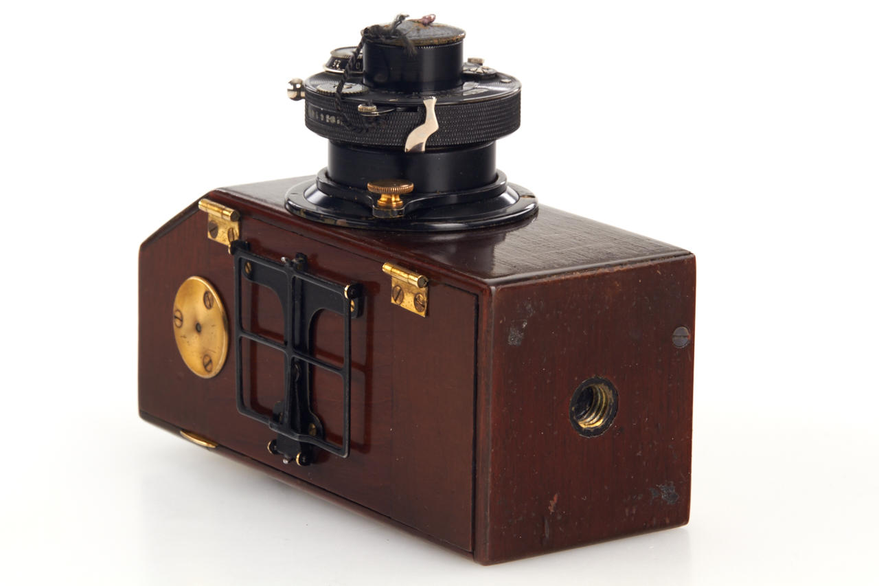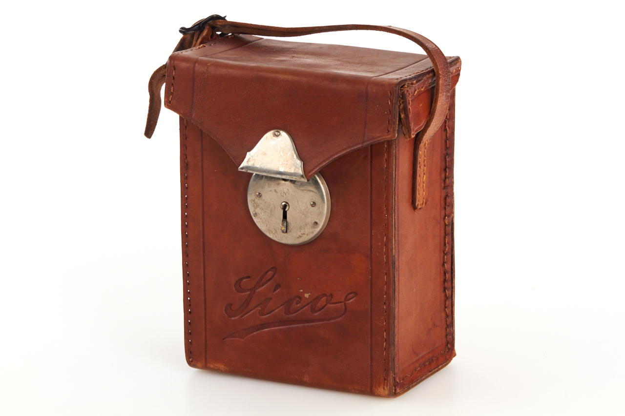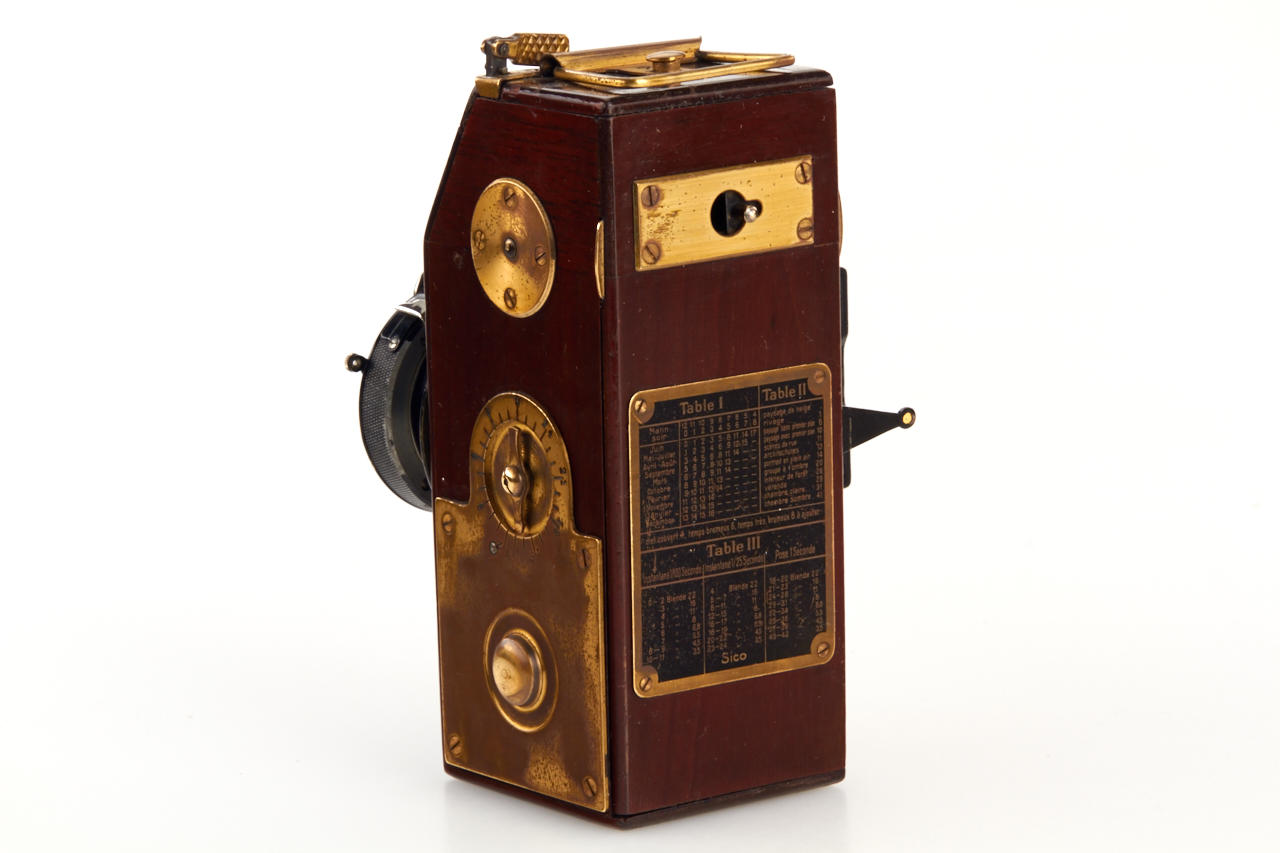 Very rare Swiss wooden camera (Leica forerunner) with brass trim for 25 30x40mm exposures on un-perforated 35mm film, 3.5/6cm Rüo Anastigmat no.6563 with hinged cap in Dial set Compur shutter, both original spools, frame finder, in very good original condition, with brown Sico leather case, six unexposed SICO positive films in original packing stamped 'DEVELOP BEFORE 10.5.26', the original black SICO projector with all accessories and the SICO outfit card box for the complete outfit - sensational discovery in Museum quality