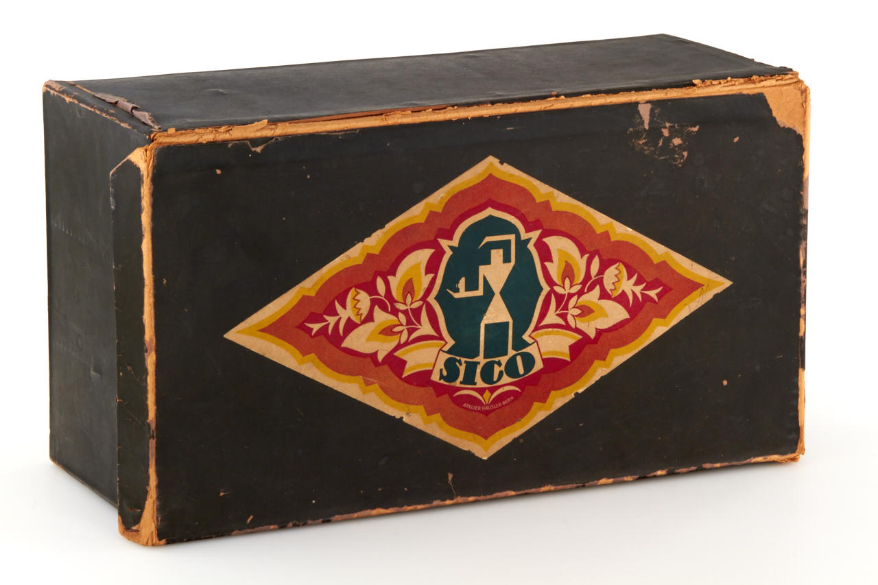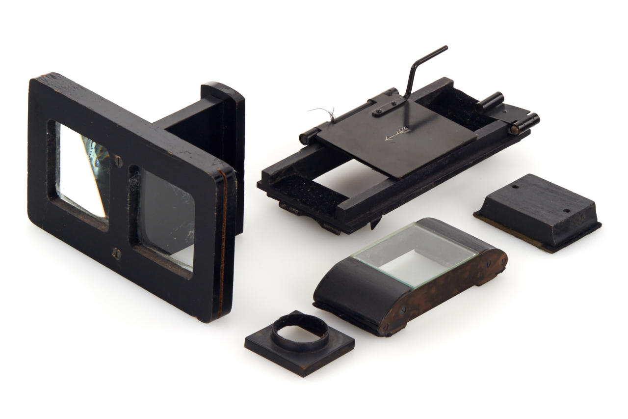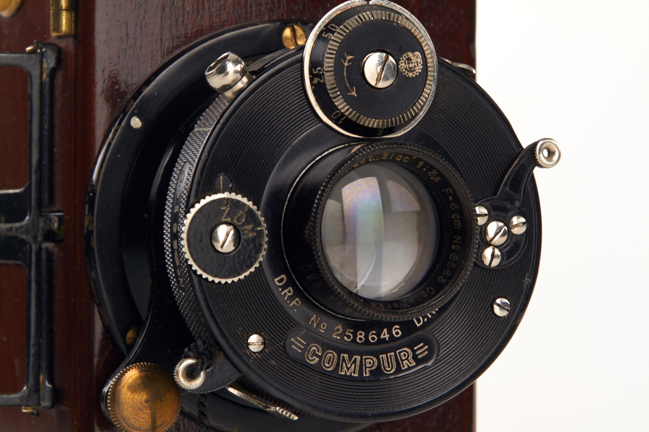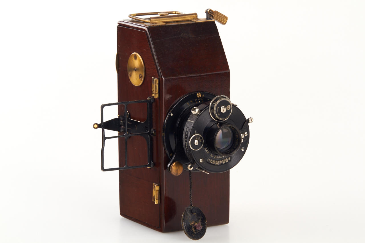 Very rare Swiss wooden camera (Leica forerunner) with brass trim for 25 30x40mm exposures on un-perforated 35mm film, 3.5/6cm Rüo Anastigmat no.6563 with hinged cap in Dial set Compur shutter, both original spools, frame finder, in very good original condition, with brown Sico leather case, six unexposed SICO positive films in original packing stamped 'DEVELOP BEFORE 10.5.26', the original black SICO projector with all accessories and the SICO outfit card box for the complete outfit - sensational discovery in Museum quality