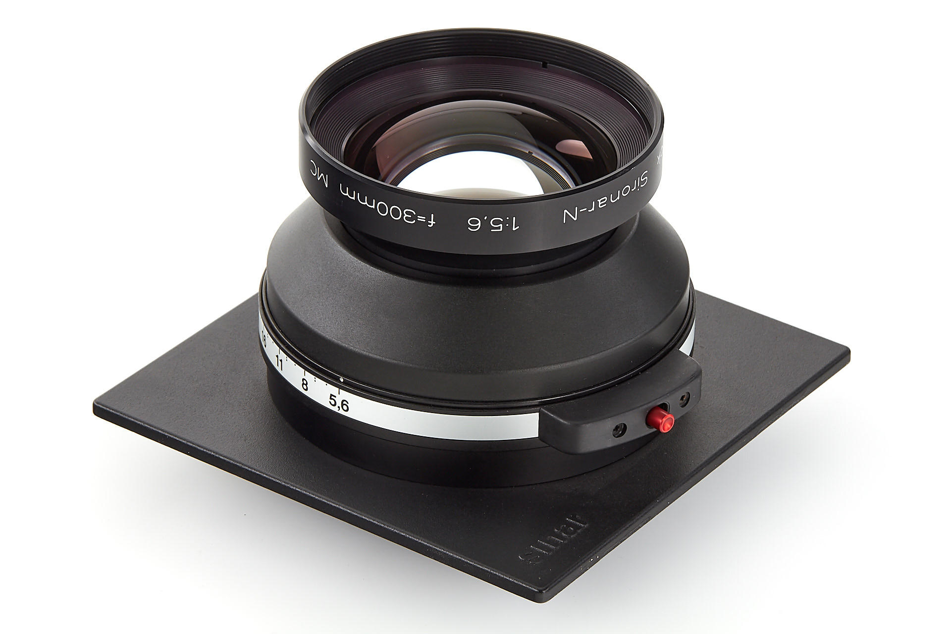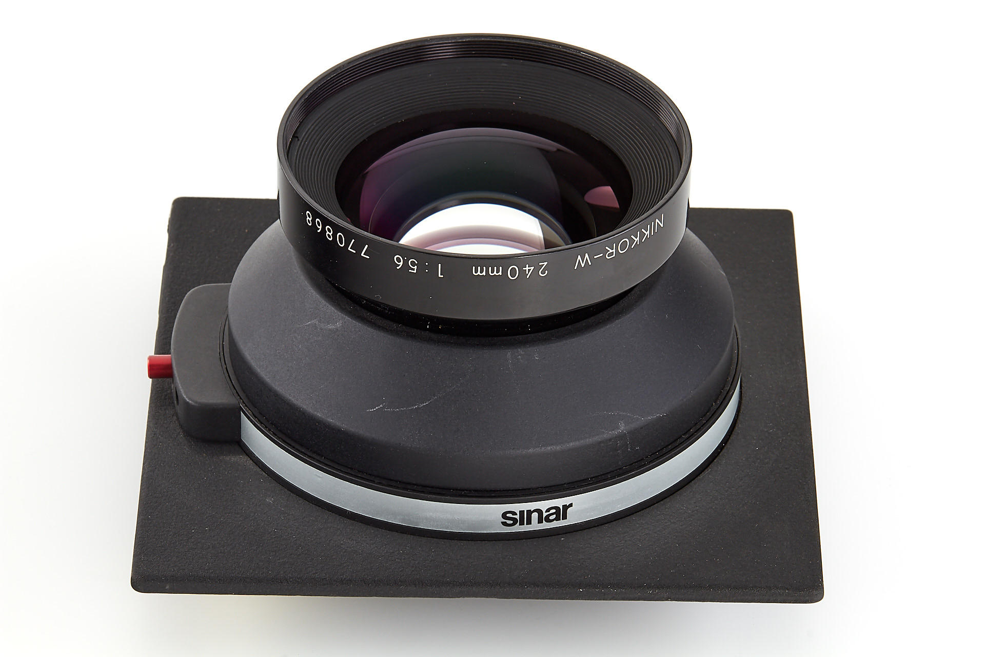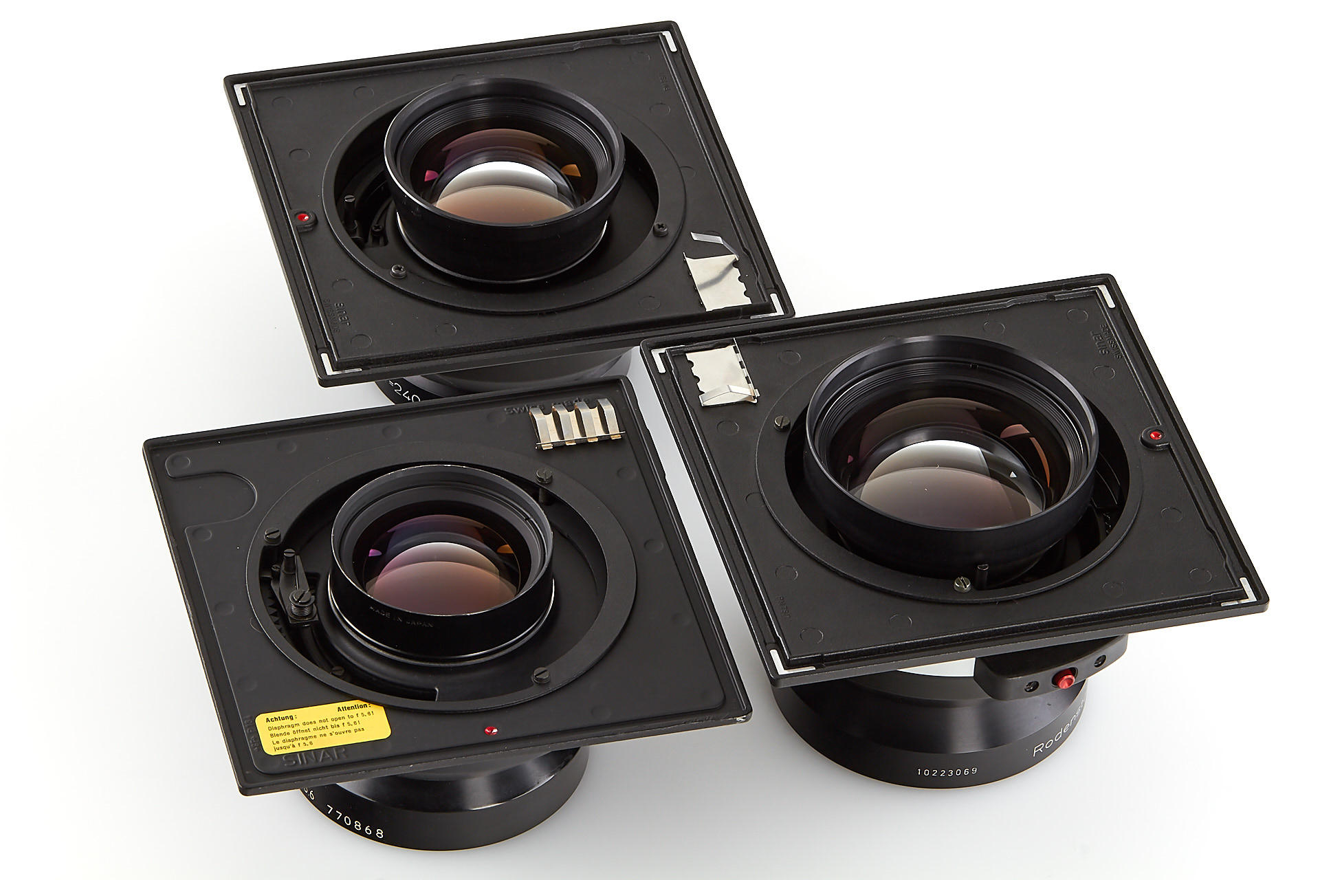 lot of three lenses on Sinar lens boards, for behind-the-lens shutter: (1) Nikkor-W 5.6/240mm no.770868, (2) Sironar-N MC 5.6/240mm no.10086589, (3) Sironar-N MC 5.6/300mm no.10223069, all in excellent condition with good optics